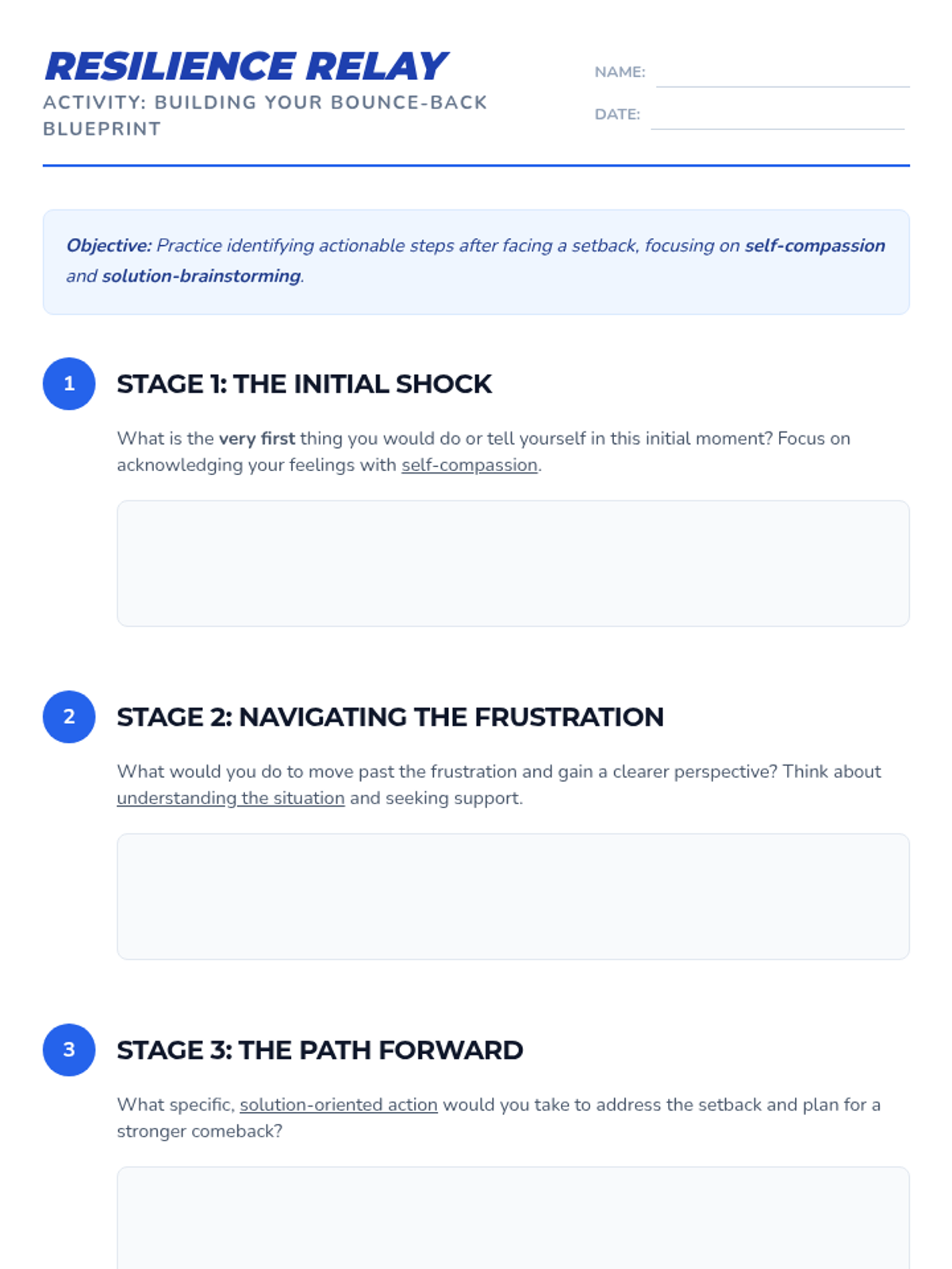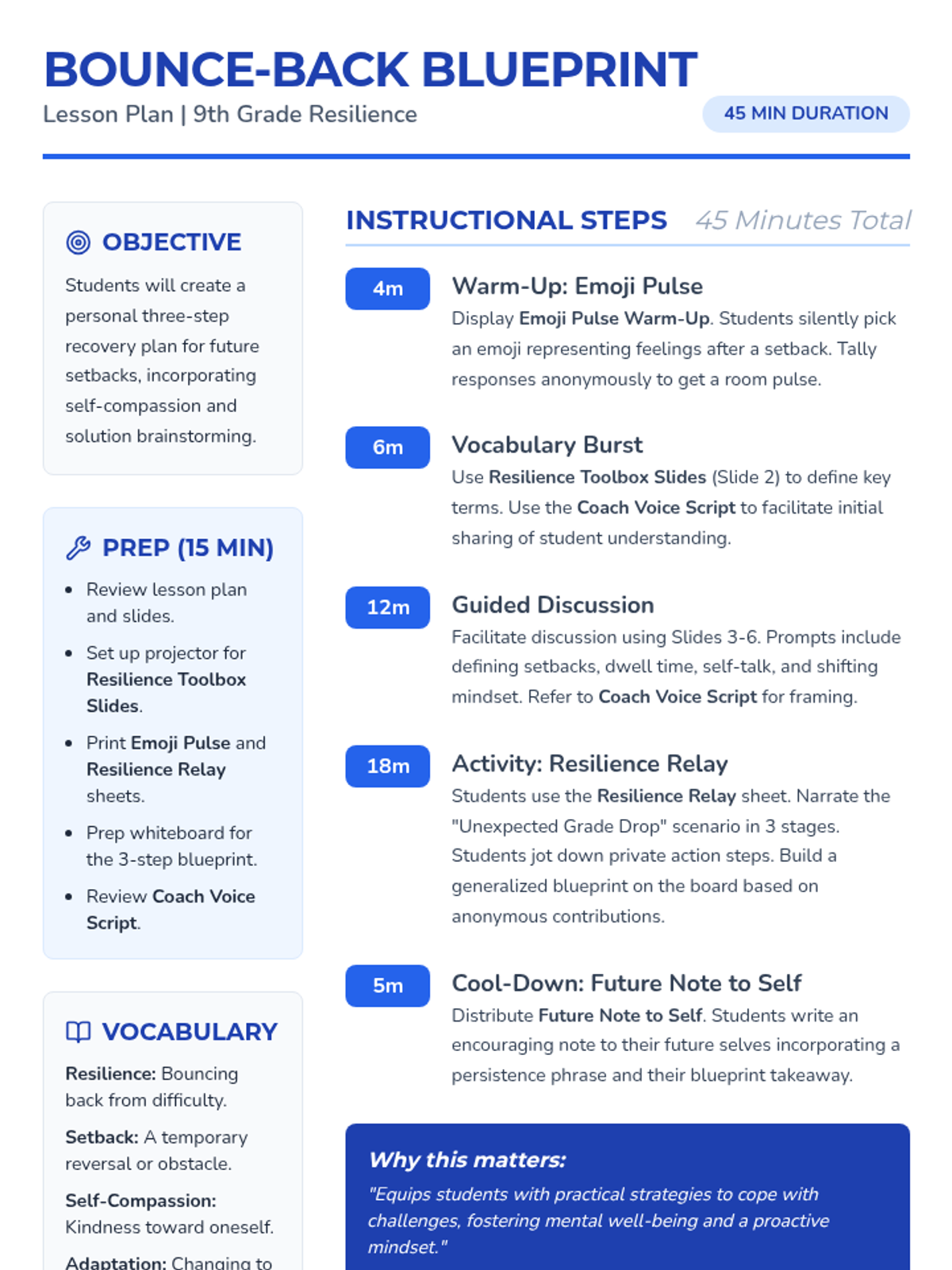 A 45-minute resilience-building lesson for 9th graders where they develop a personal three-step recovery plan using self-compassion and solution-oriented brainstorming.