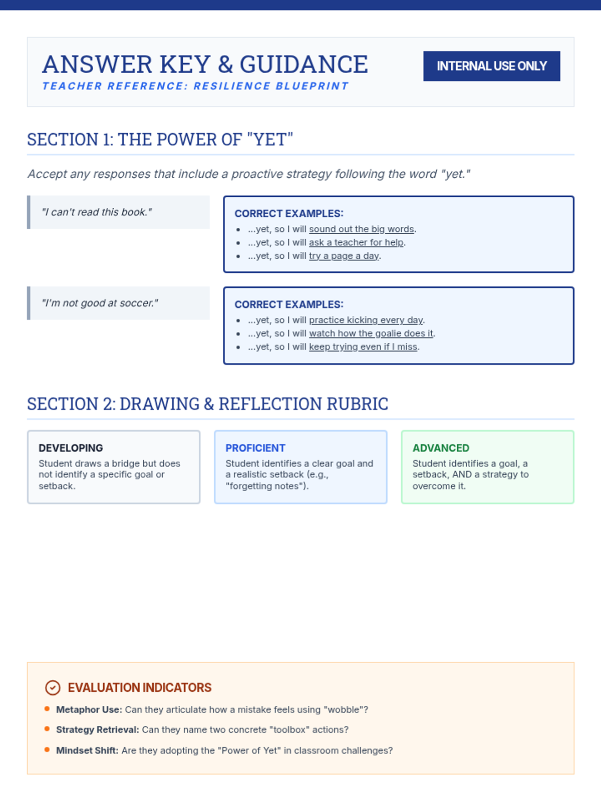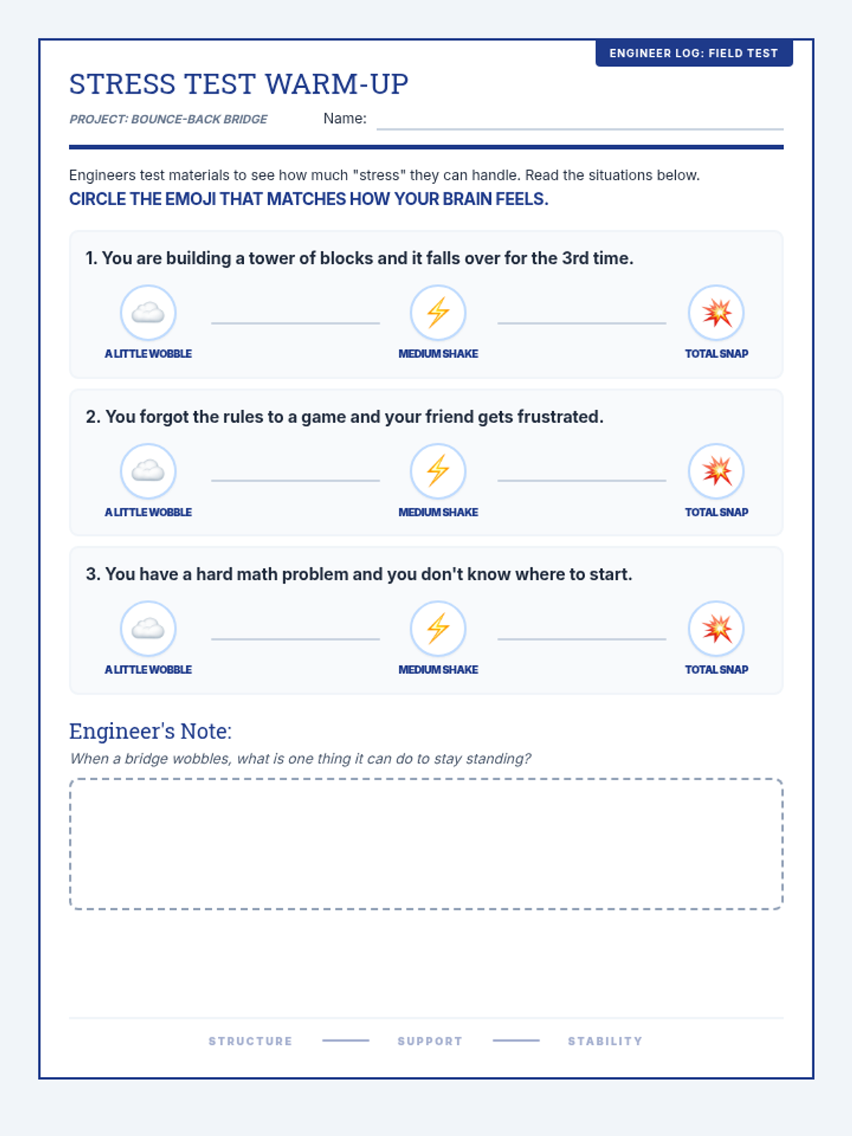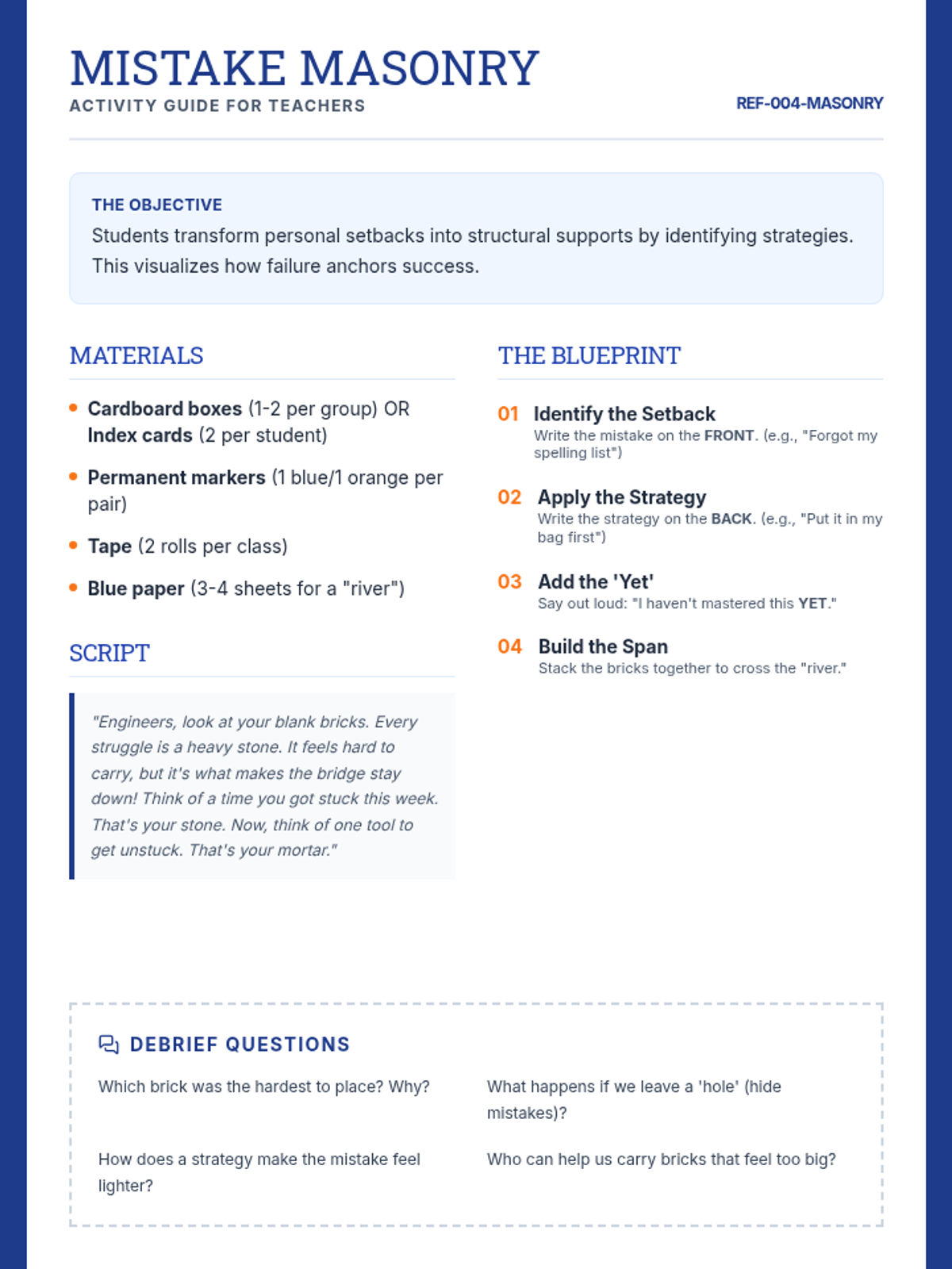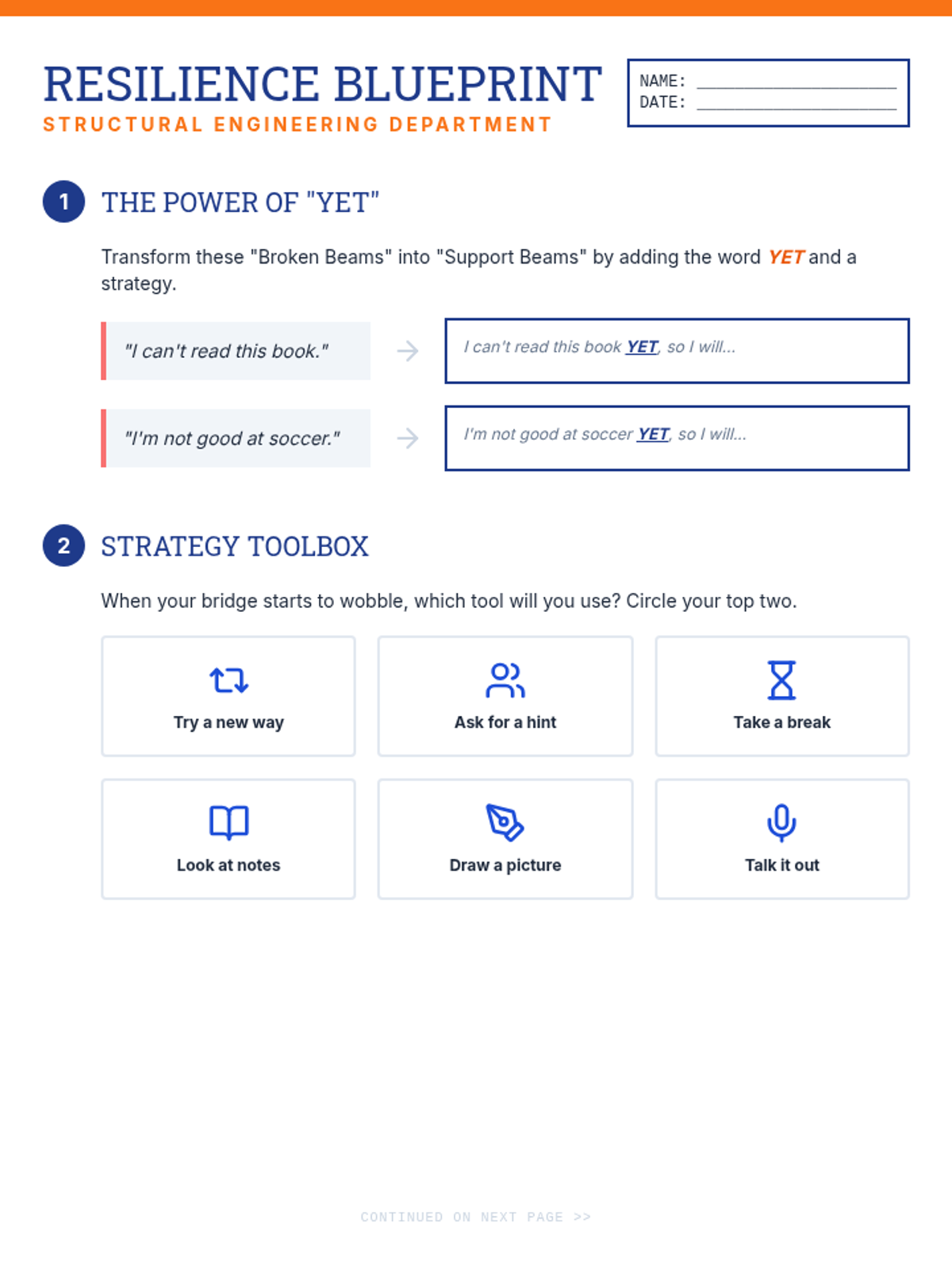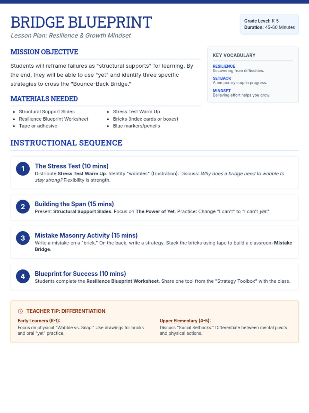 A resilience-building lesson for K-5 students using an engineering metaphor to reframe mistakes as structural supports for a 'Bounce-Back Bridge.' Students learn to use 'yet' and identify actionable strategies for overcoming setbacks.