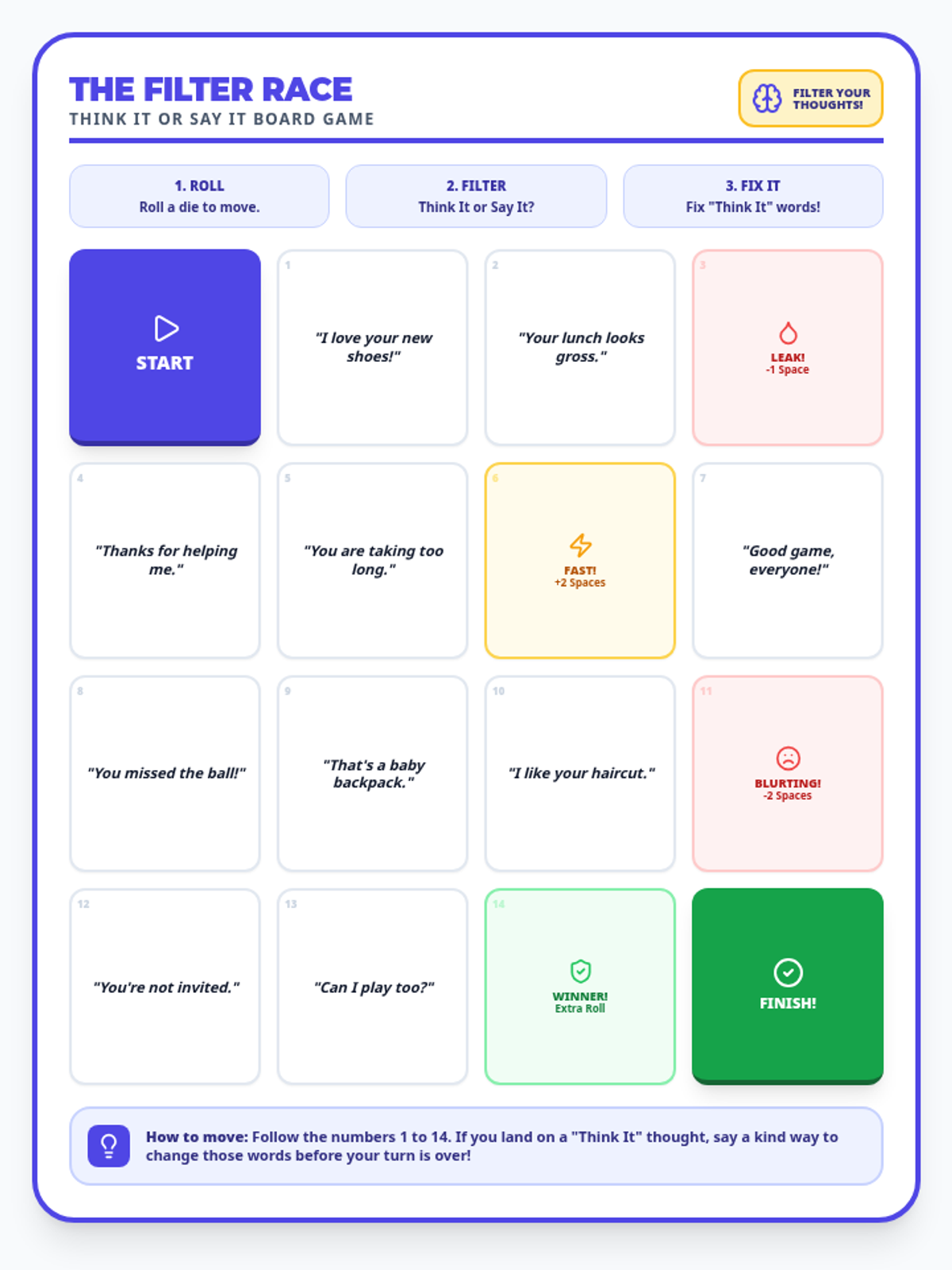 A quick-fire 20-minute lesson teaching students how to use their 'social filter' to distinguish between thoughts that should stay inside and words that are okay to say aloud.