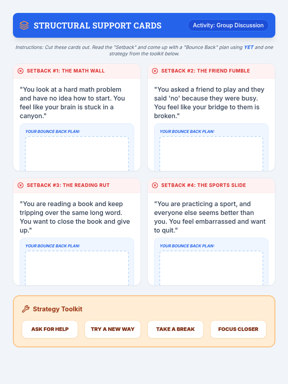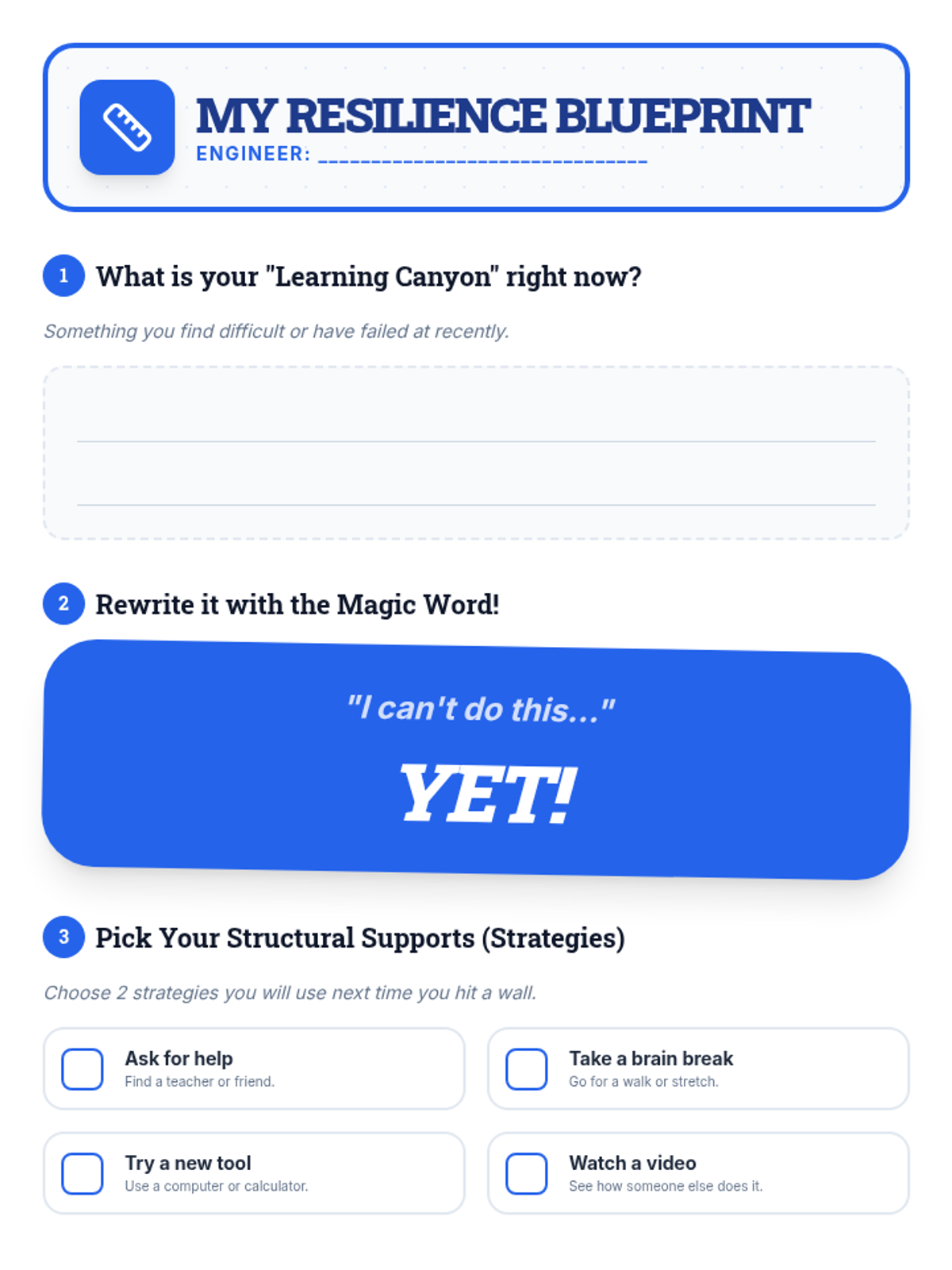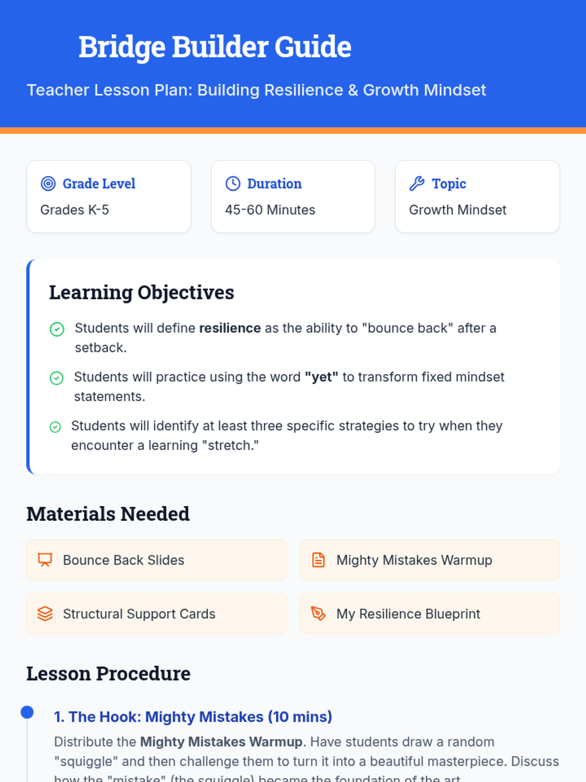 A social-emotional learning lesson for K-5 students focused on building resilience and a growth mindset using the metaphor of a bridge. Students learn that mistakes are structural supports and practice using the word 'yet' alongside specific recovery strategies.