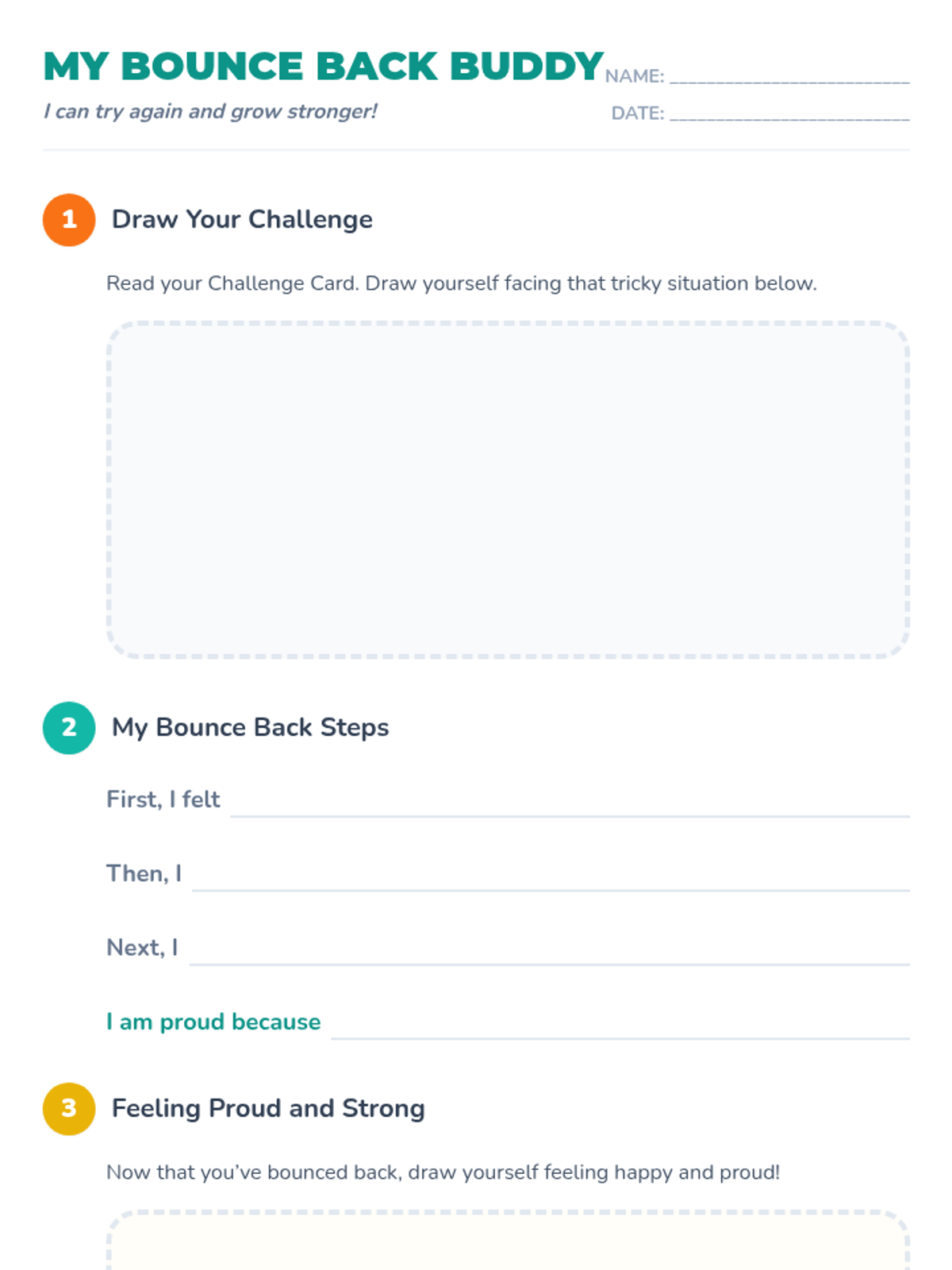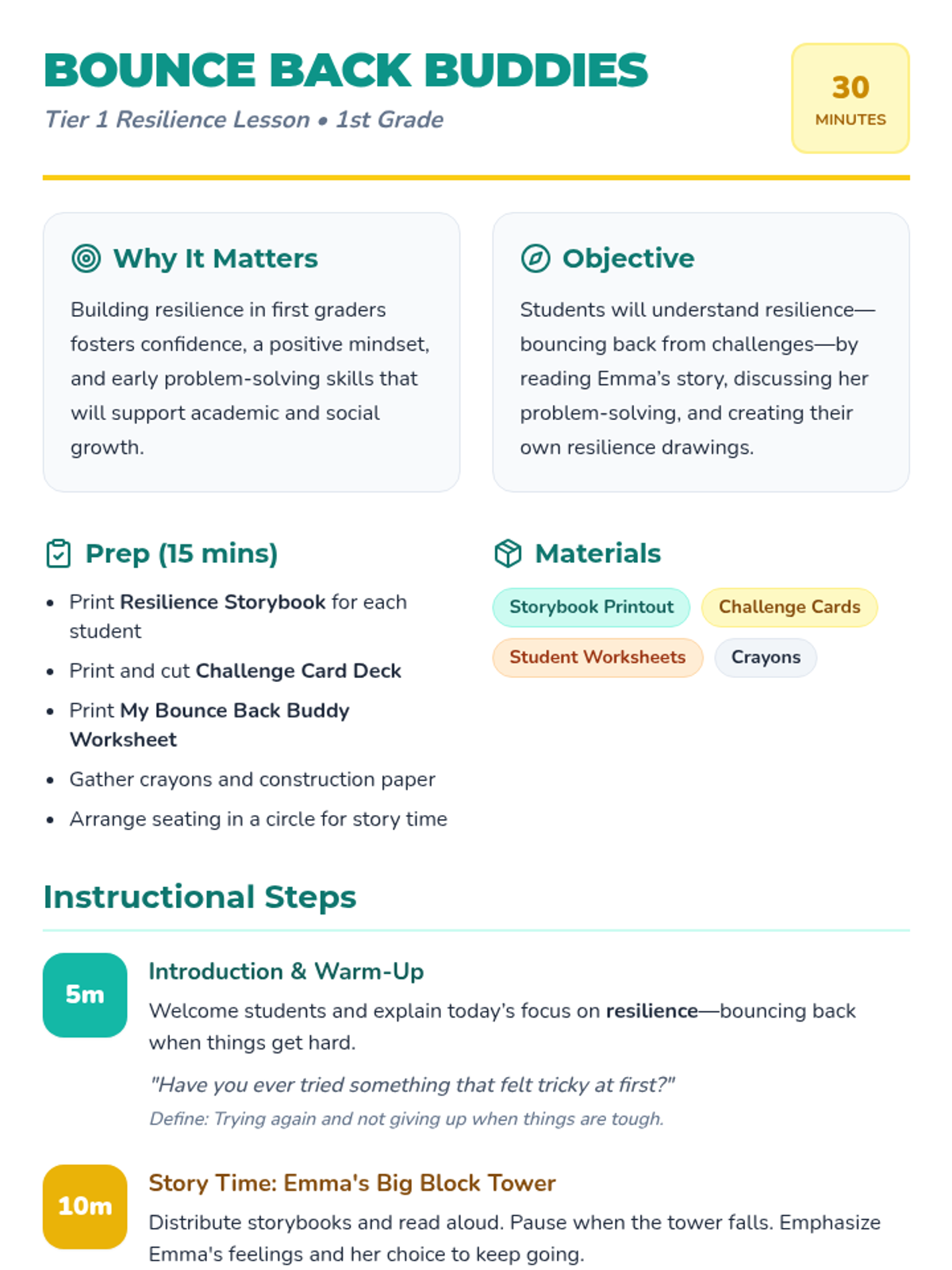 A 30-minute social-emotional learning lesson for 1st graders focused on defining and practicing resilience through storytelling and creative drawing. Students learn to 'bounce back' from small setbacks just like Emma the Elephant.