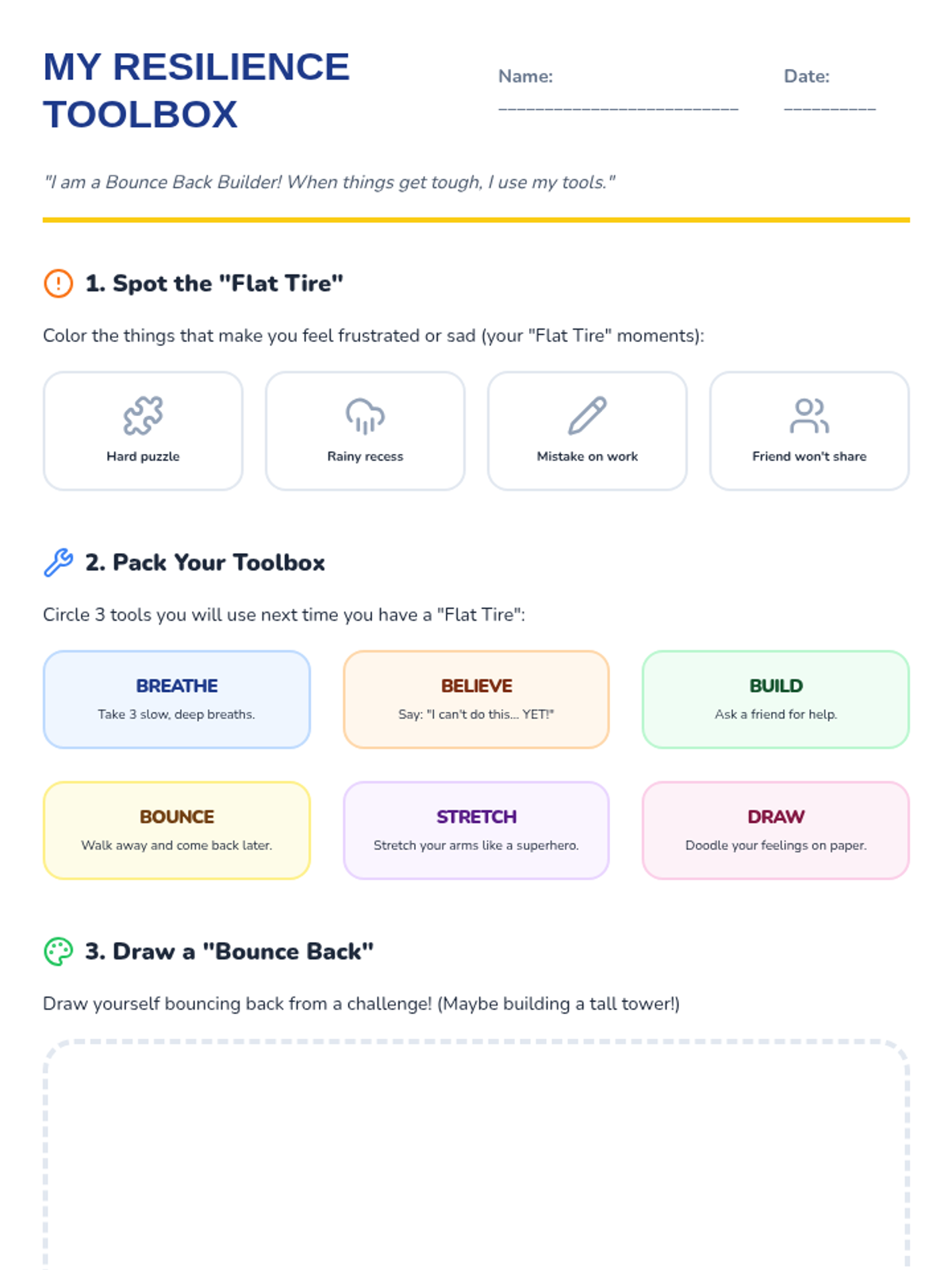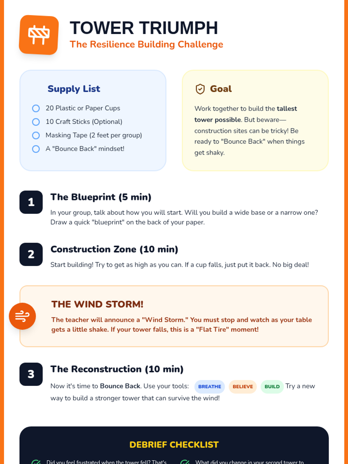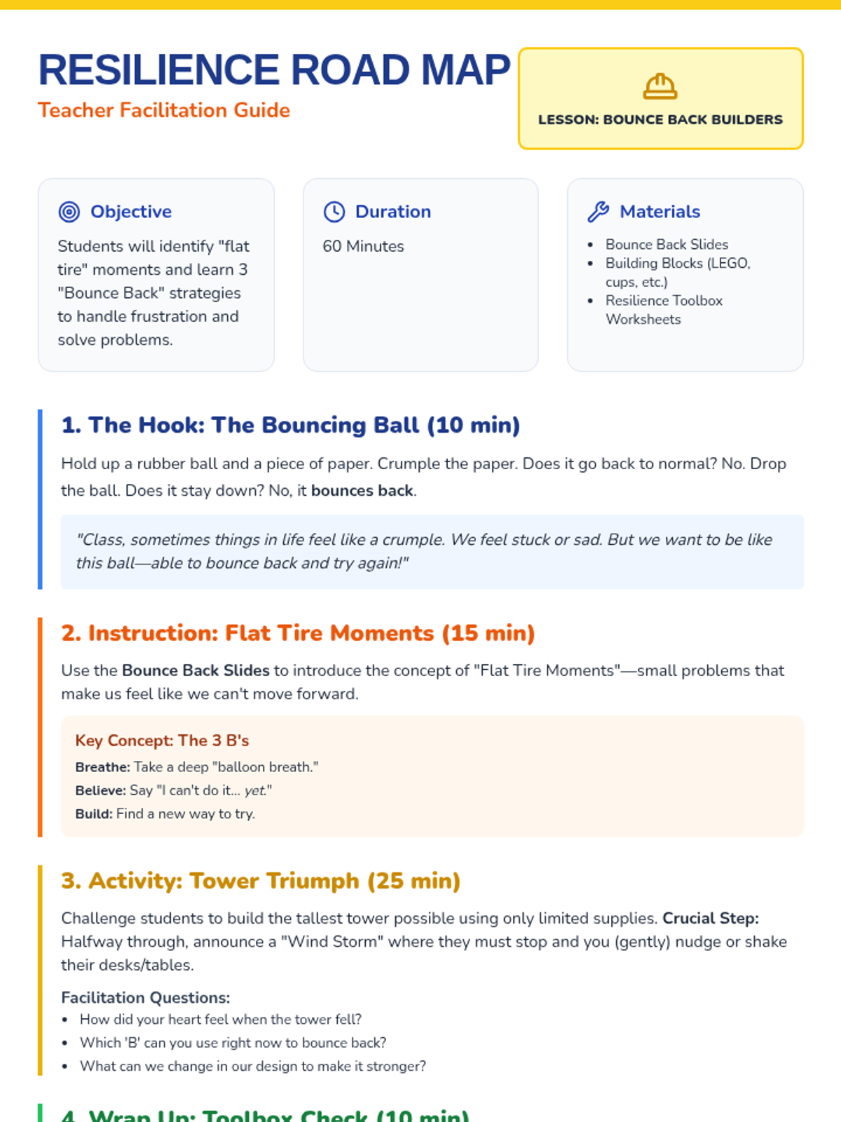 A comprehensive lesson for K-2 students focused on developing resilience and problem-solving through the 'Bounce Back' strategy and hands-on building challenges.