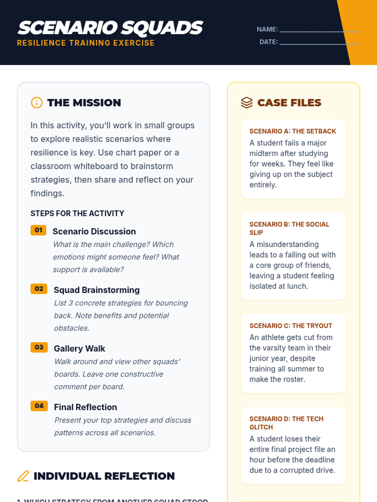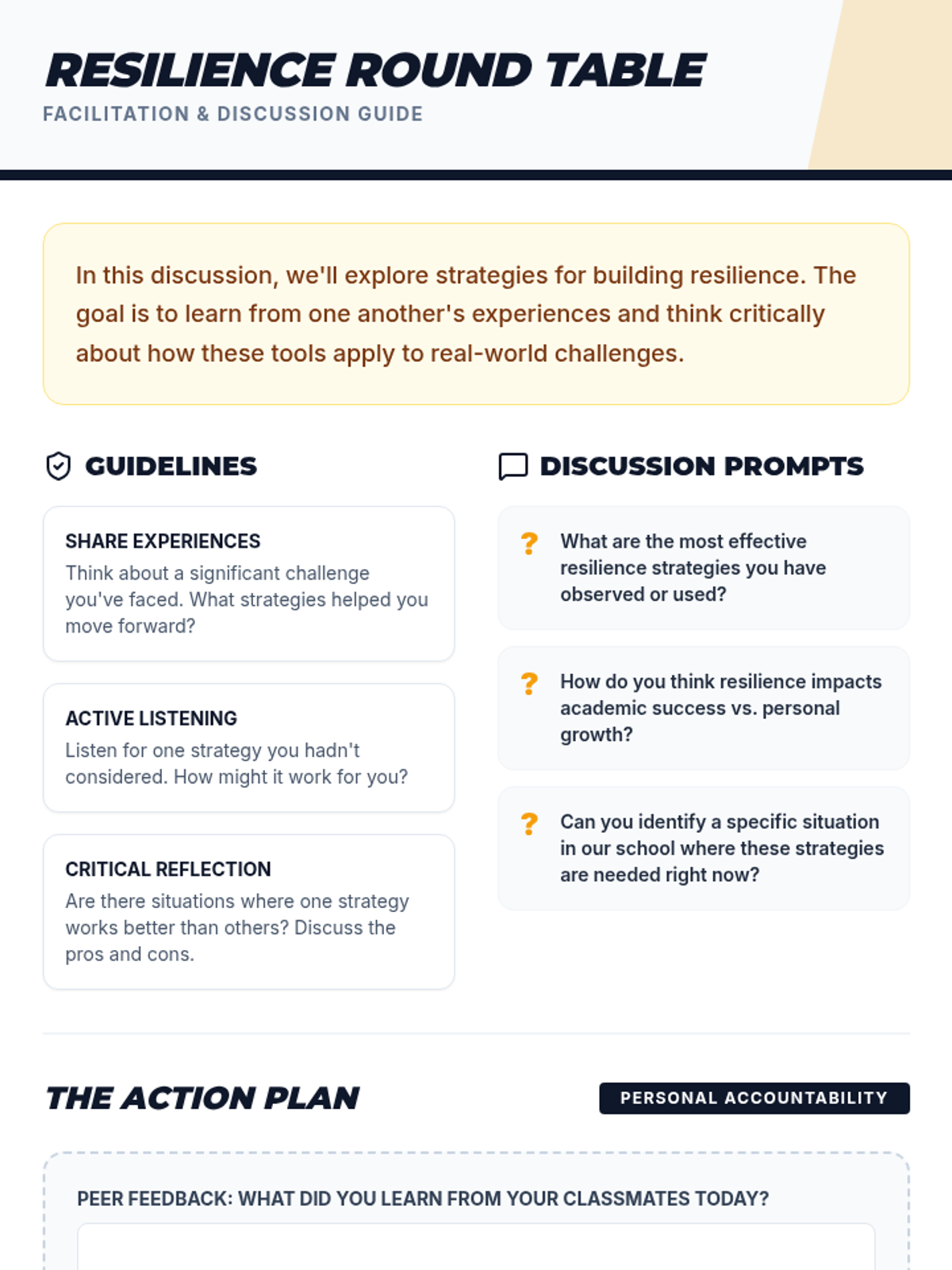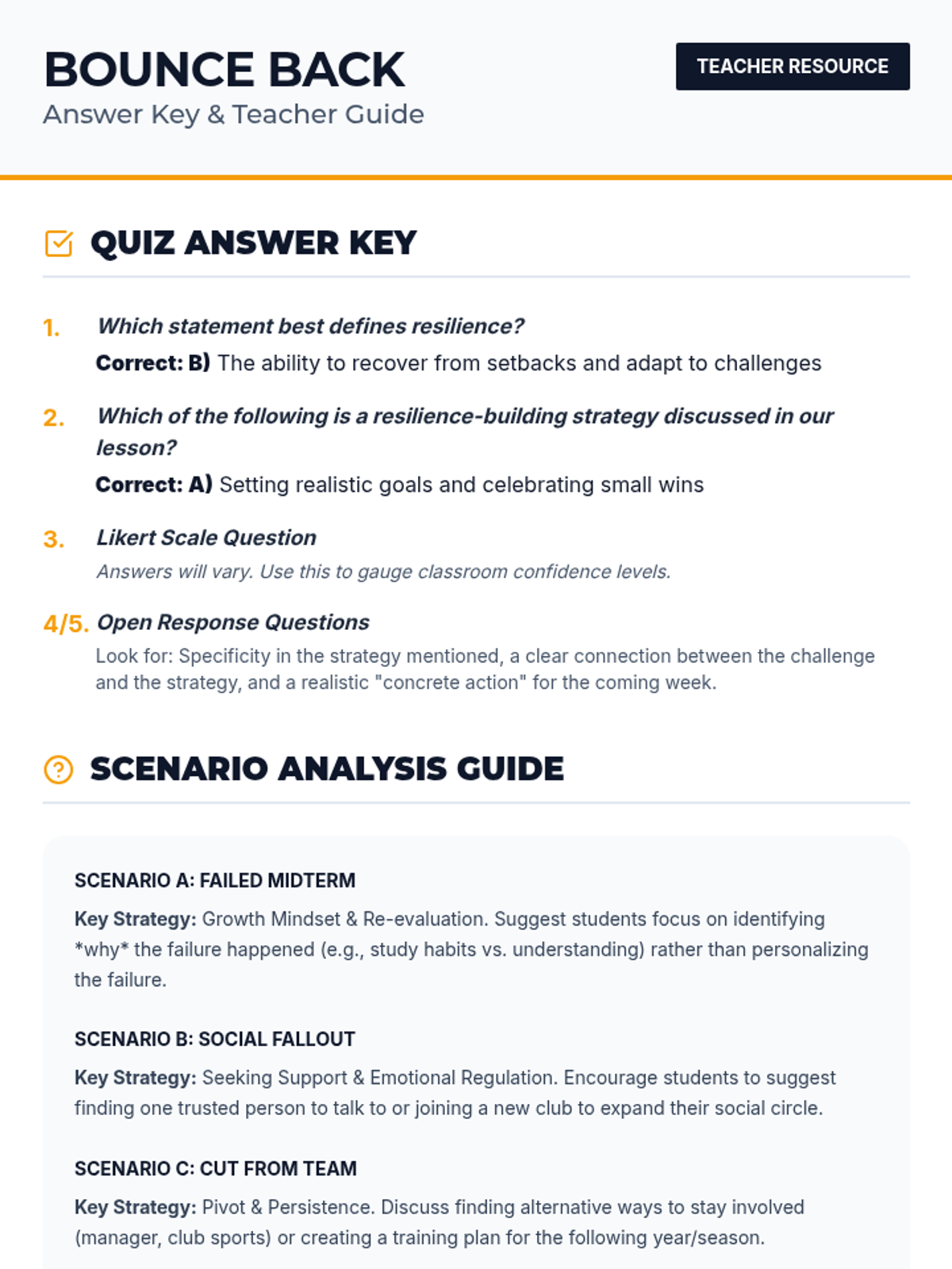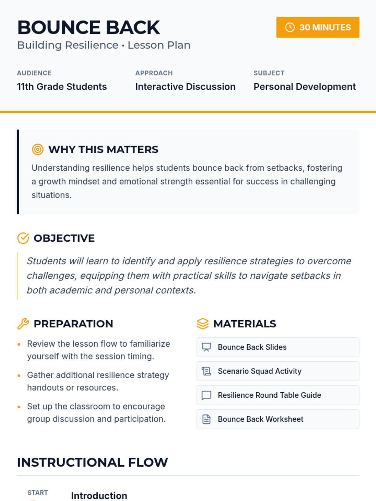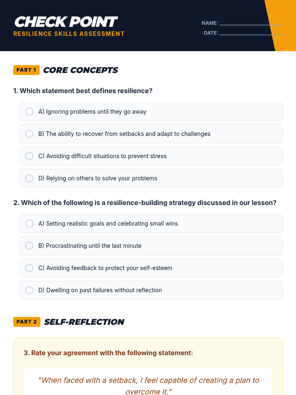 This interactive lesson on resilience is designed for 11th-grade students and focuses on developing the skills needed to bounce back from challenges and setbacks. Students will engage in activities and discussions that highlight the importance of resilience in both personal and academic life, empowering them to face future challenges with confidence.