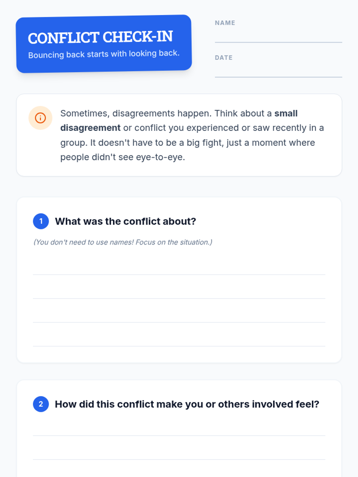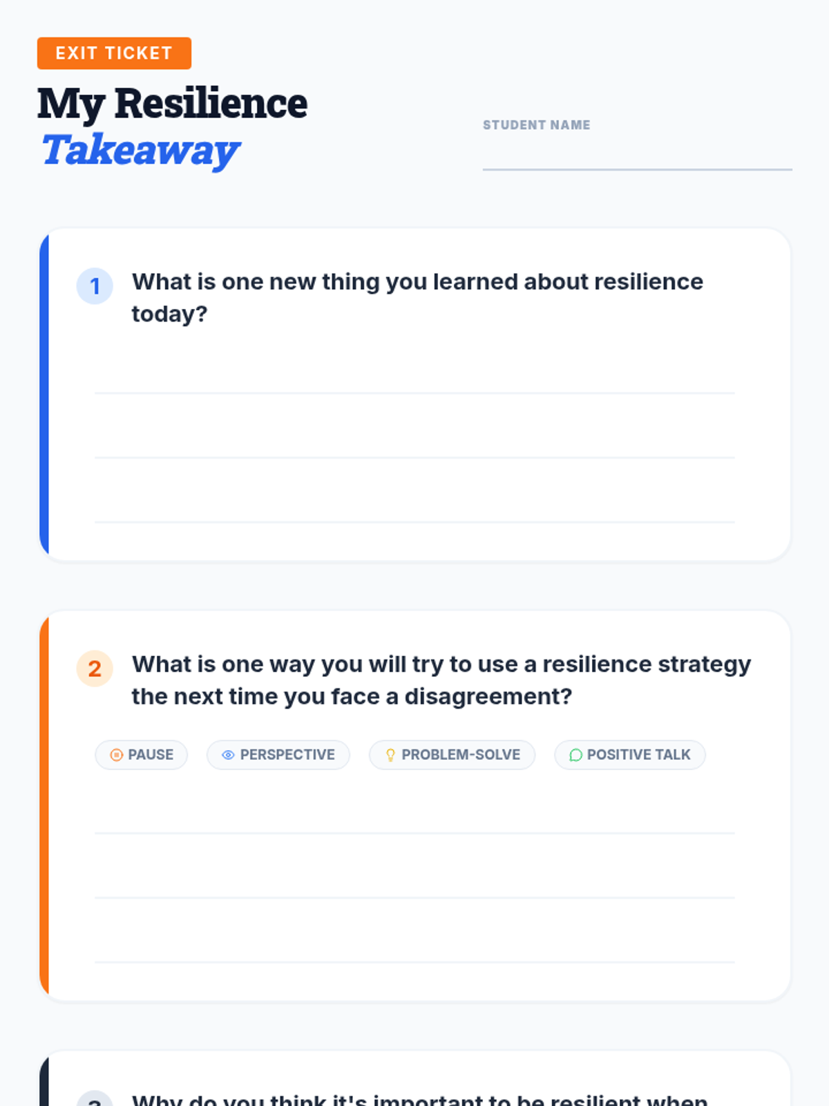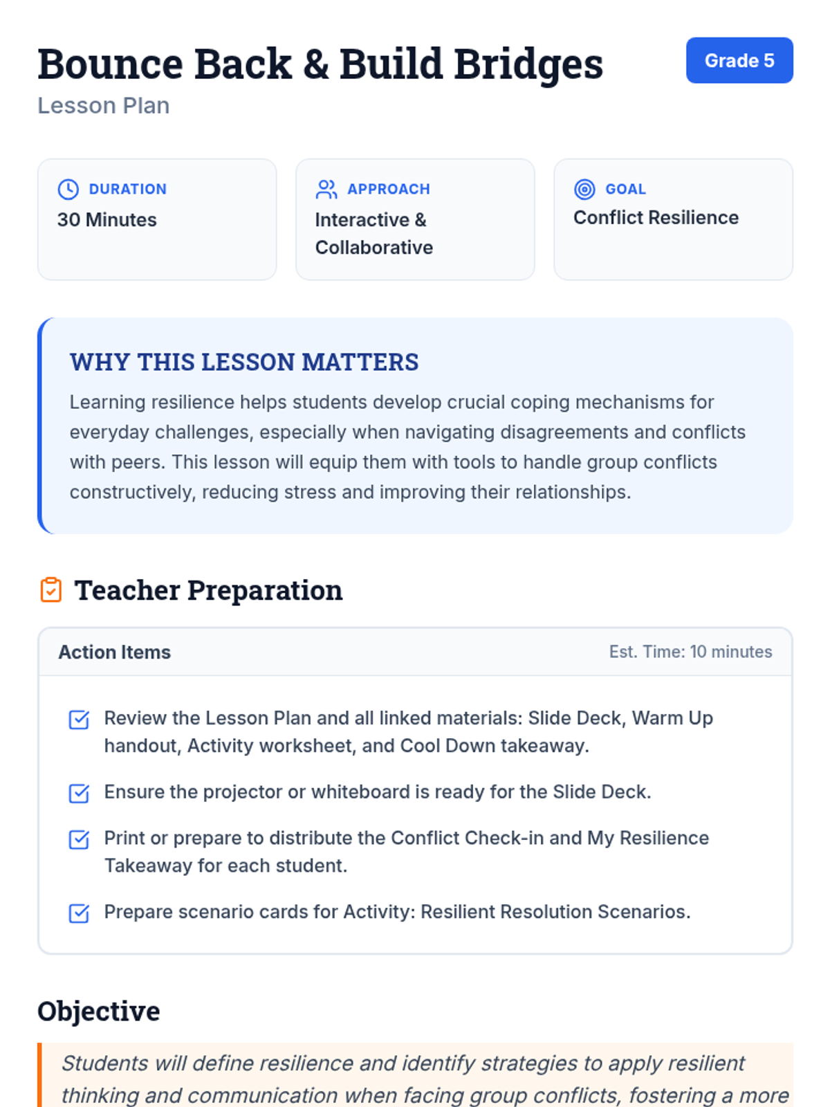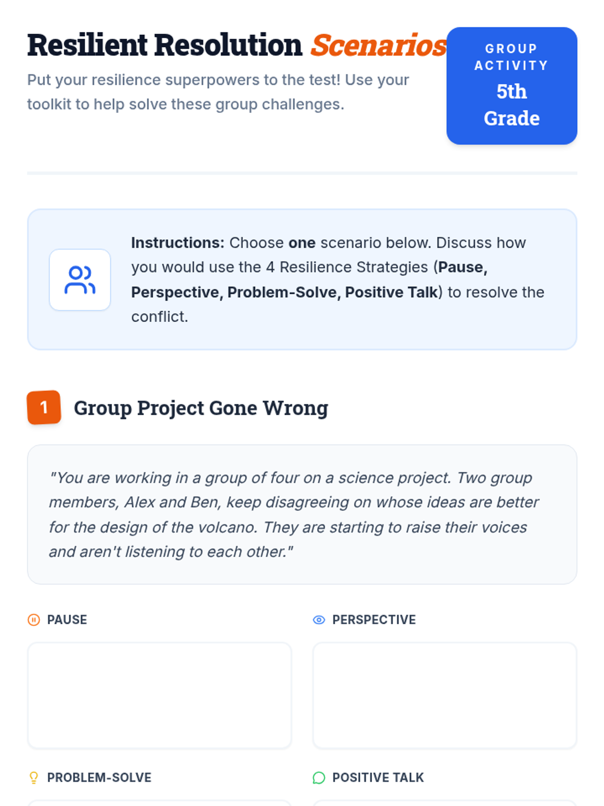 A 30-minute lesson for 5th graders focused on resilience and navigating group conflicts using four key strategies: Pause, Perspective, Problem-Solve, and Positive Talk.
