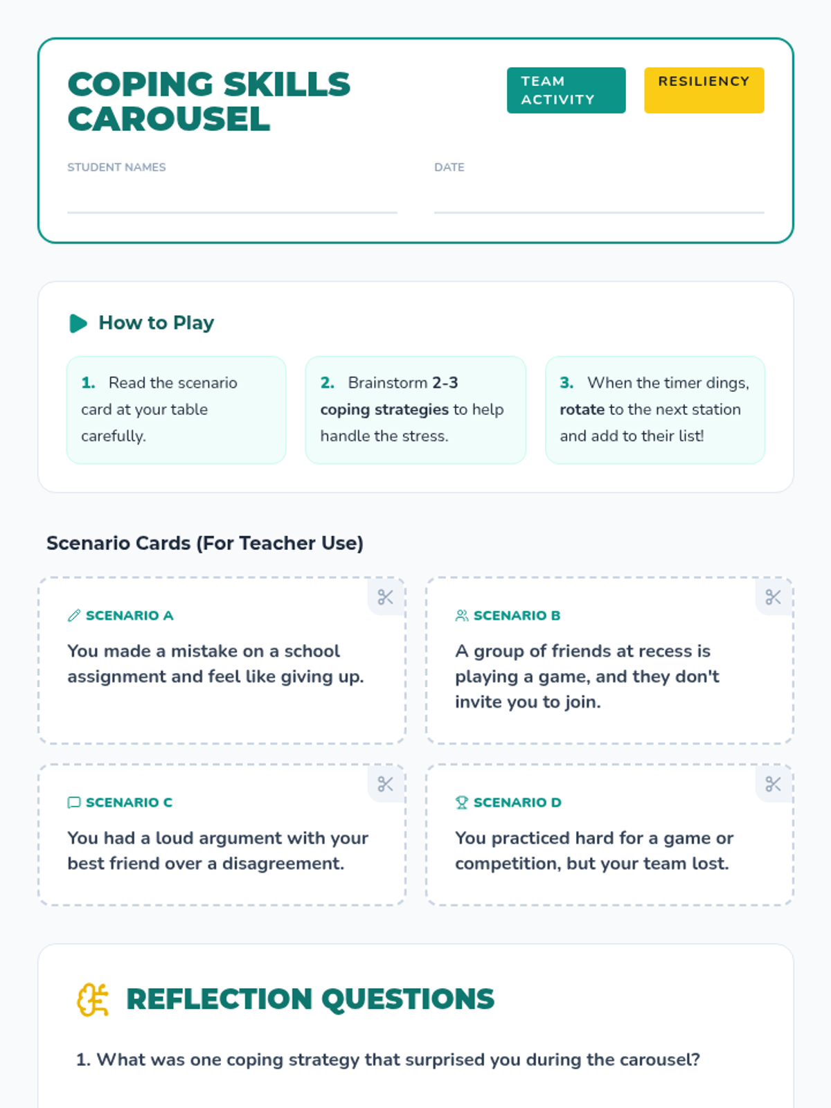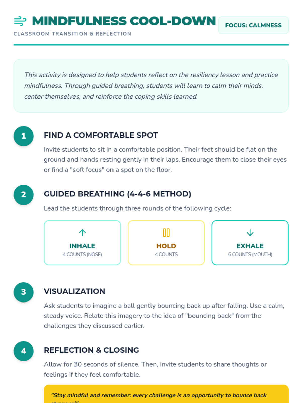 This lesson focuses on teaching 5th-grade students about resiliency and coping skills, emphasizing the importance of bouncing back from challenges and stress. Students will learn practical strategies to handle difficulties through a carousel activity and mindfulness practice.