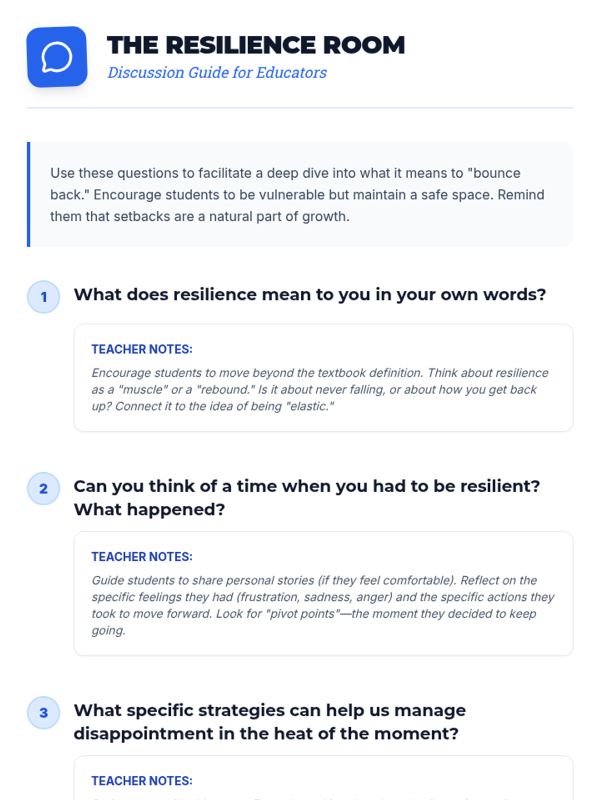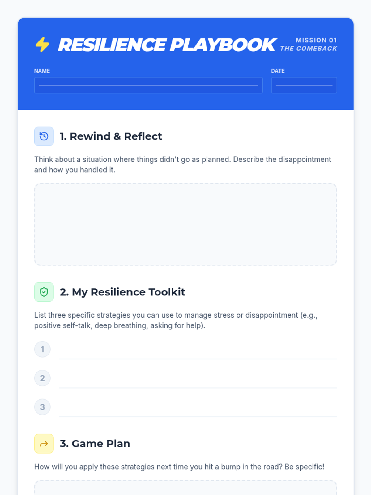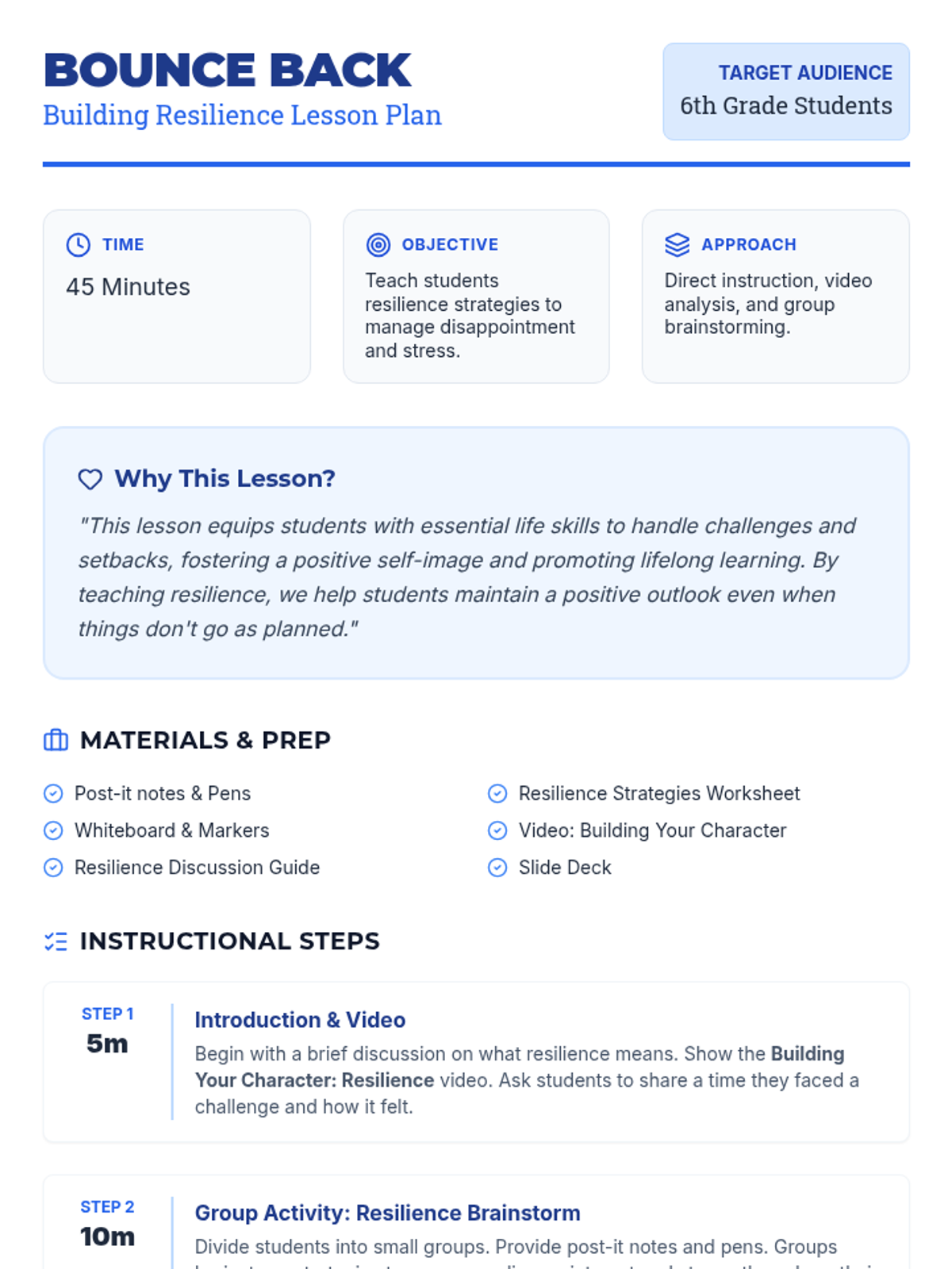 This lesson focuses on teaching students how to bounce back and maintain a positive outlook when things don't go as planned. Through interactive discussions and activities, students will explore strategies to manage disappointment and stress, fostering a positive self-image and promoting lifelong learning.