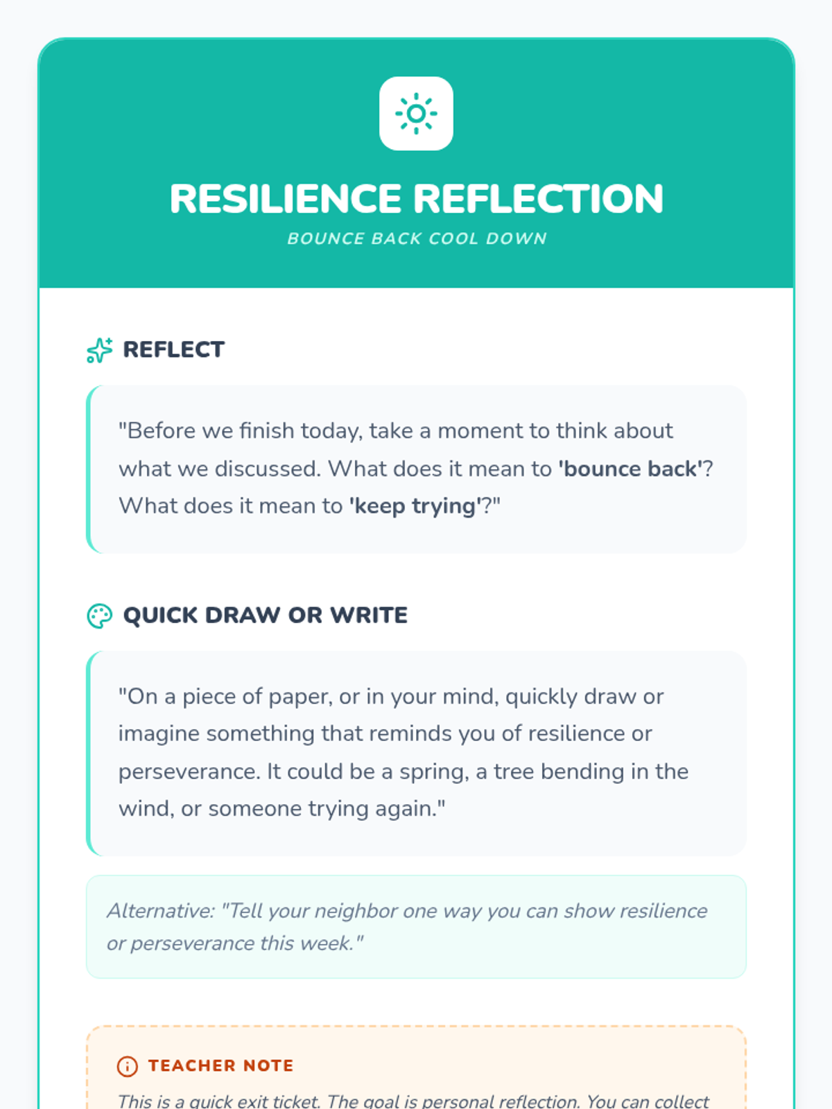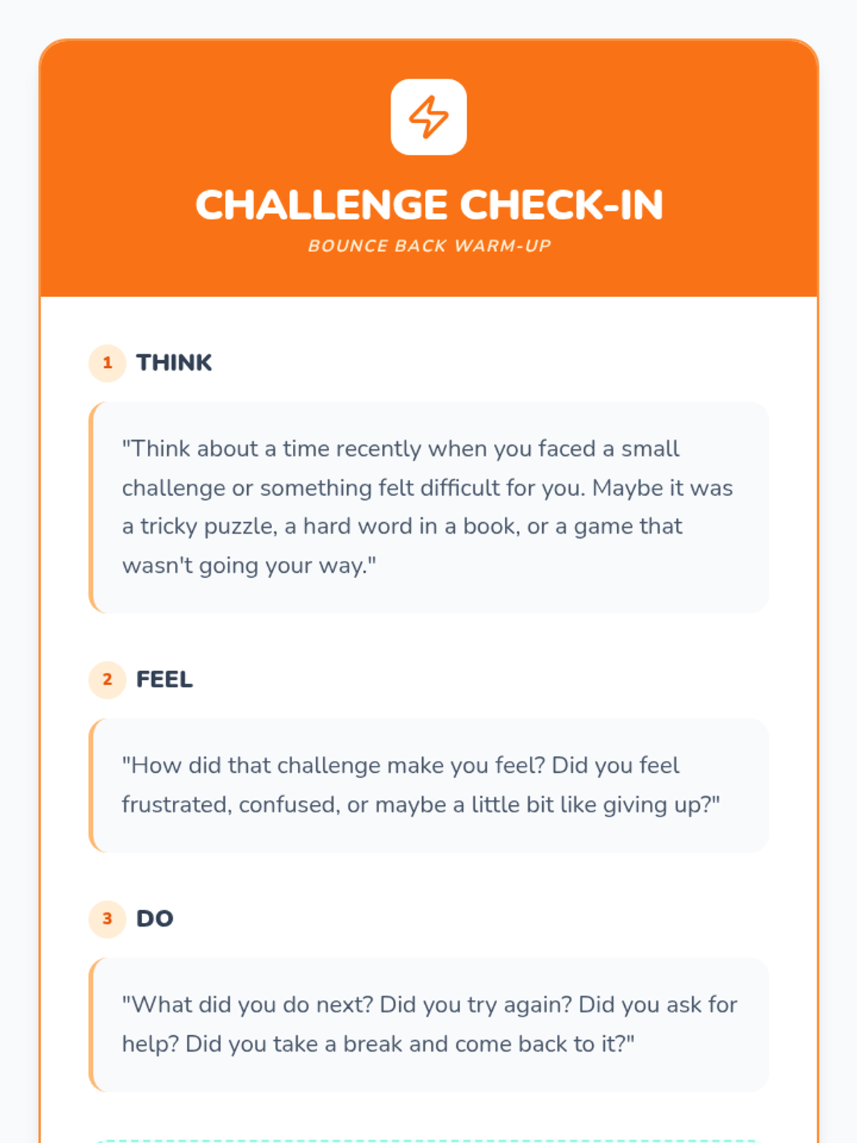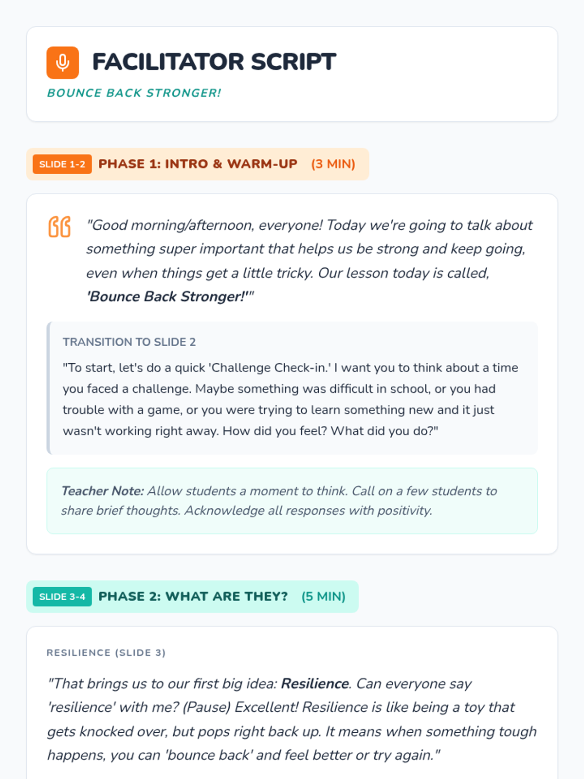Teaches emotional regulation through the Notice-Name-Breathe method and building a resilience toolkit.