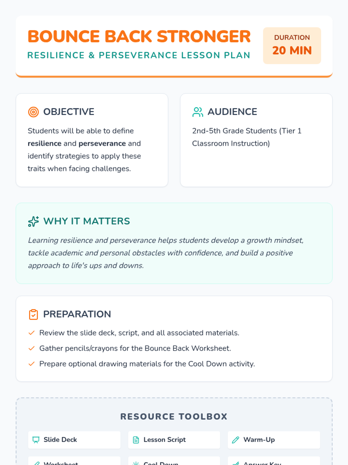 A 20-minute lesson for grades 2-5 that defines resilience and perseverance and provides students with strategies to face challenges with confidence.