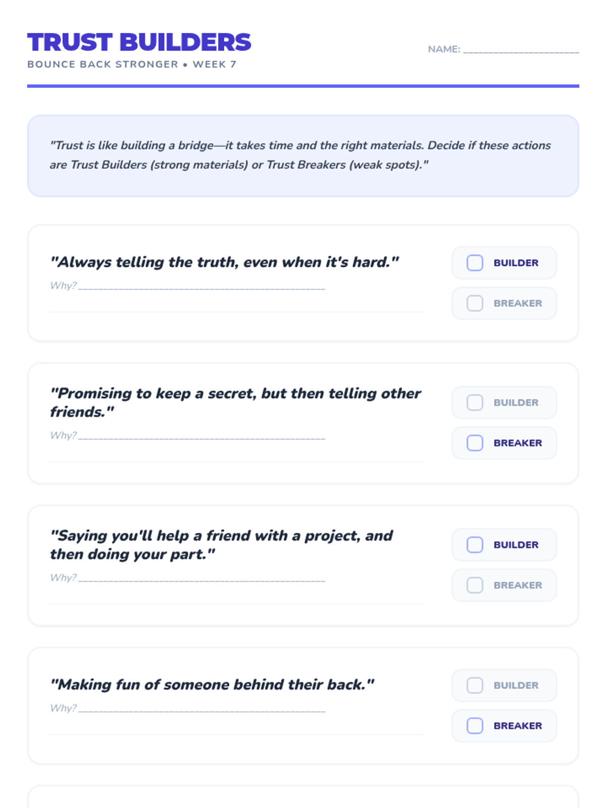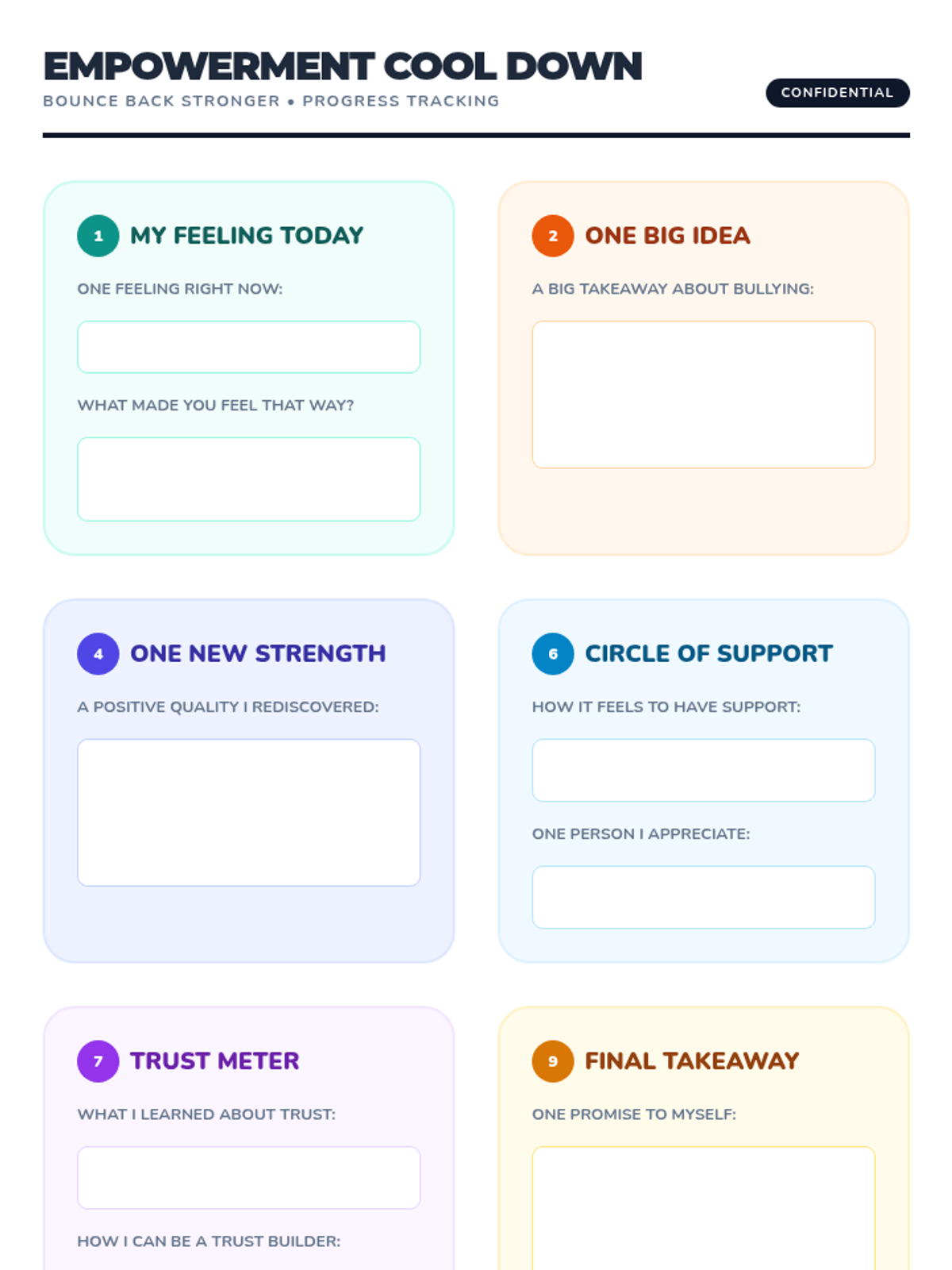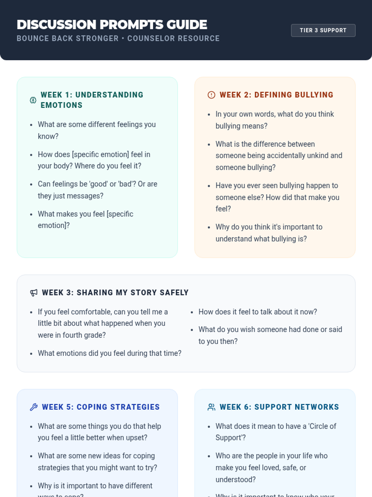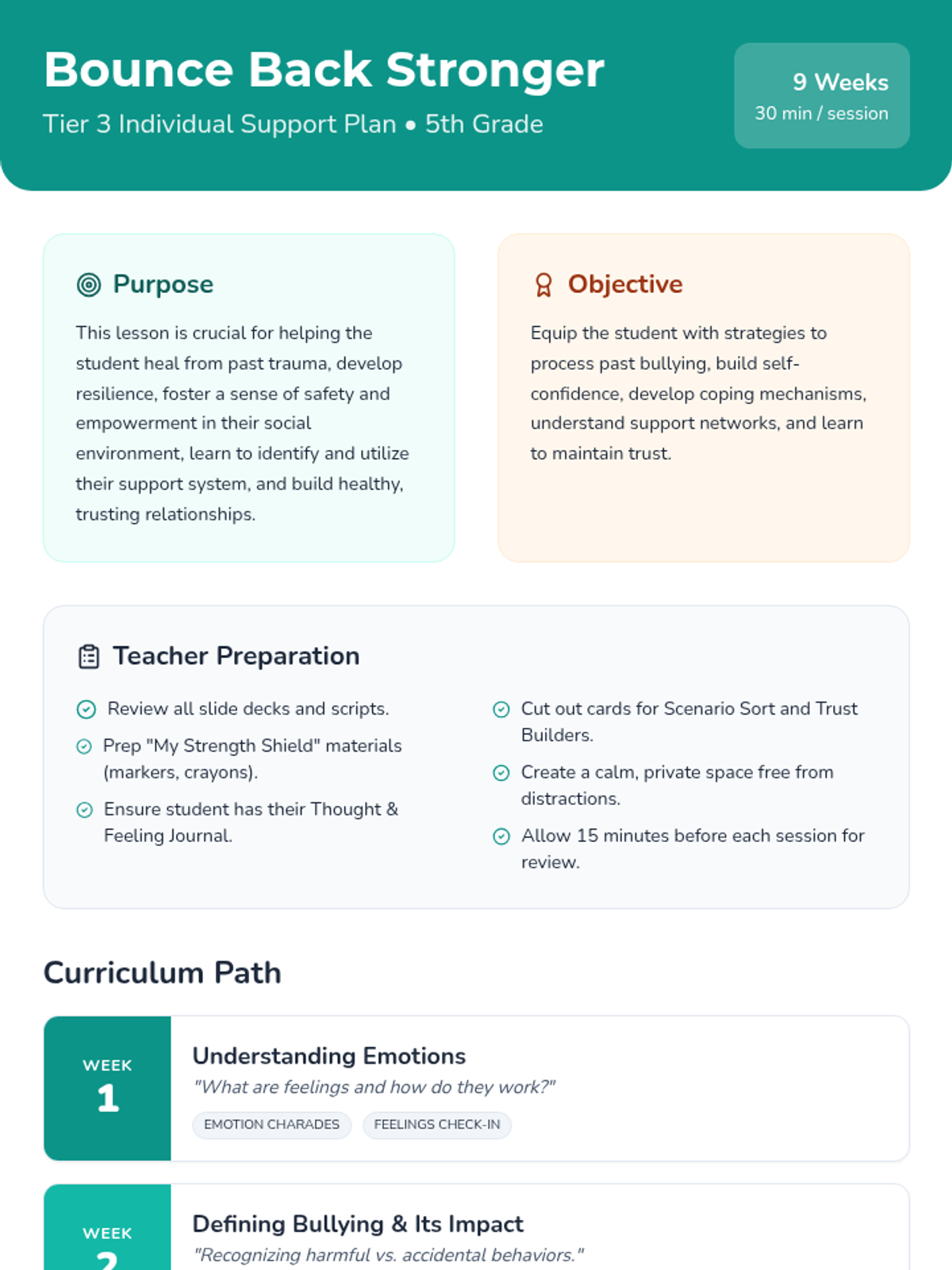 A comprehensive 9-week individual counseling program for 5th graders to heal from bullying, build resilience, and develop healthy coping mechanisms.