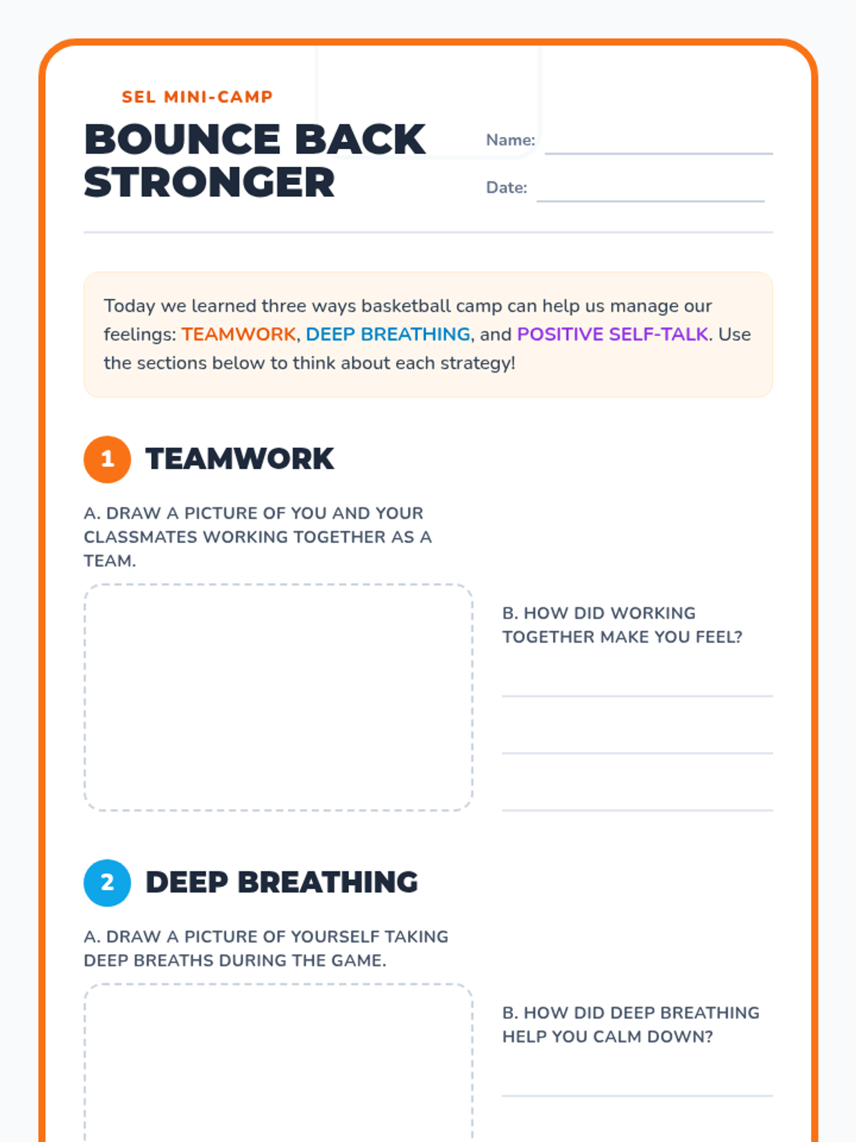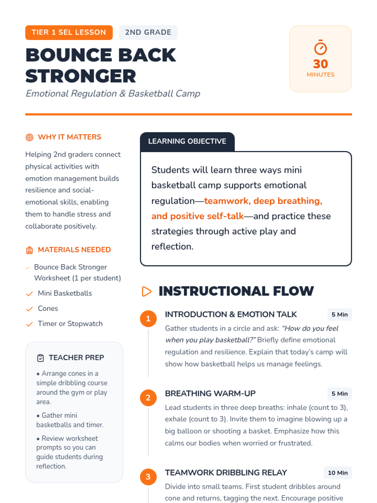 A 30-minute Tier 1 SEL lesson for 2nd graders that uses basketball-themed activities to teach emotional regulation, teamwork, and resilience.