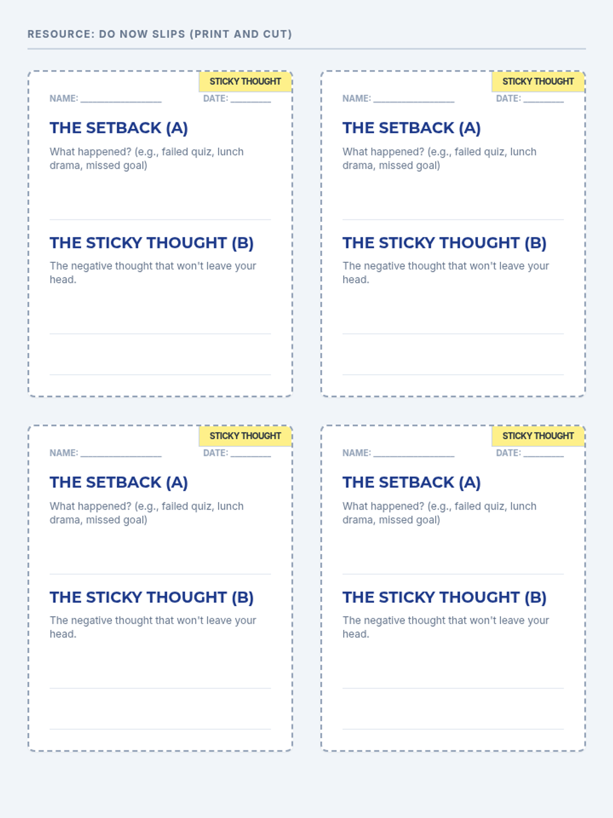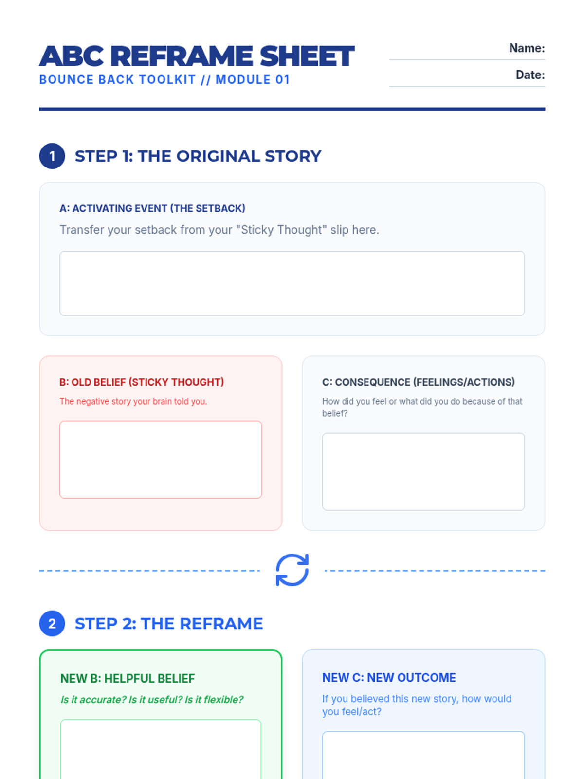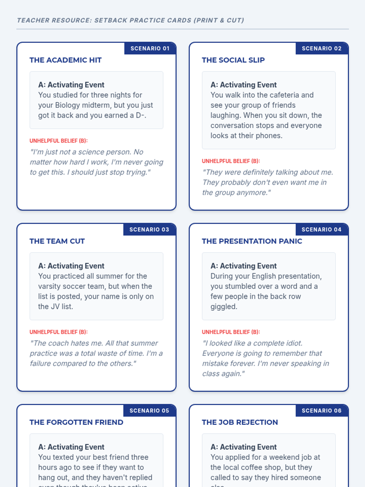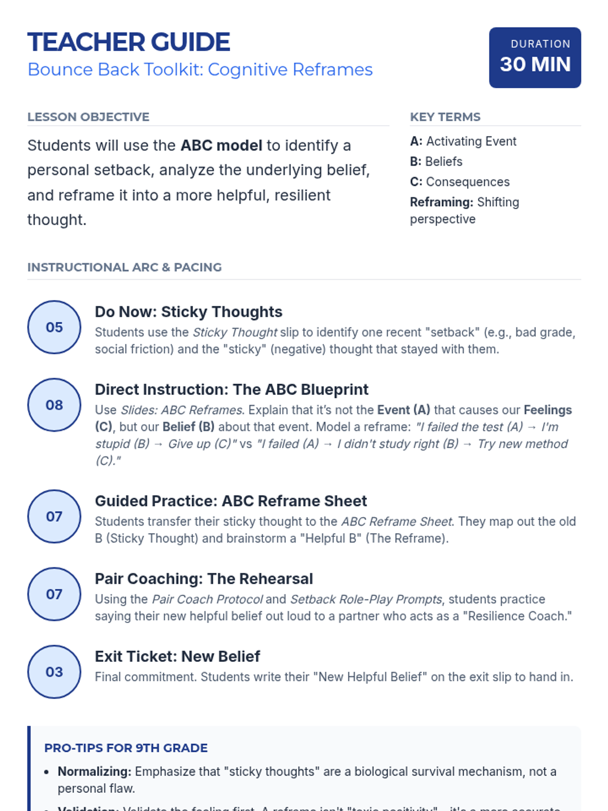 A 30-minute resilience-building lesson for 9th graders focusing on the ABC model of cognitive reframing to transform negative setbacks into helpful beliefs.