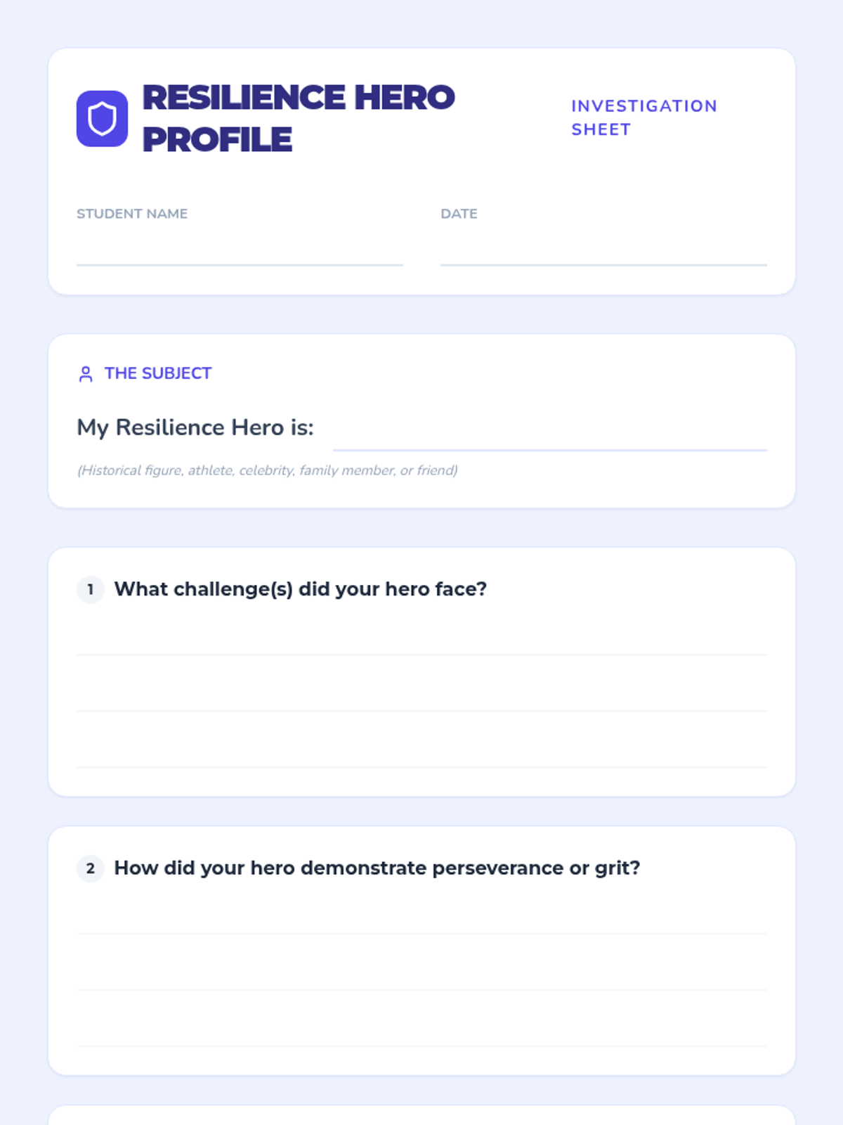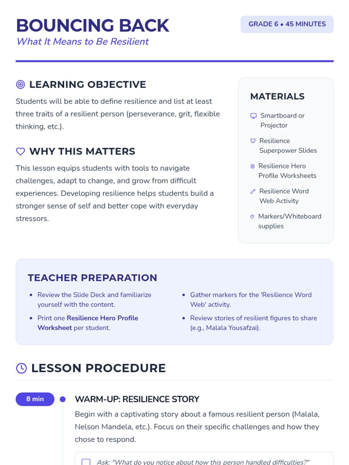 This lesson introduces 6th-grade students to resilience, defining it as the ability to 'bounce back' from challenges. Students will explore key traits like grit and flexible thinking through a slide presentation, a hero profile project, and a collaborative word web activity.