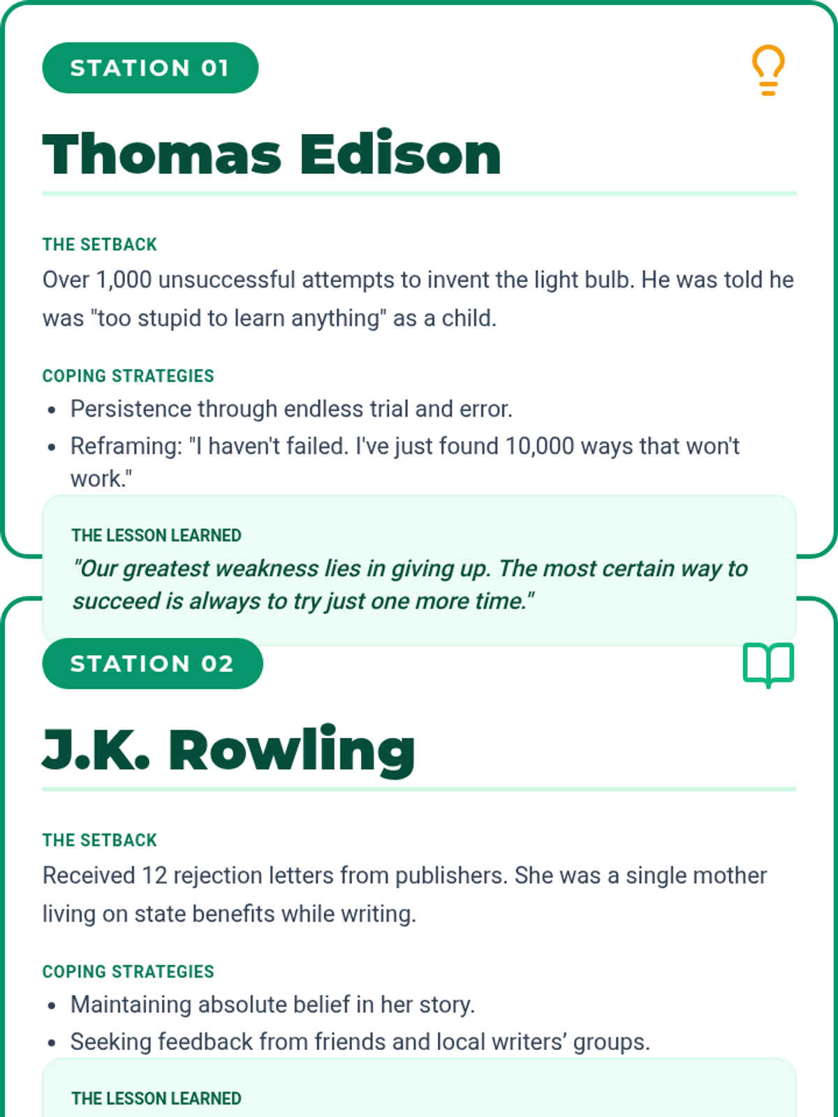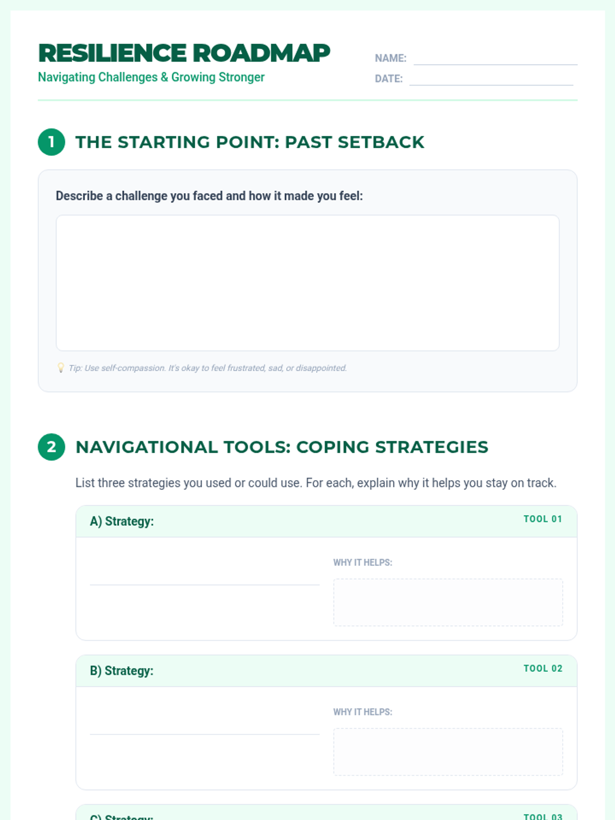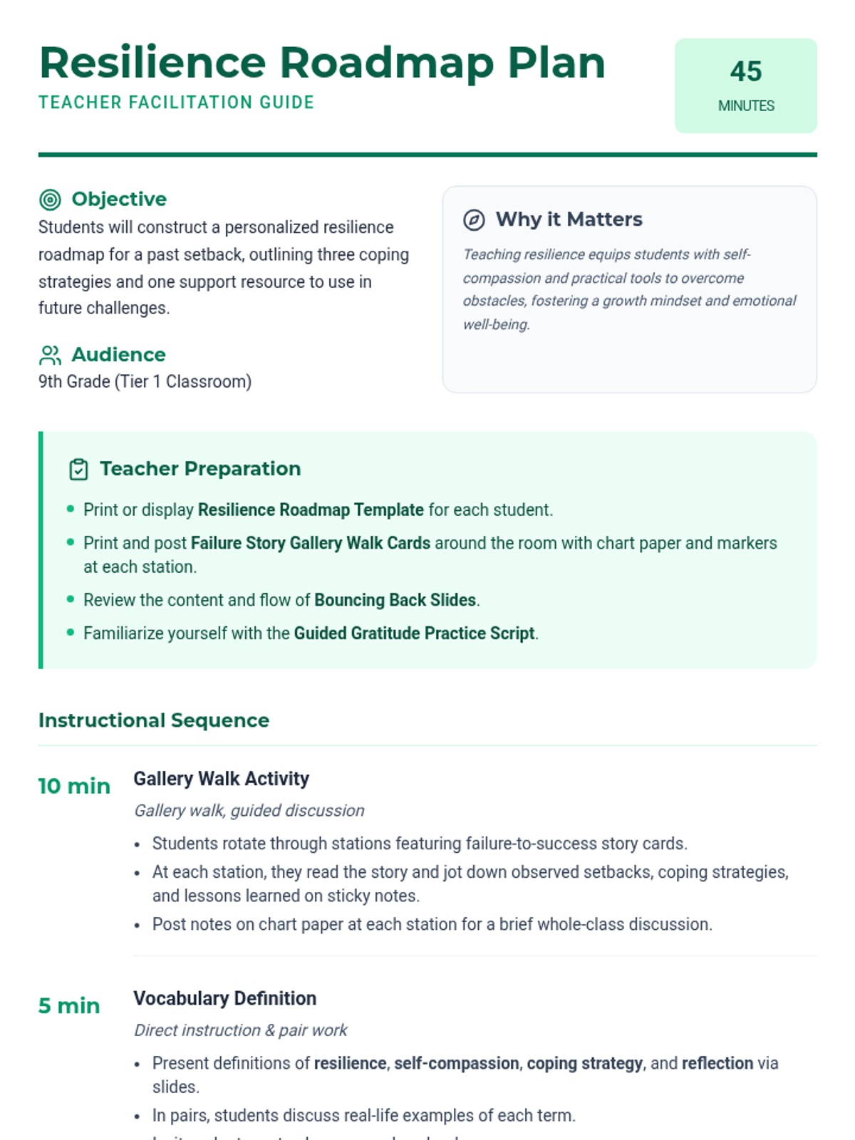 A 45-minute 9th grade lesson on resilience, featuring a gallery walk of success stories, vocabulary building, and the creation of a personalized resilience roadmap.