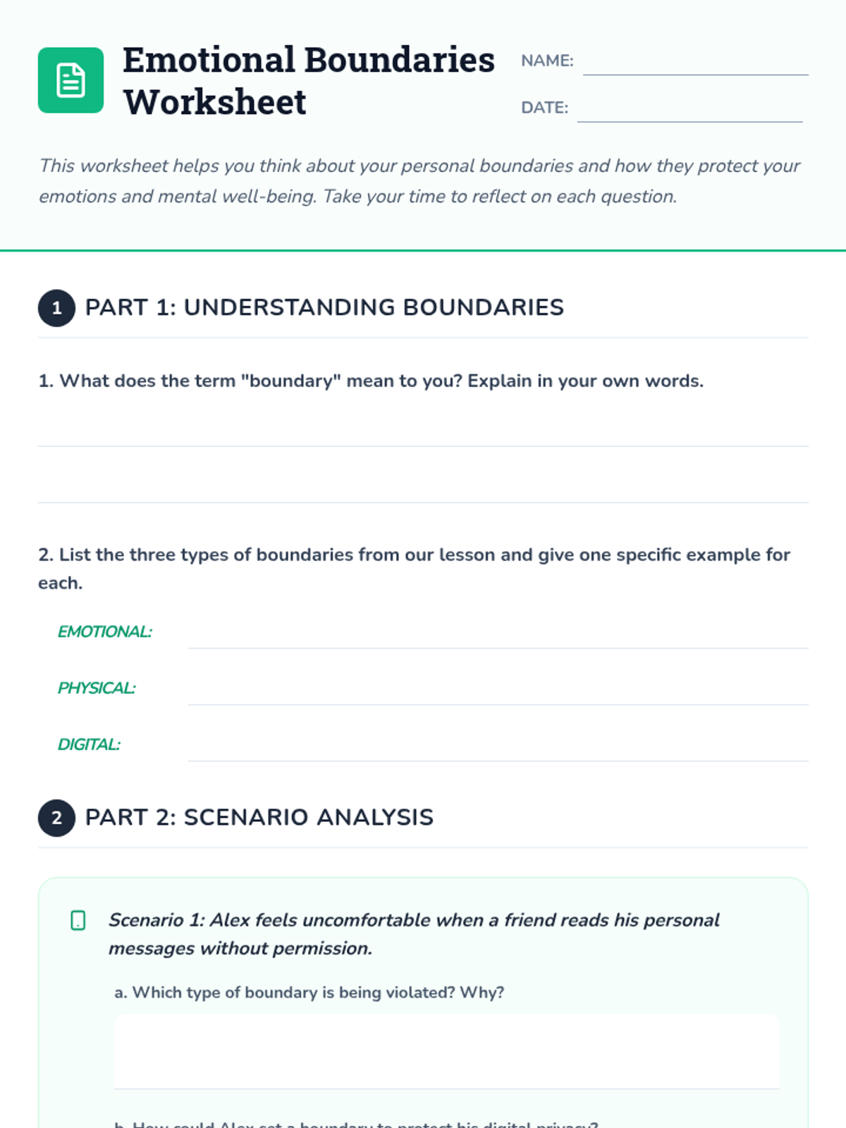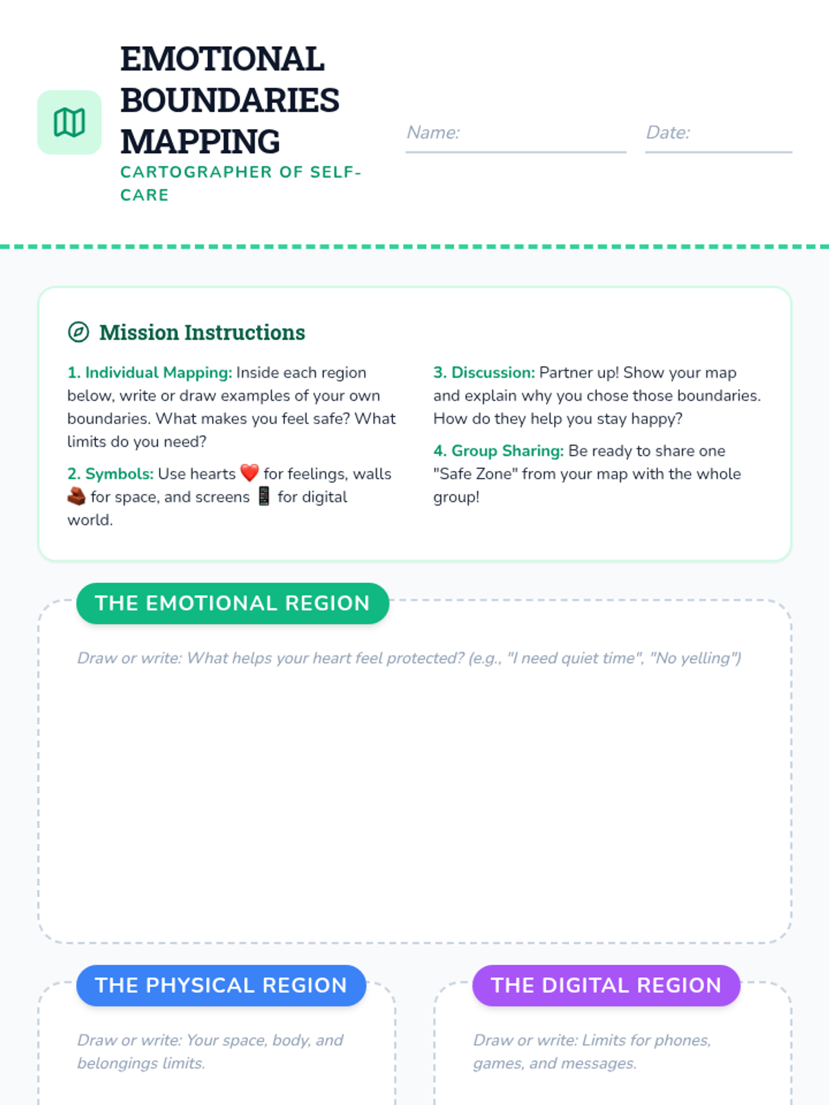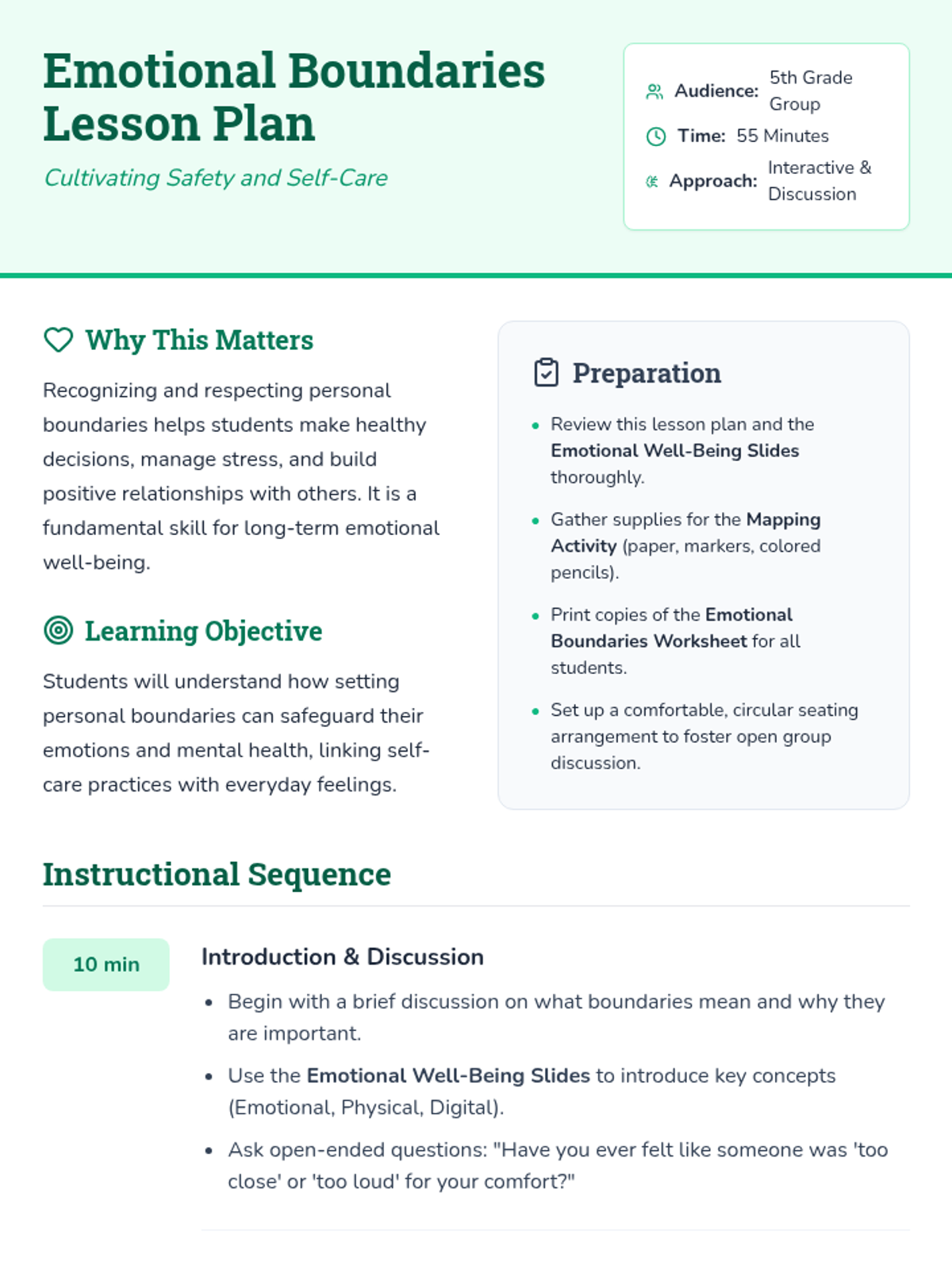 Help 5th-grade students connect personal boundaries with their emotional well-being, recognizing how setting limits protects their mental health and fosters self-care in a 55-minute group session.