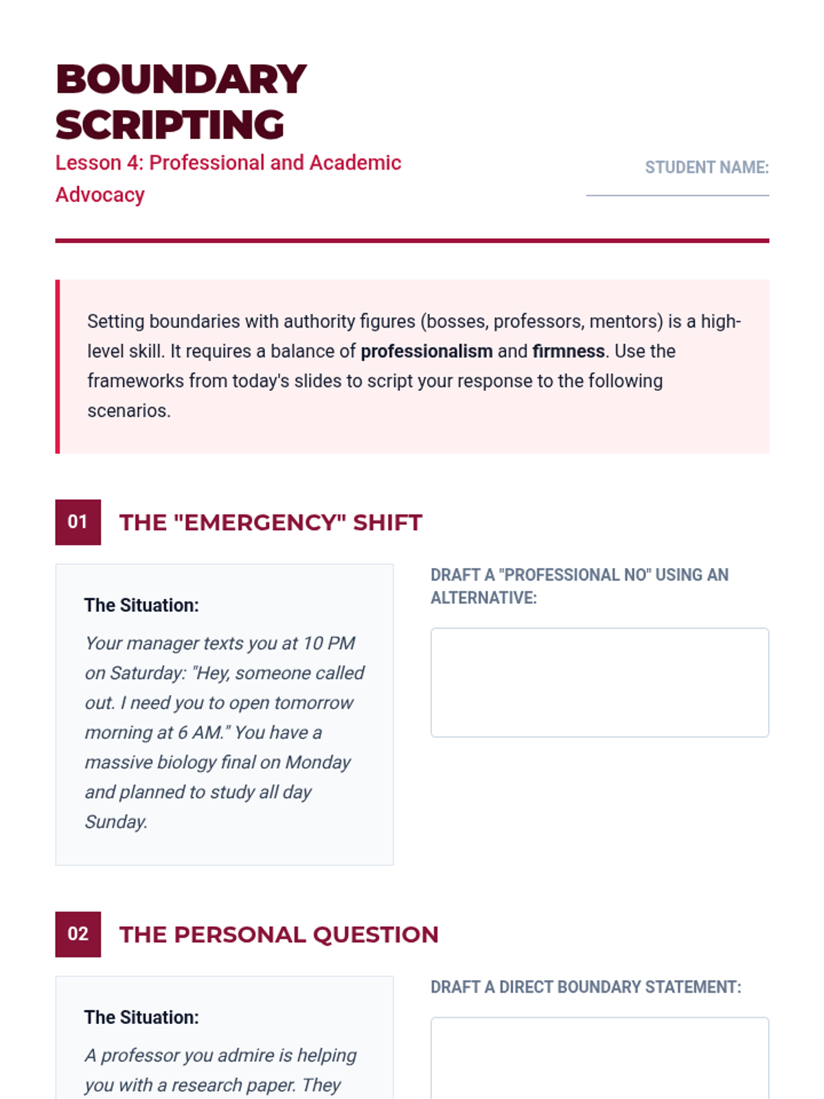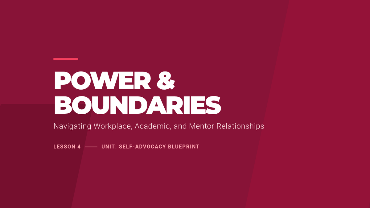 Addresses setting boundaries with mentors, employers, and professors, focusing on workplace safety, requesting accommodations, and navigating power dynamics.