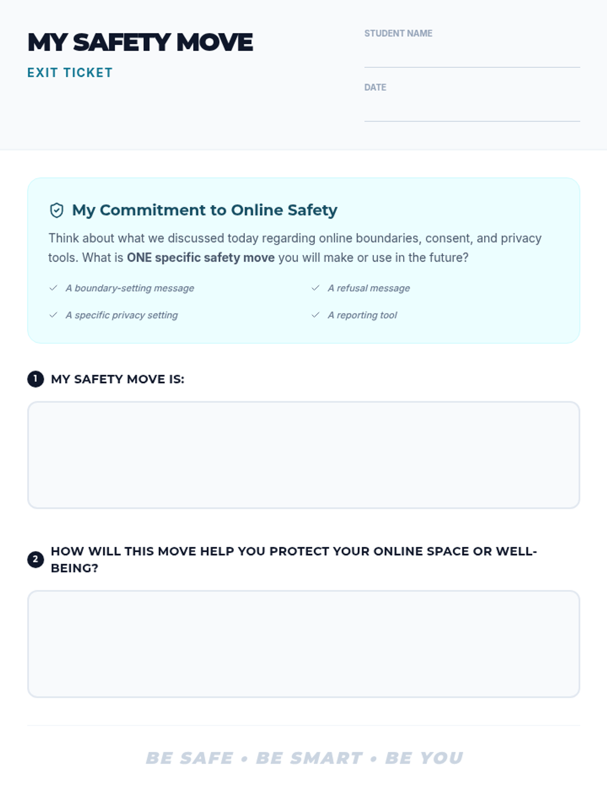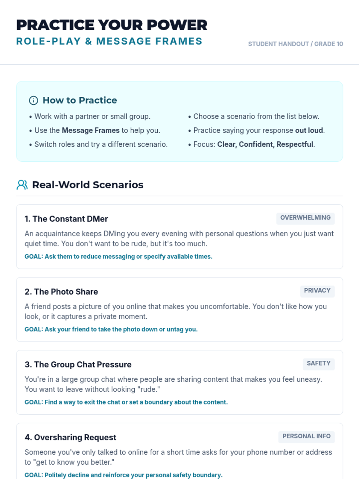 This lesson empowers 10th-grade students to navigate online interactions safely by understanding consent, setting boundaries, and utilizing privacy tools. Students will practice crucial communication skills and identify resources to protect their digital well-being.