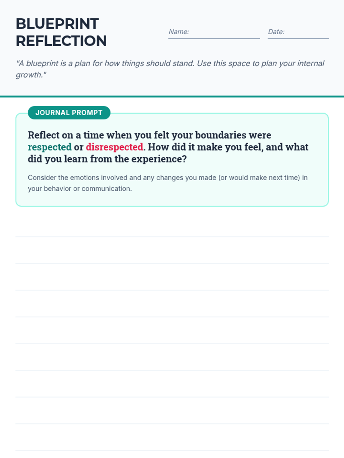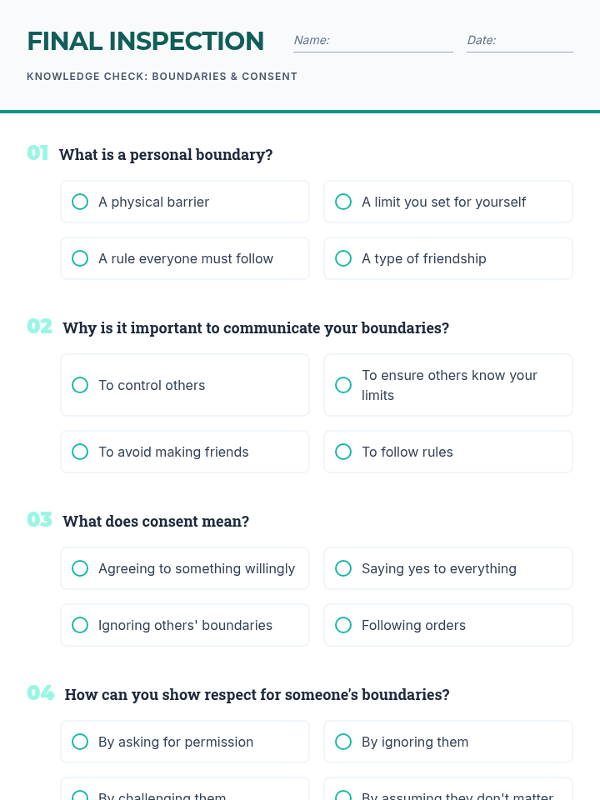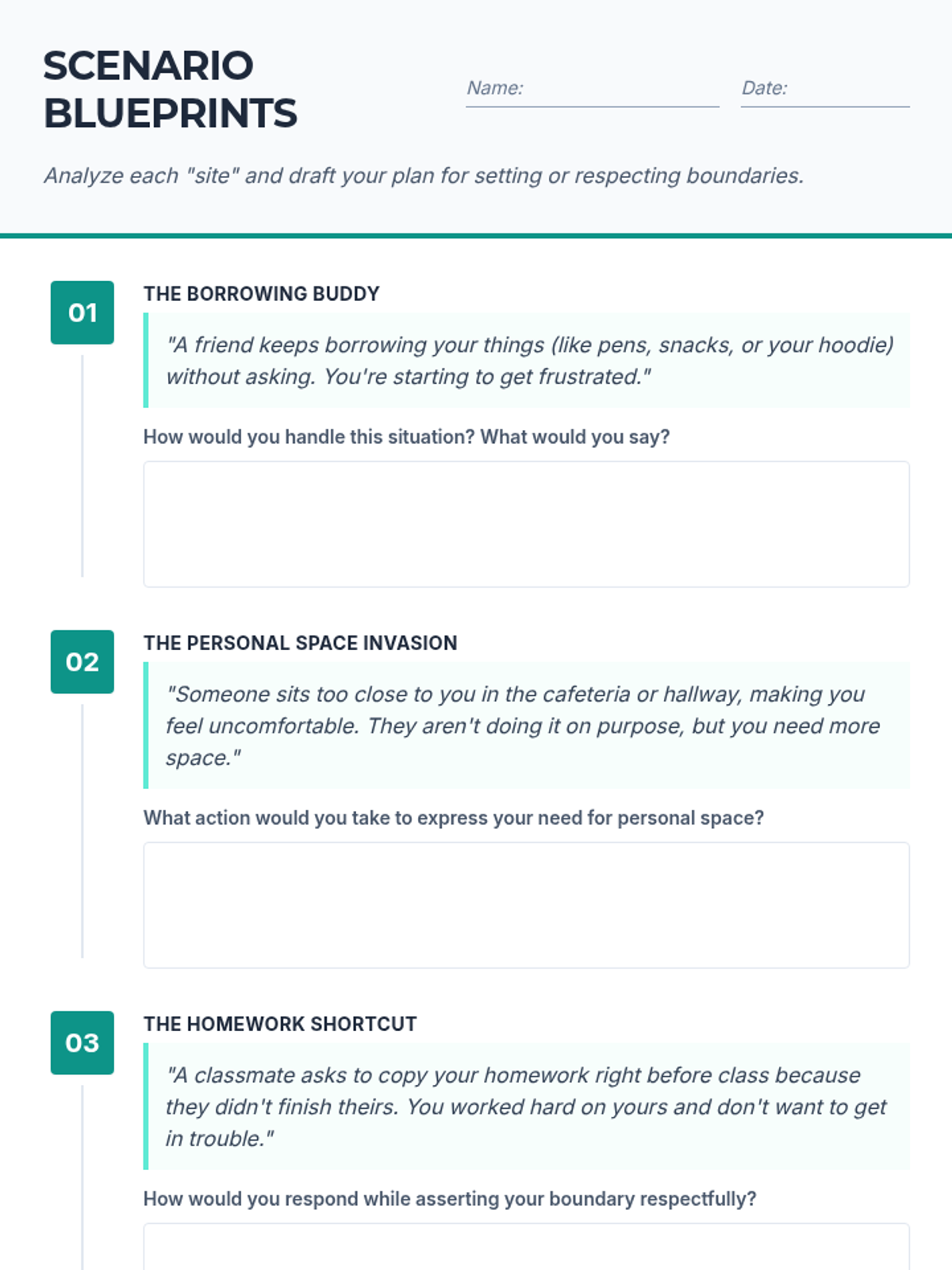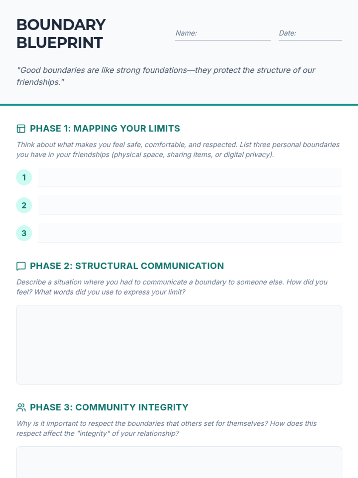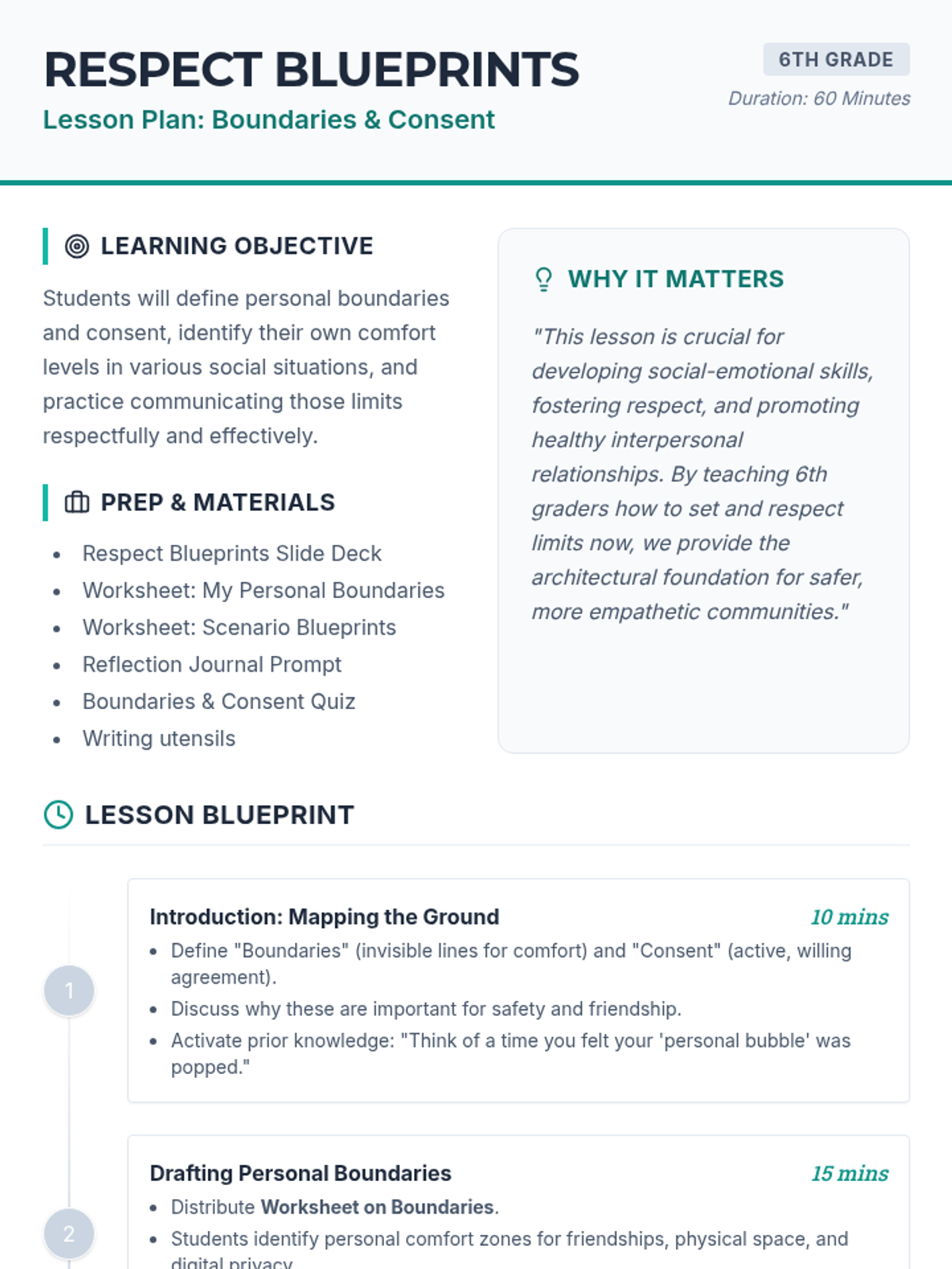 This lesson empowers 6th-grade students to define, communicate, and respect personal boundaries. Through structured reflection, scenario analysis, and guided discussion, students build the foundational social-emotional skills necessary for healthy relationships and mutual consent.