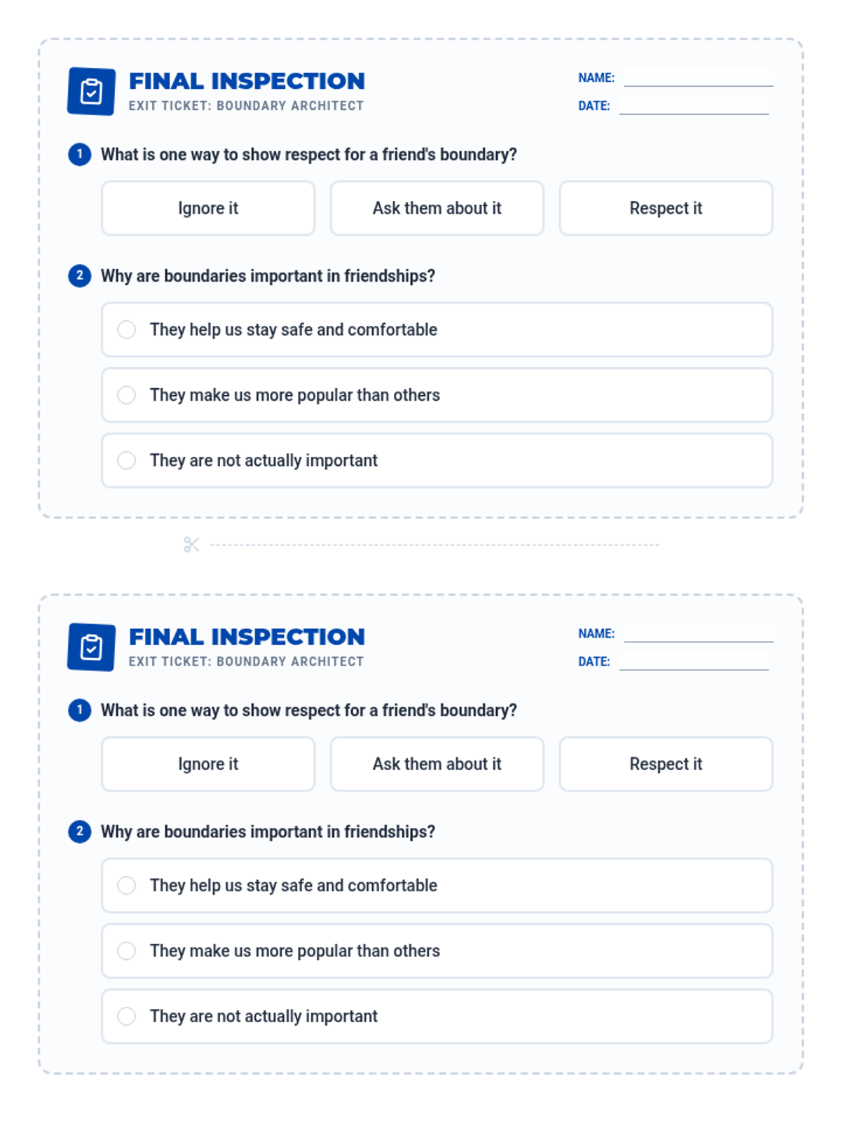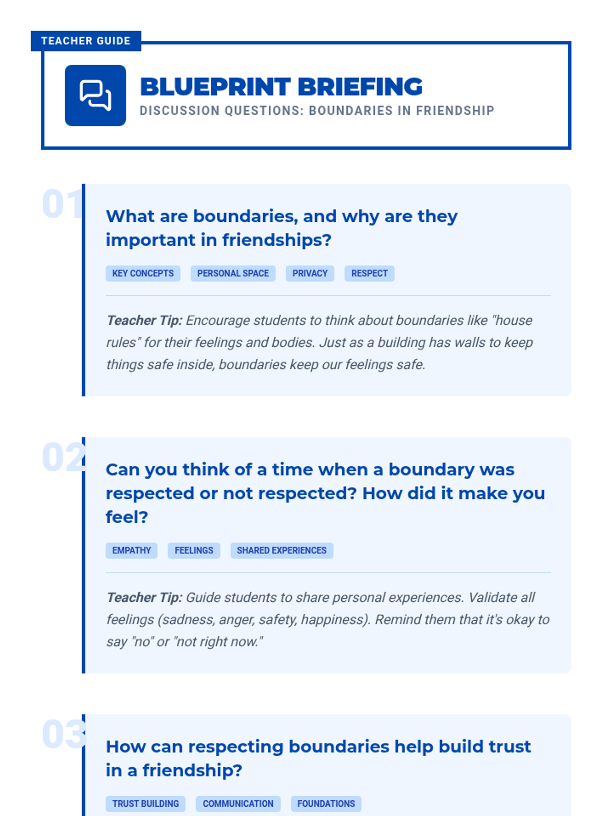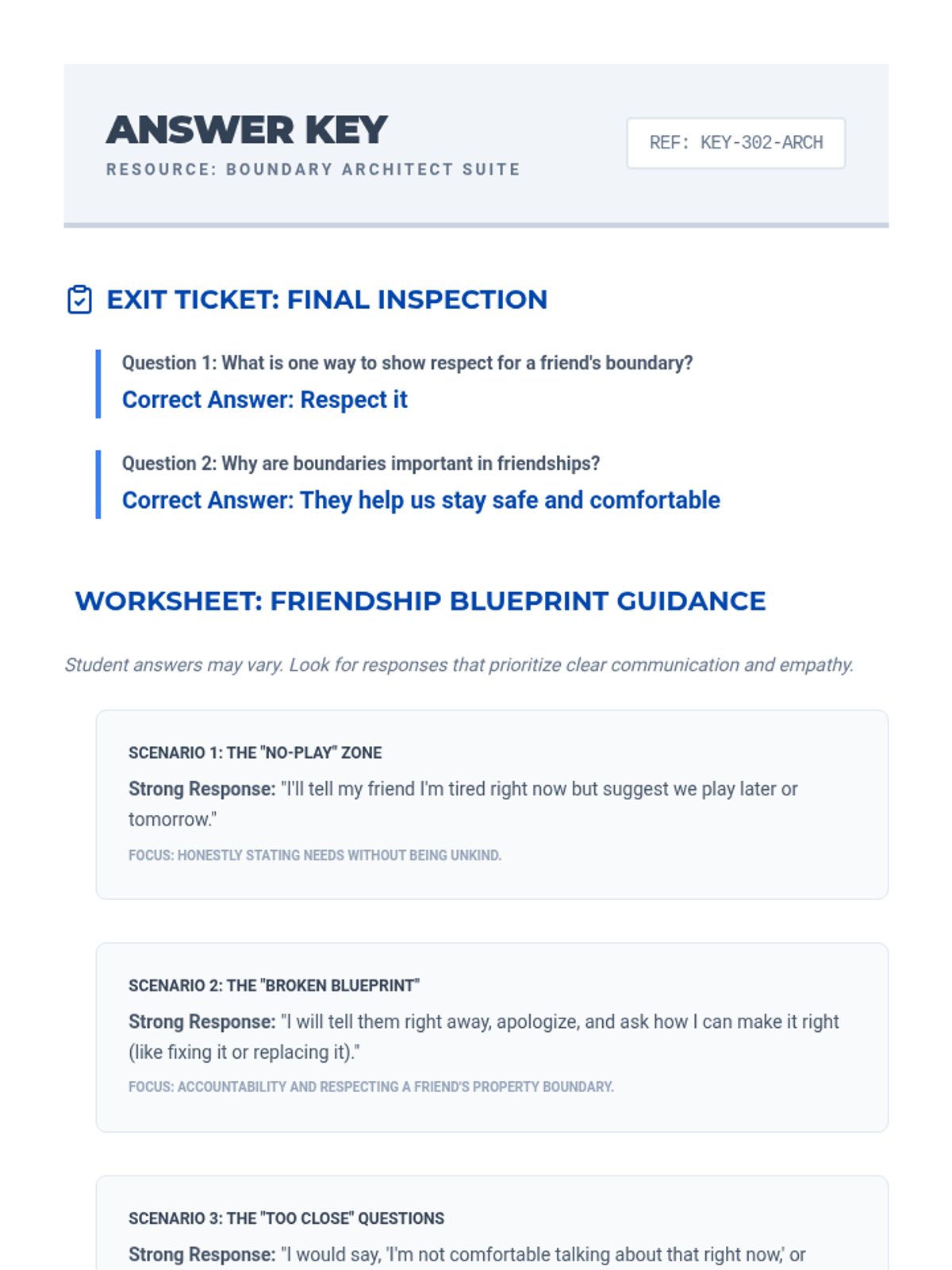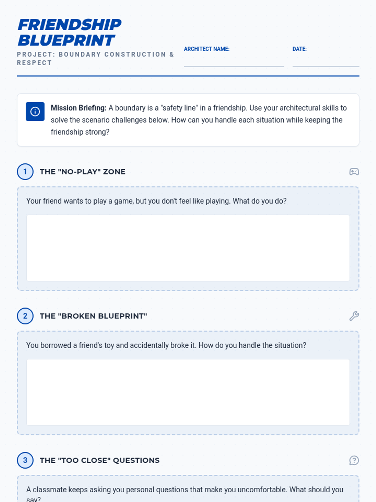A comprehensive lesson for 3rd graders exploring the concept of personal and emotional boundaries in friendships, using a 'Social Architect' theme to map out respect and trust.