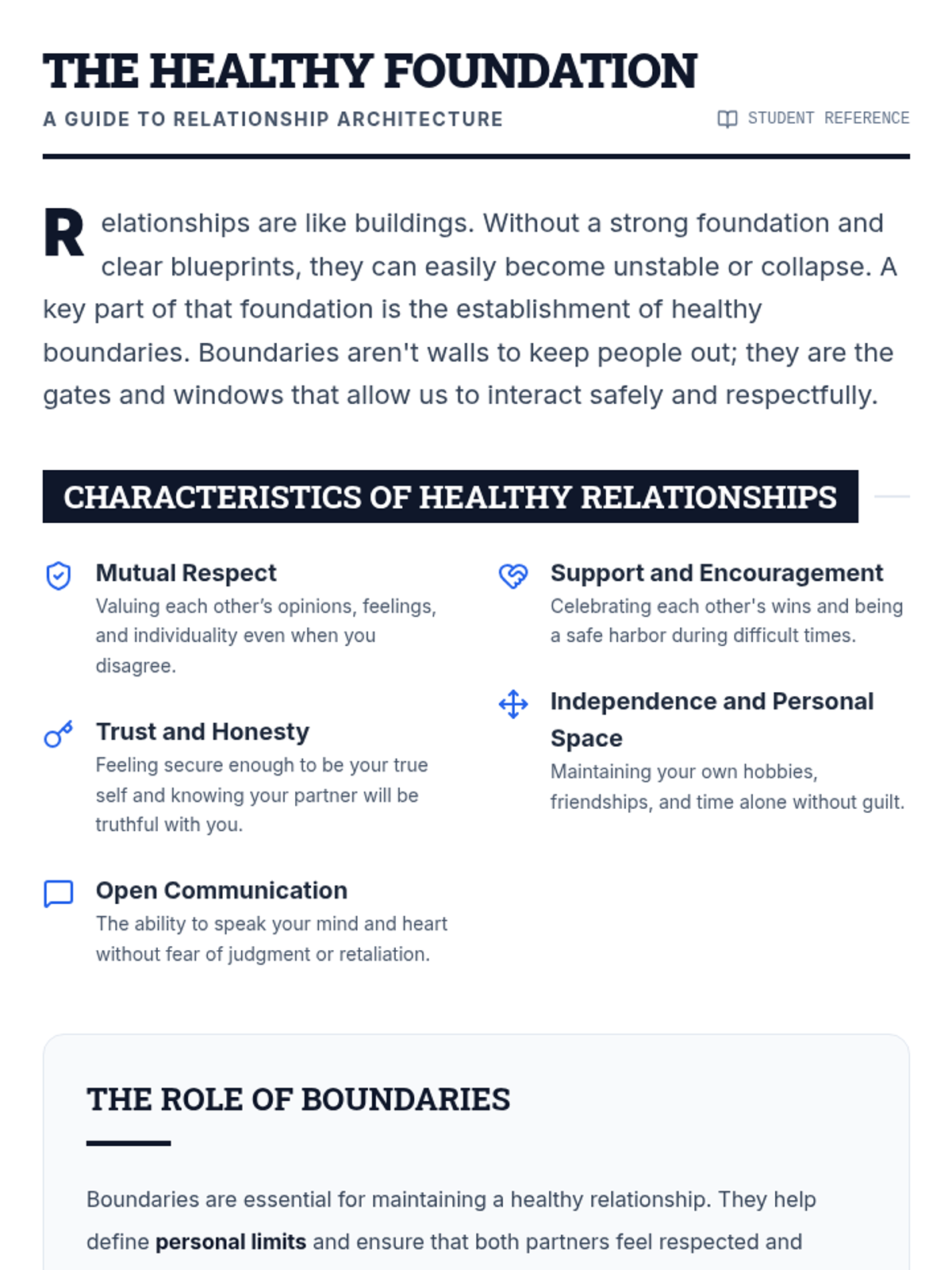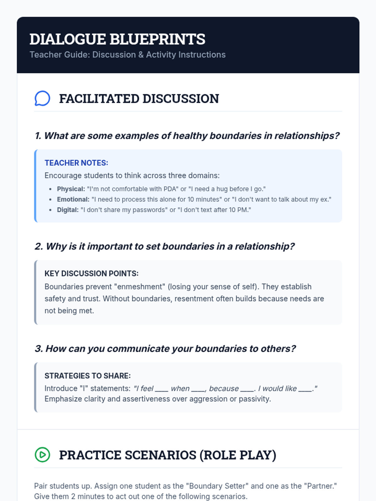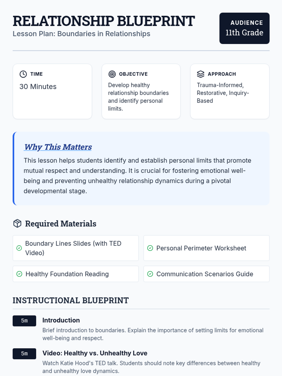 This lesson helps 11th graders understand and develop healthy boundaries in relationships by identifying personal limits, practicing communication strategies, and exploring the characteristics of healthy love.
