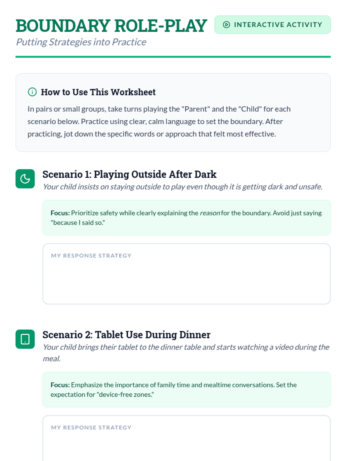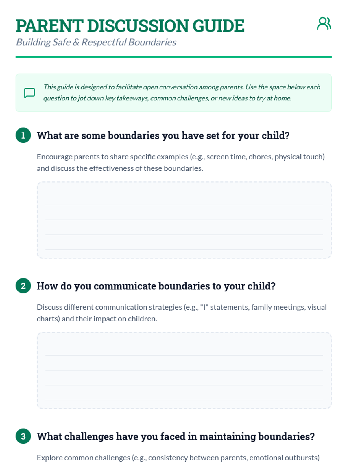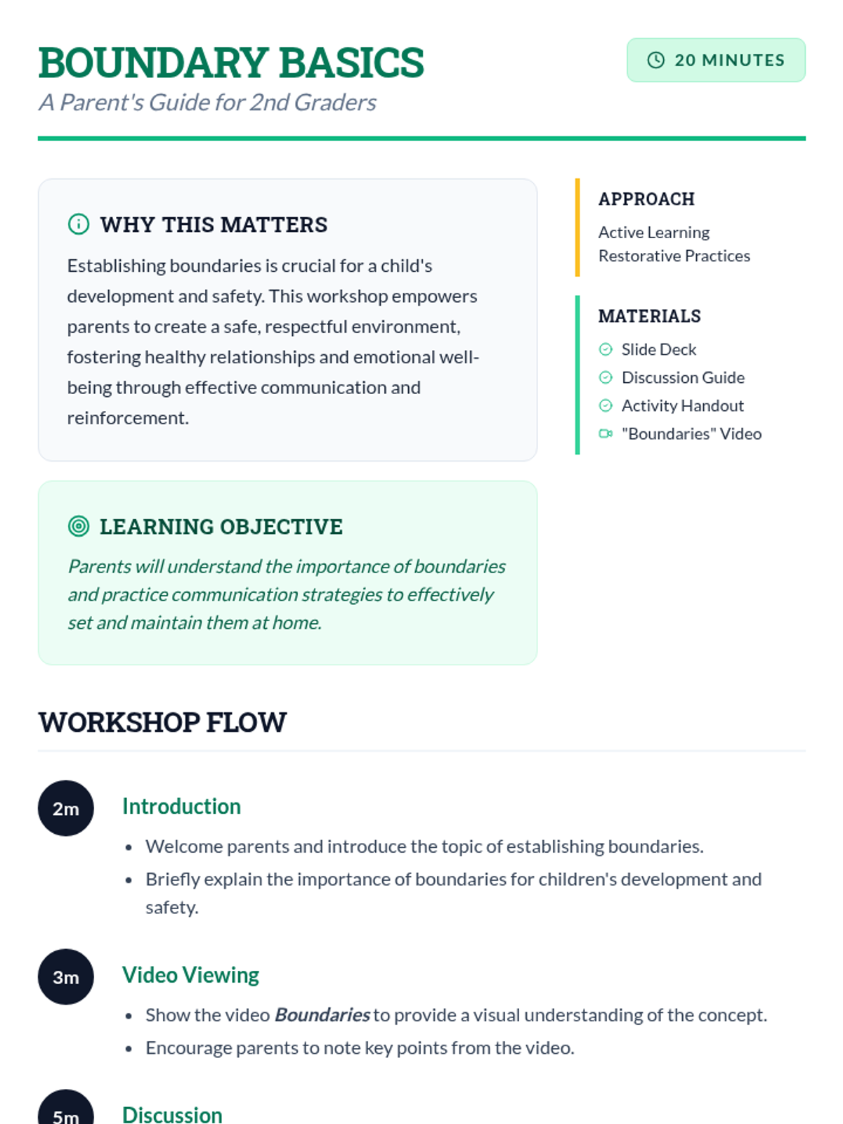A 20-minute workshop for parents of 2nd graders to learn the importance of boundaries and practice effective communication strategies to foster a safe and respectful home environment.