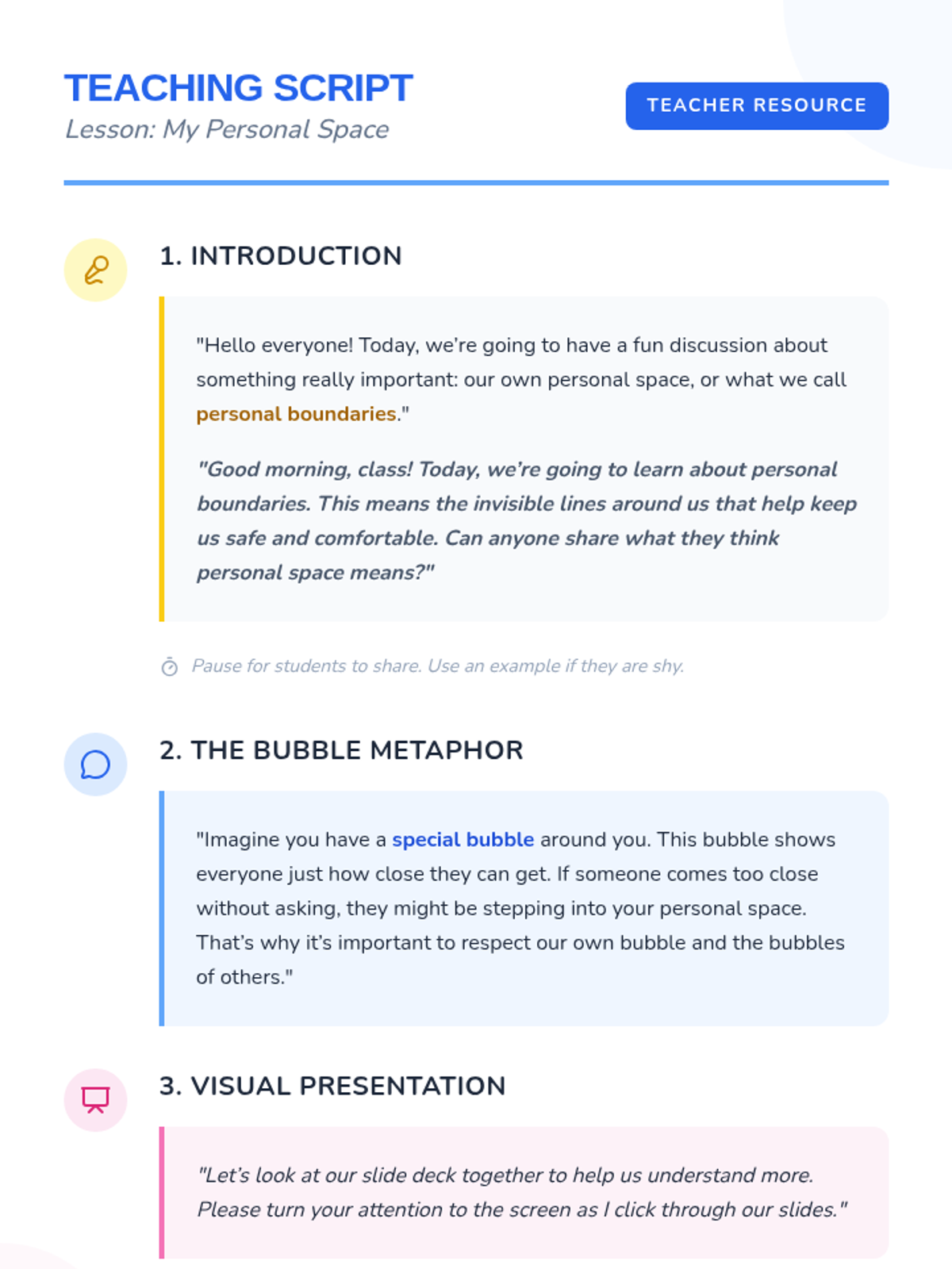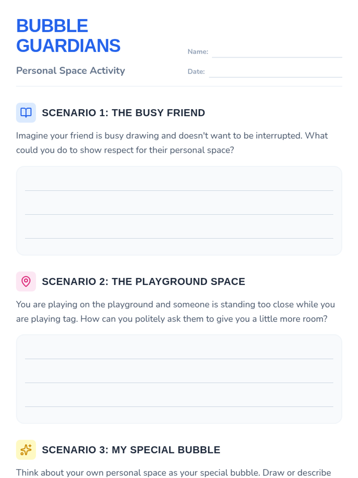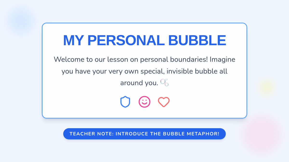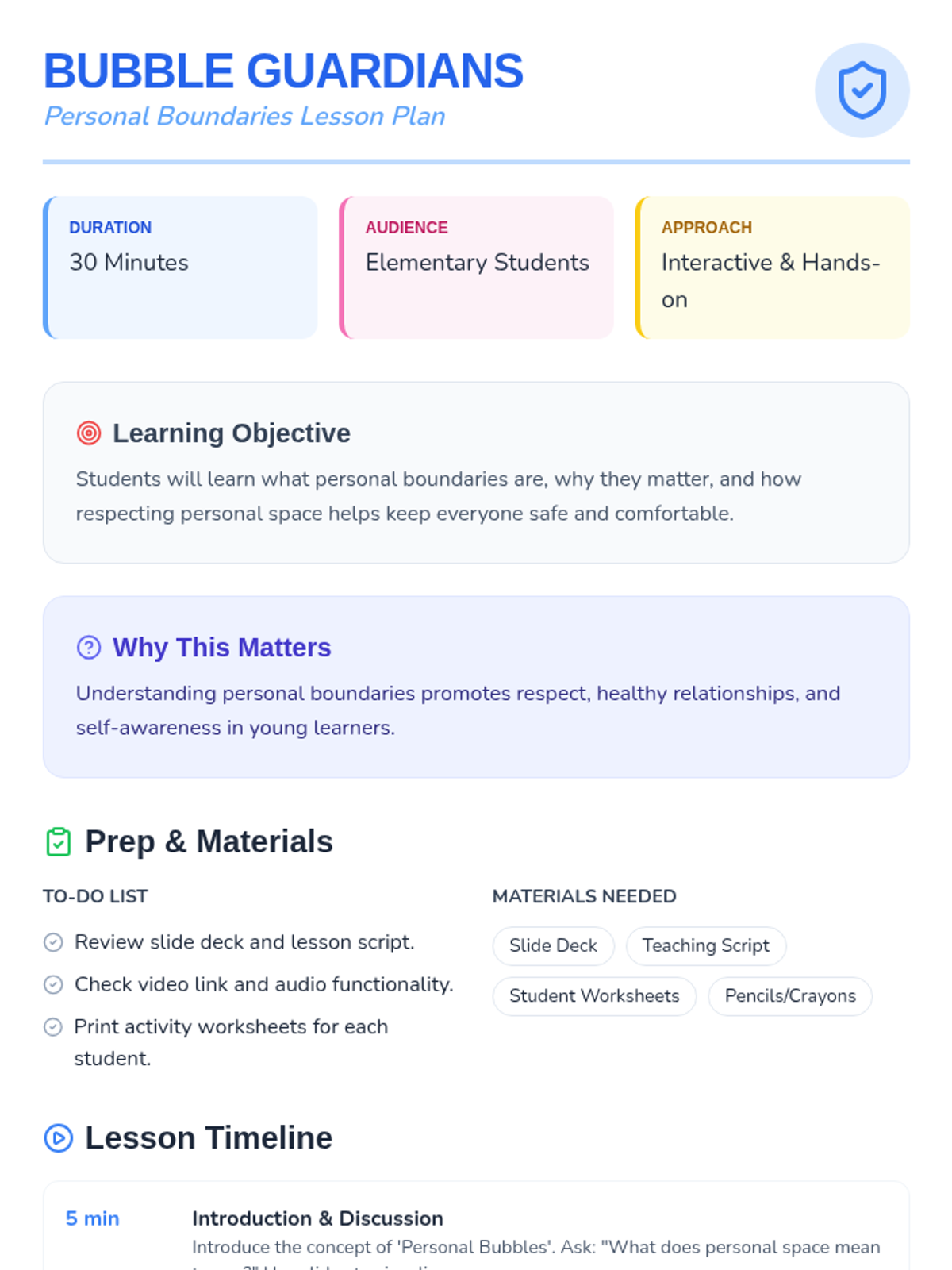 A 30-minute introductory lesson for elementary students on personal boundaries and space, using the 'personal bubble' metaphor to teach respect and safety.
