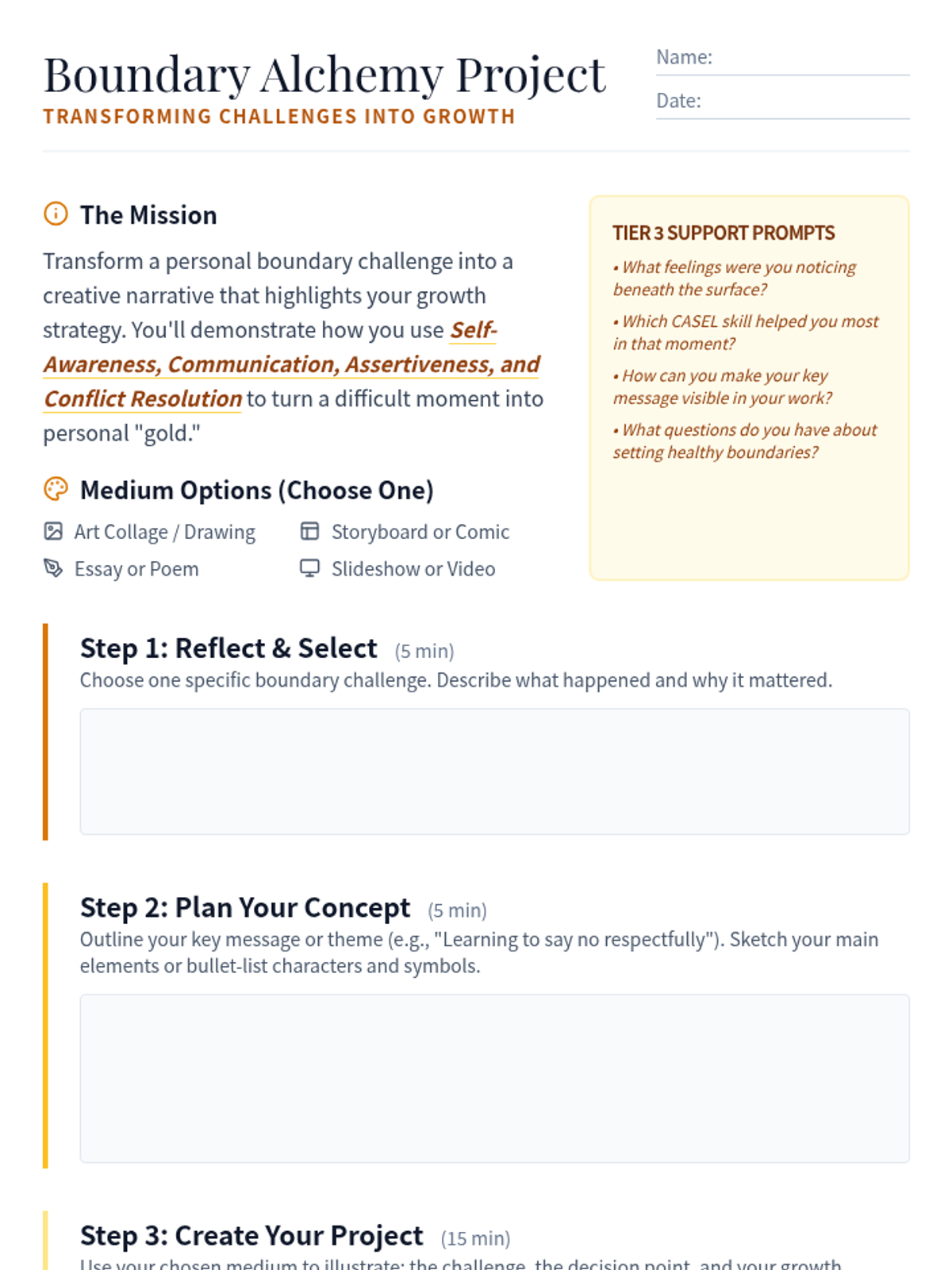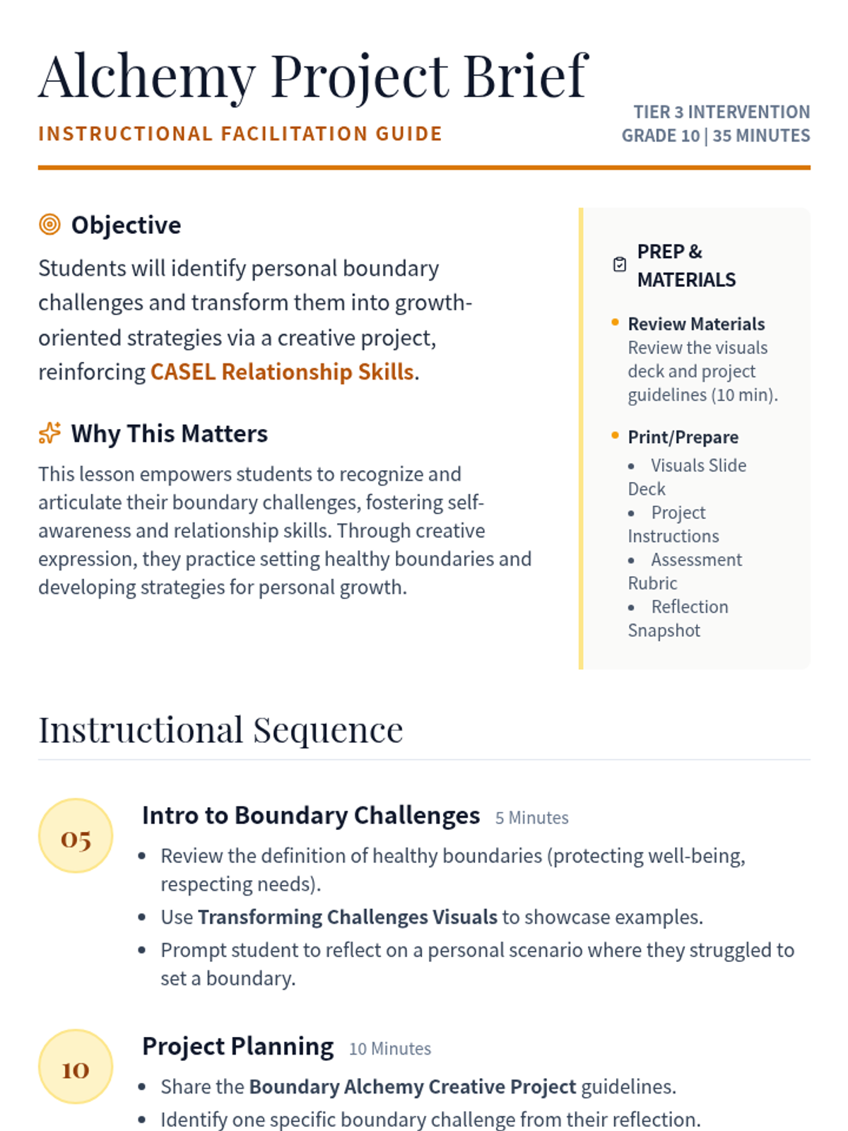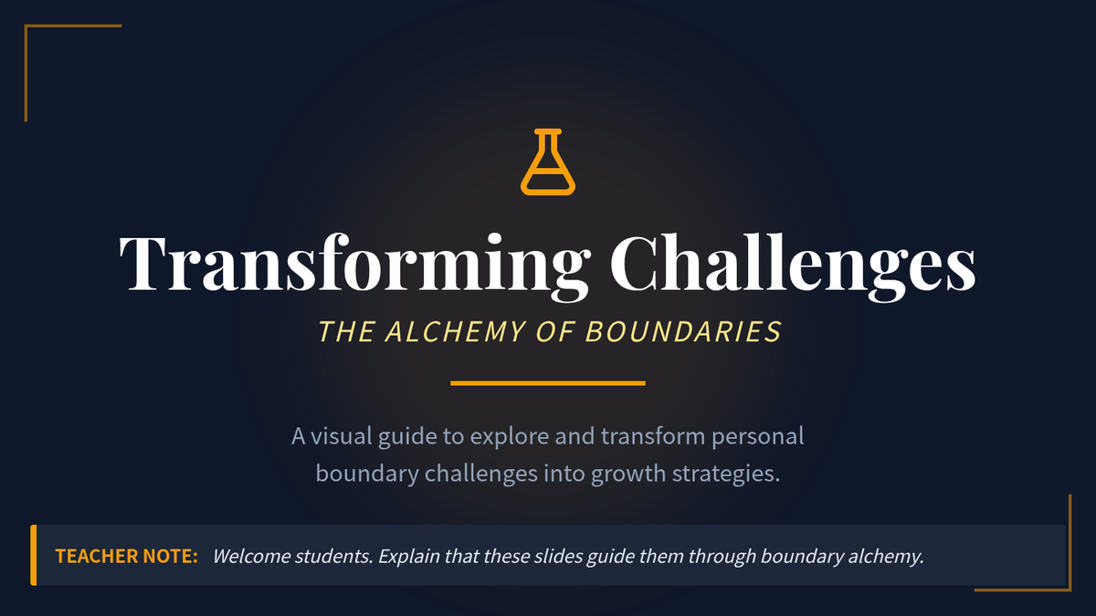 A 35-minute Tier 3 intervention for 10th-grade students to explore and transform personal boundary challenges into growth strategies through a creative project. Students use an 'alchemical' metaphor to turn difficult interpersonal moments into gold.