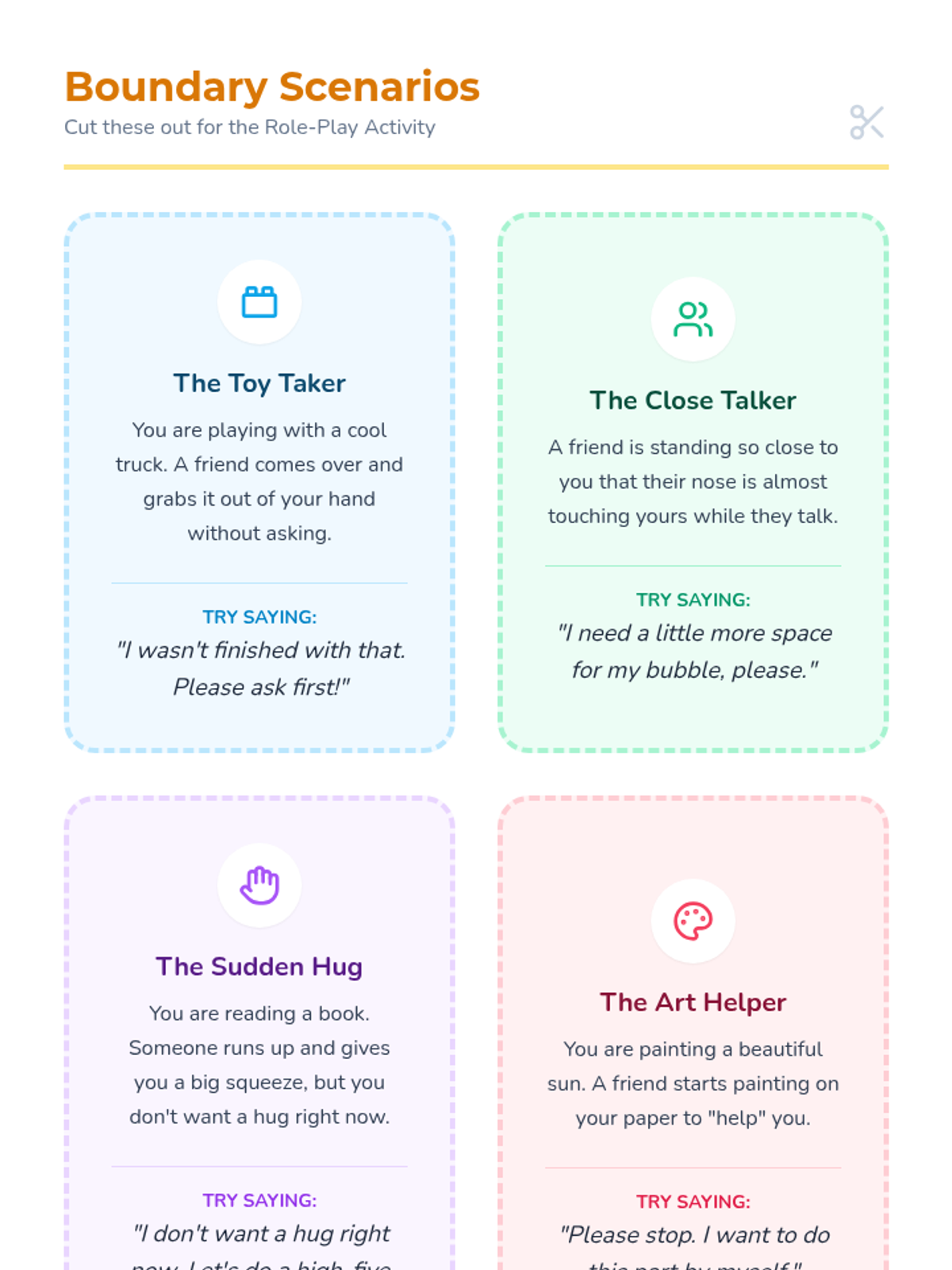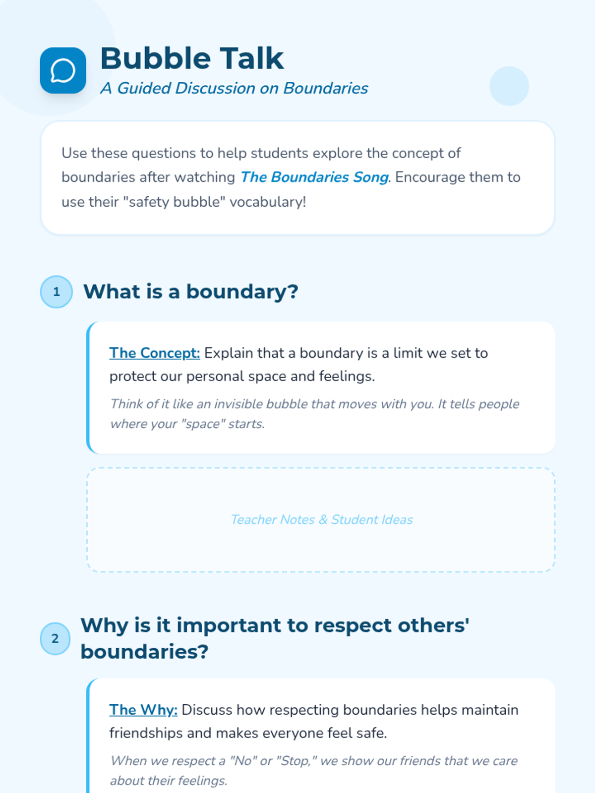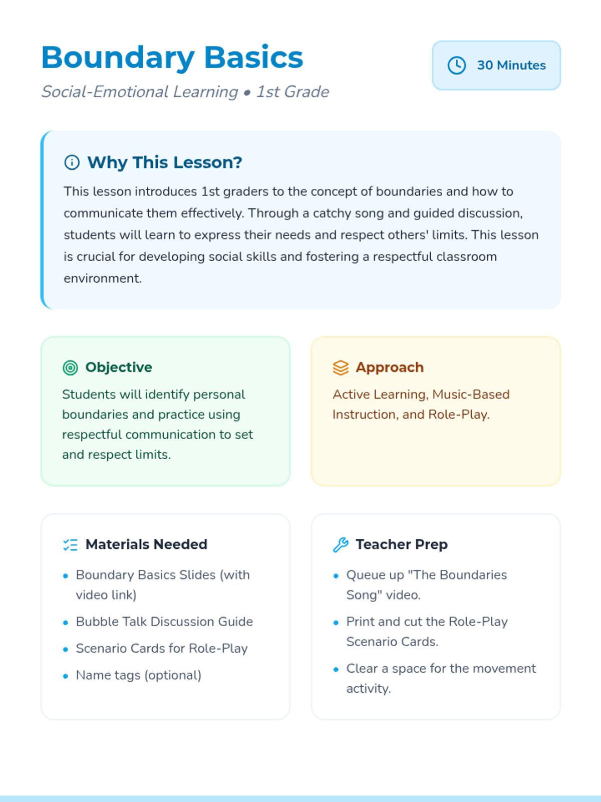 An introductory social-emotional learning lesson for 1st graders that uses music and role-play to teach the concept of personal boundaries and respectful communication.