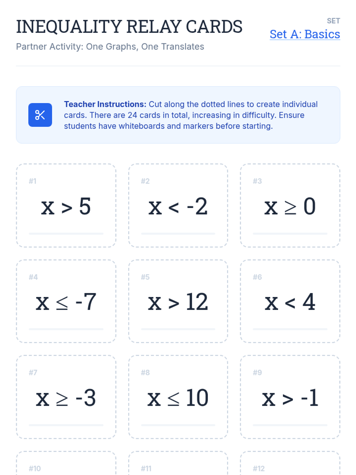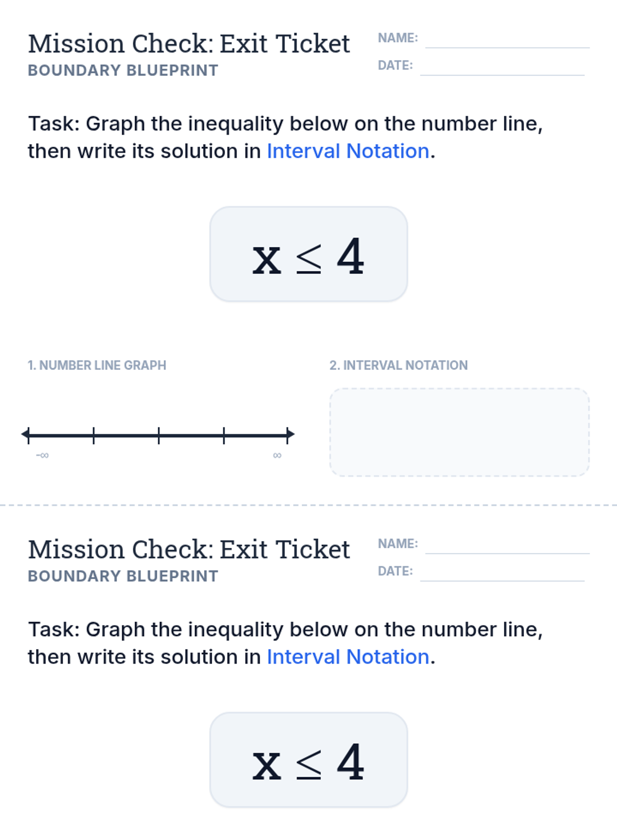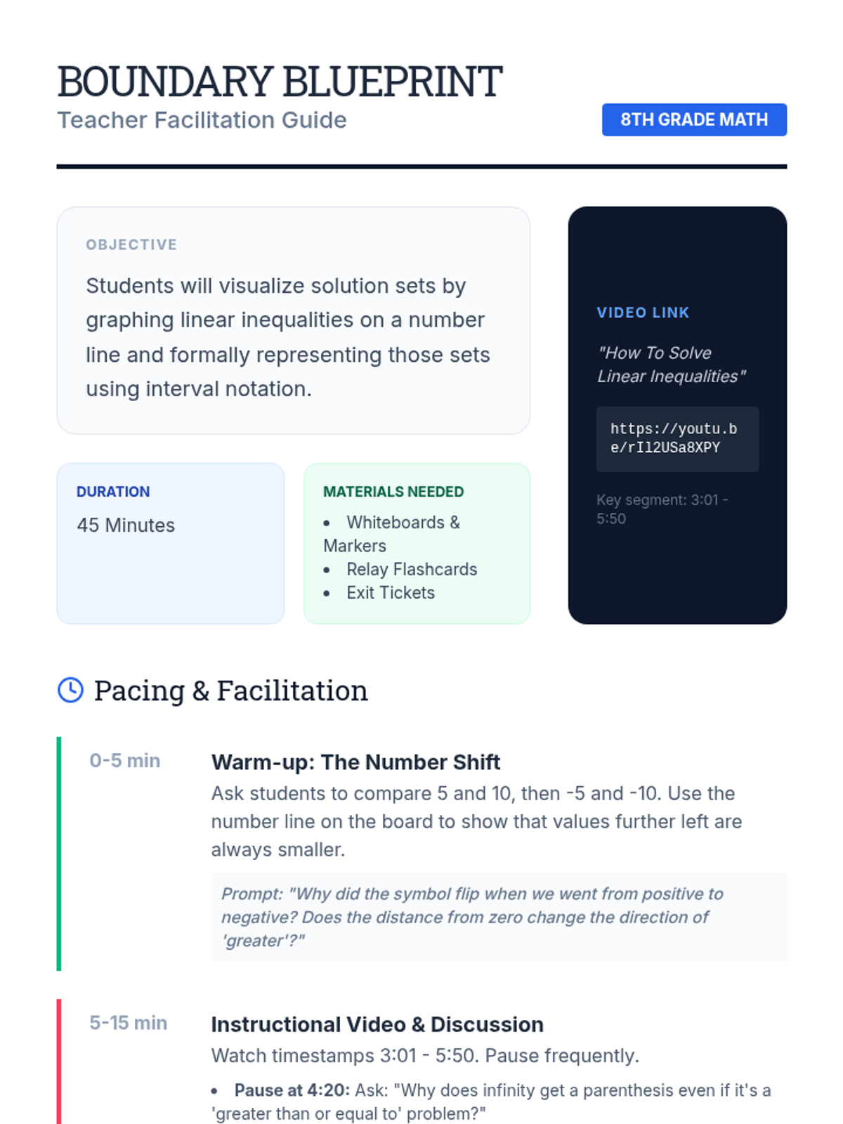 A comprehensive lesson for 8th-grade math students focusing on graphing linear inequalities on a number line and translating them into interval notation. Includes a visual presentation, a cooperative relay activity, and an exit ticket assessment.