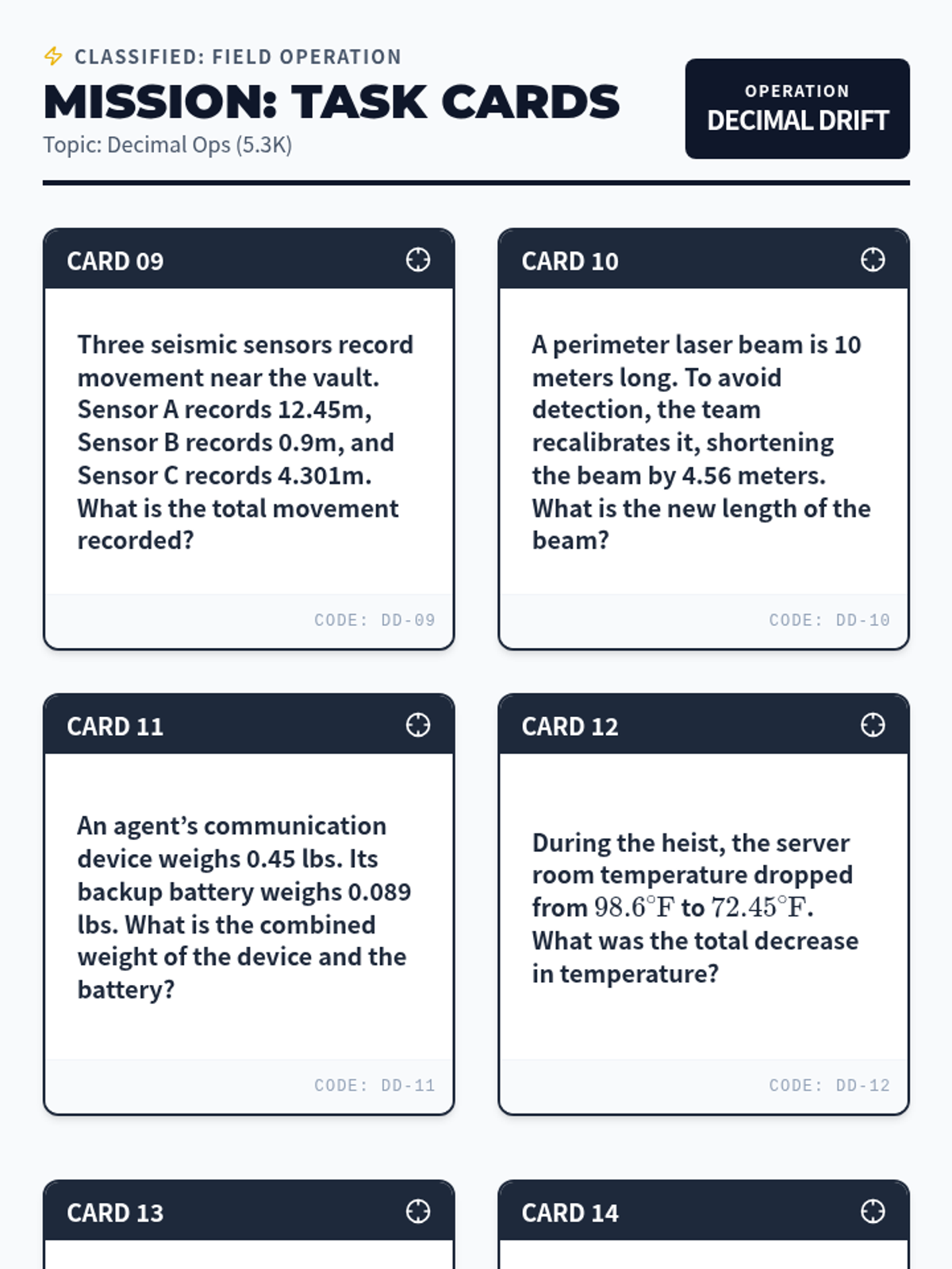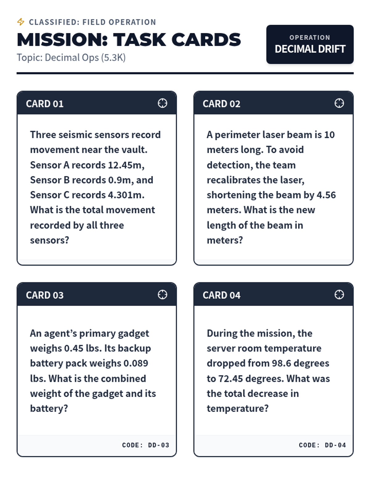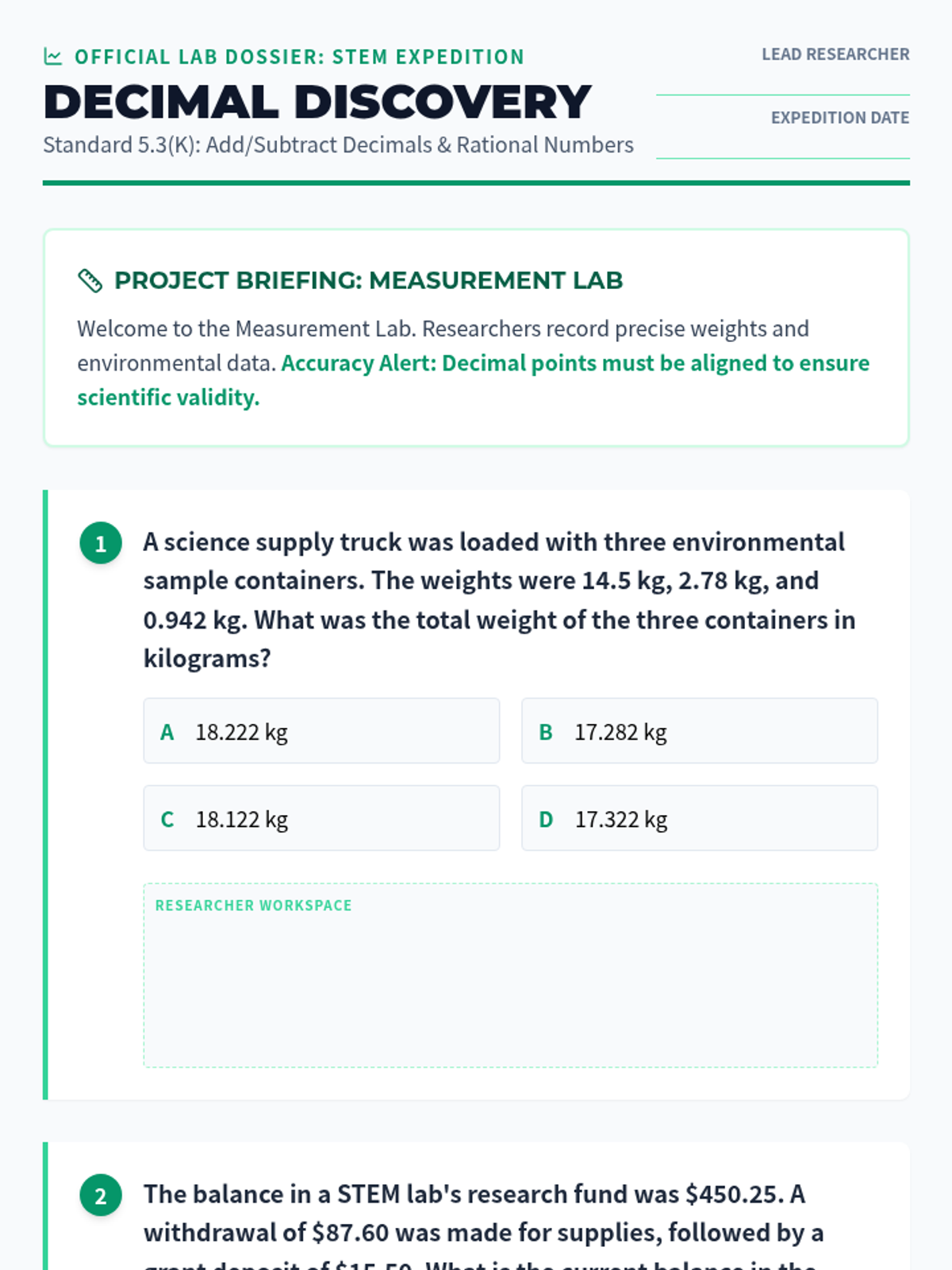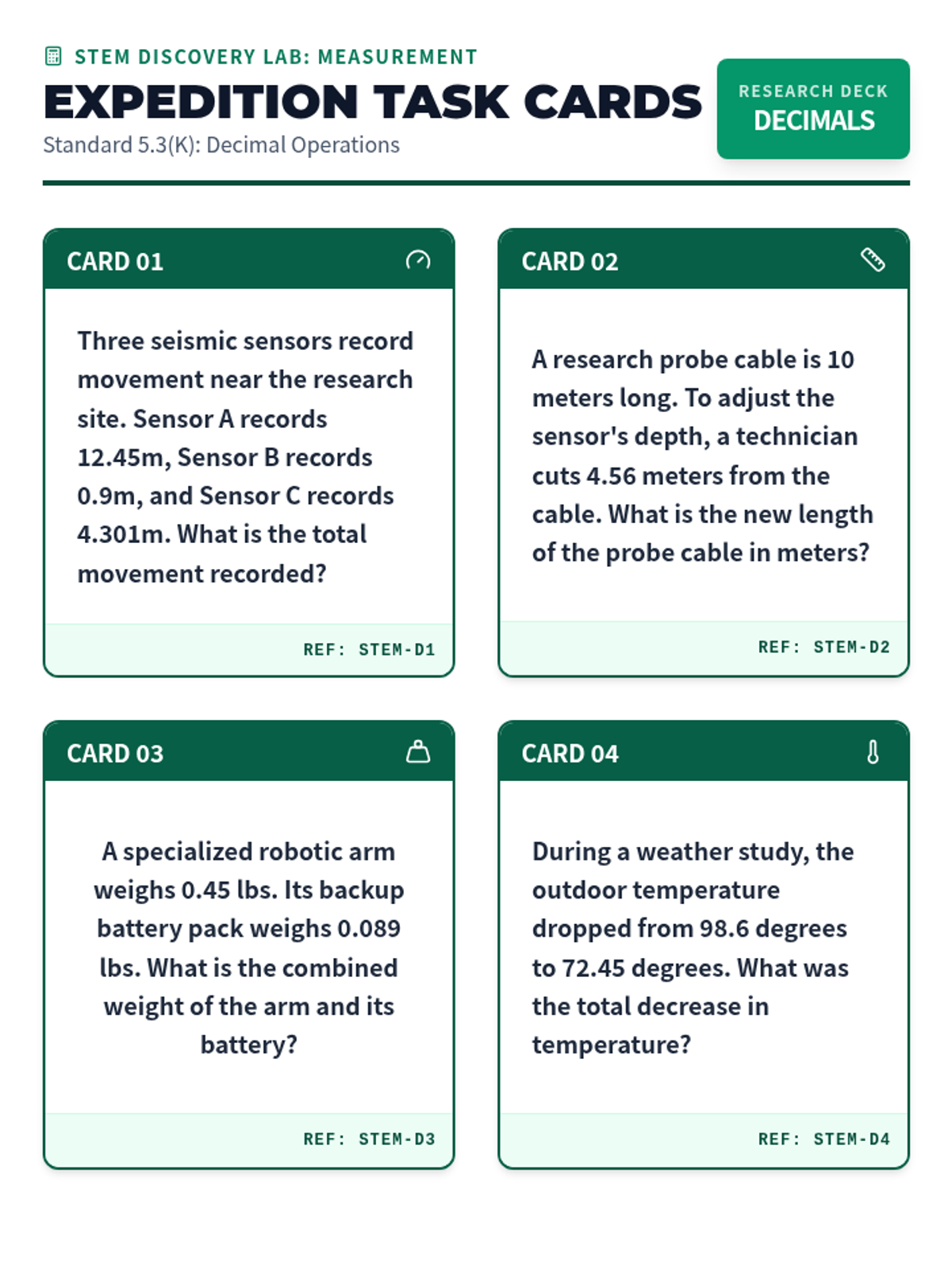 Deep dive into adding and subtracting decimals to the thousandths (5.3K) using measurement and data scenarios.