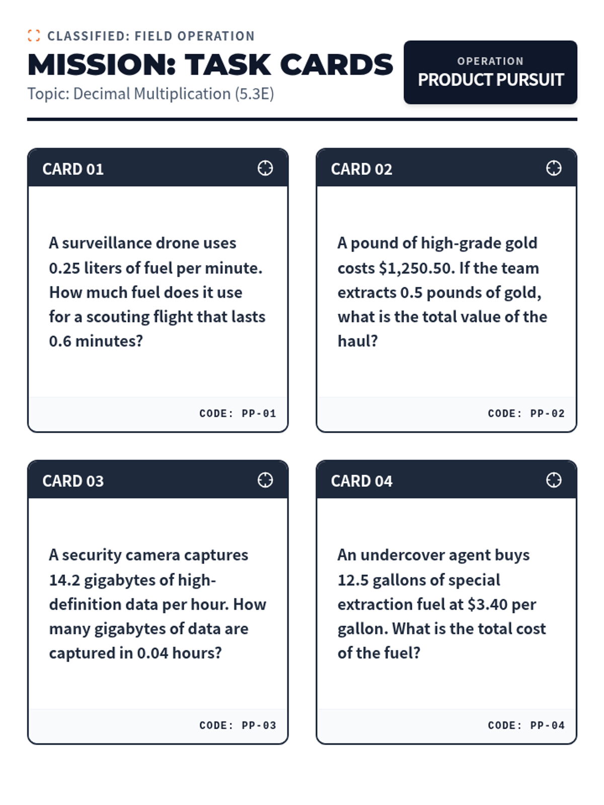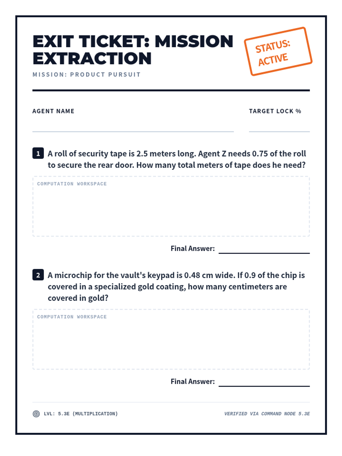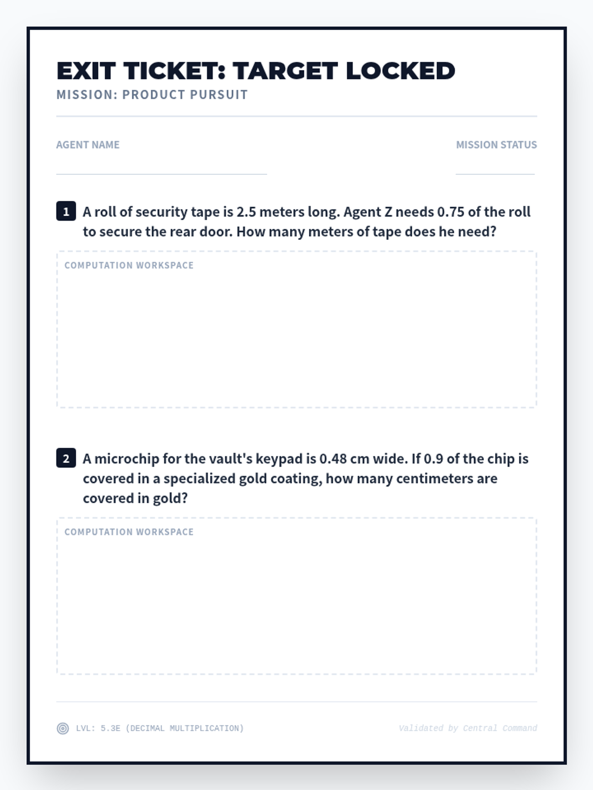 Mastering decimal multiplication (5.3E) through engineering and scaling word problems.