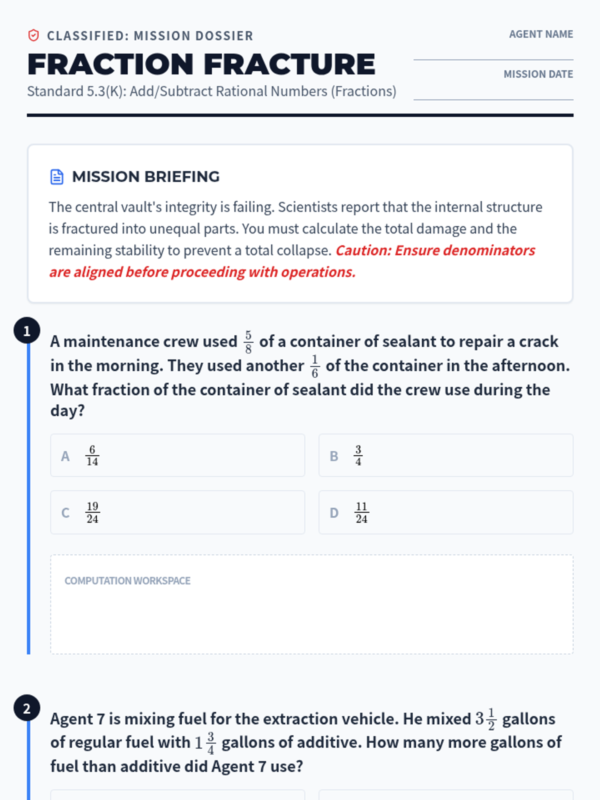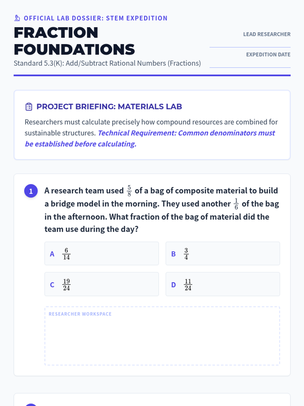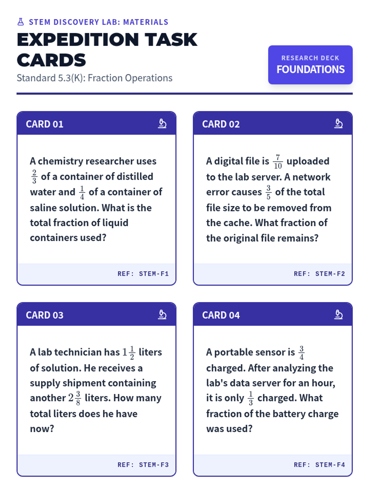 Focuses on adding and subtracting fractions with unequal denominators (5.3K) through lab-based word problems.