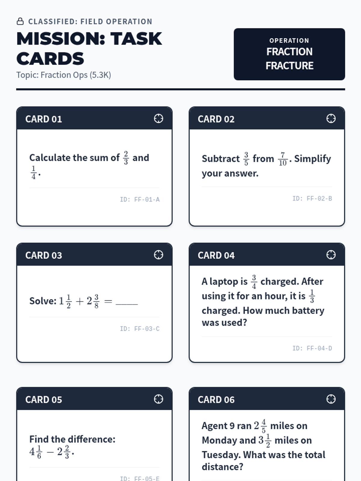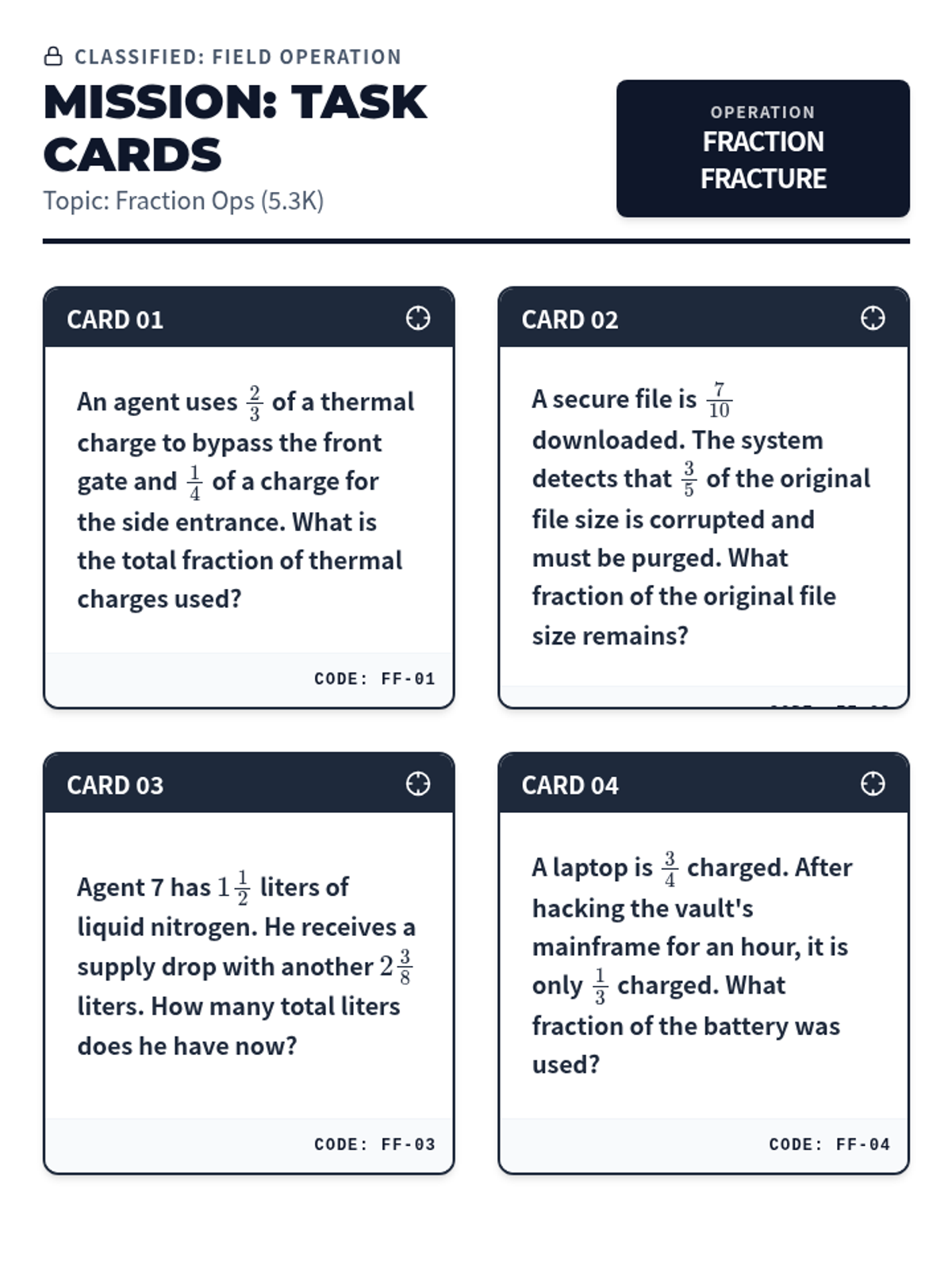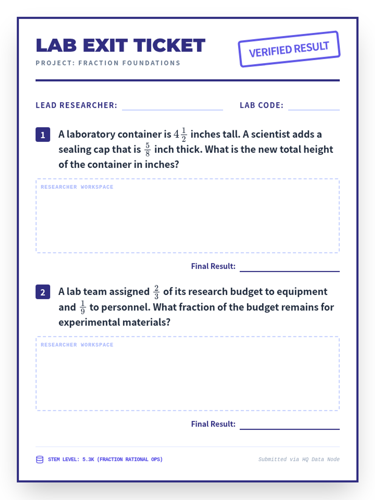 Focuses on adding and subtracting fractions with unequal denominators (5.3K) through lab-based word problems.