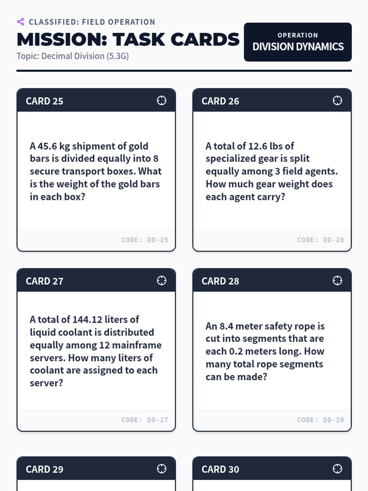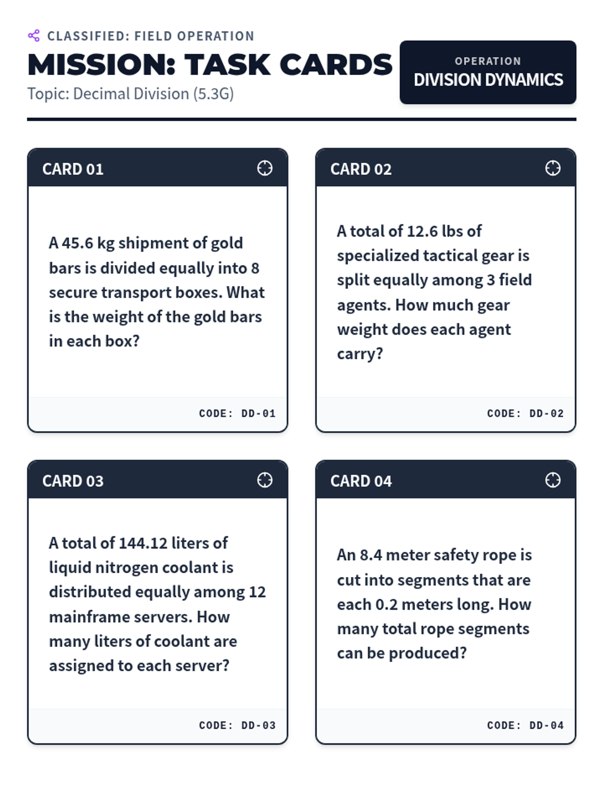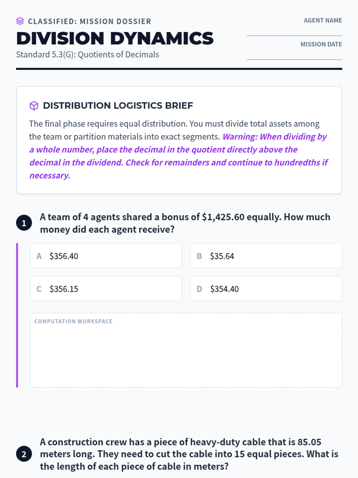 Solving for decimal quotients (5.3G) using distribution and logistics word problems.