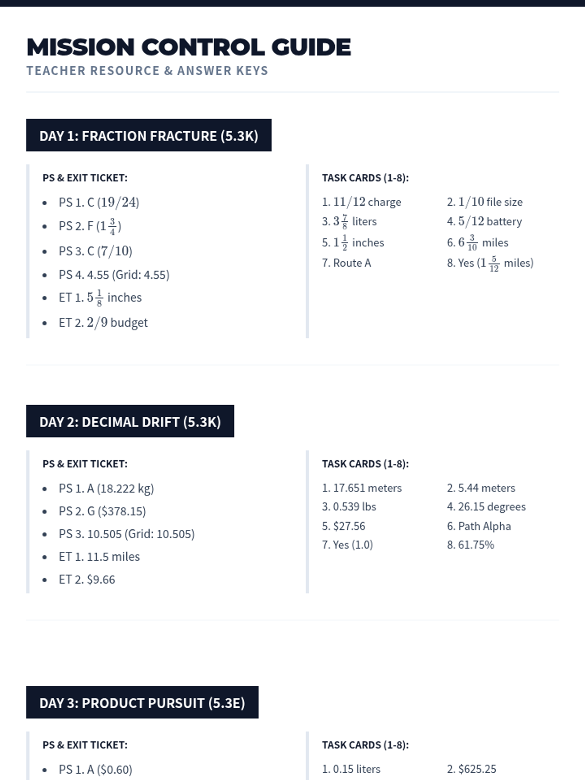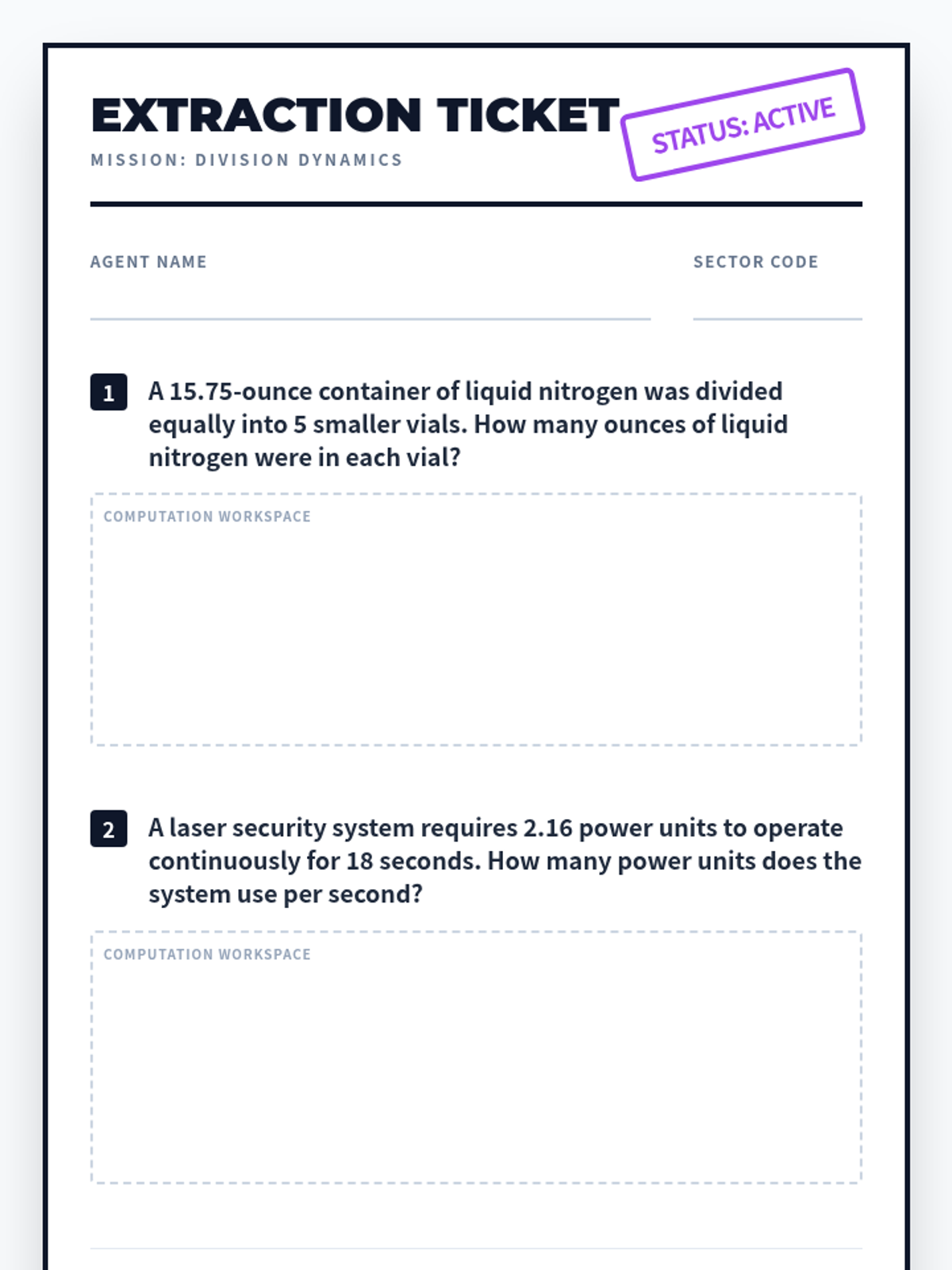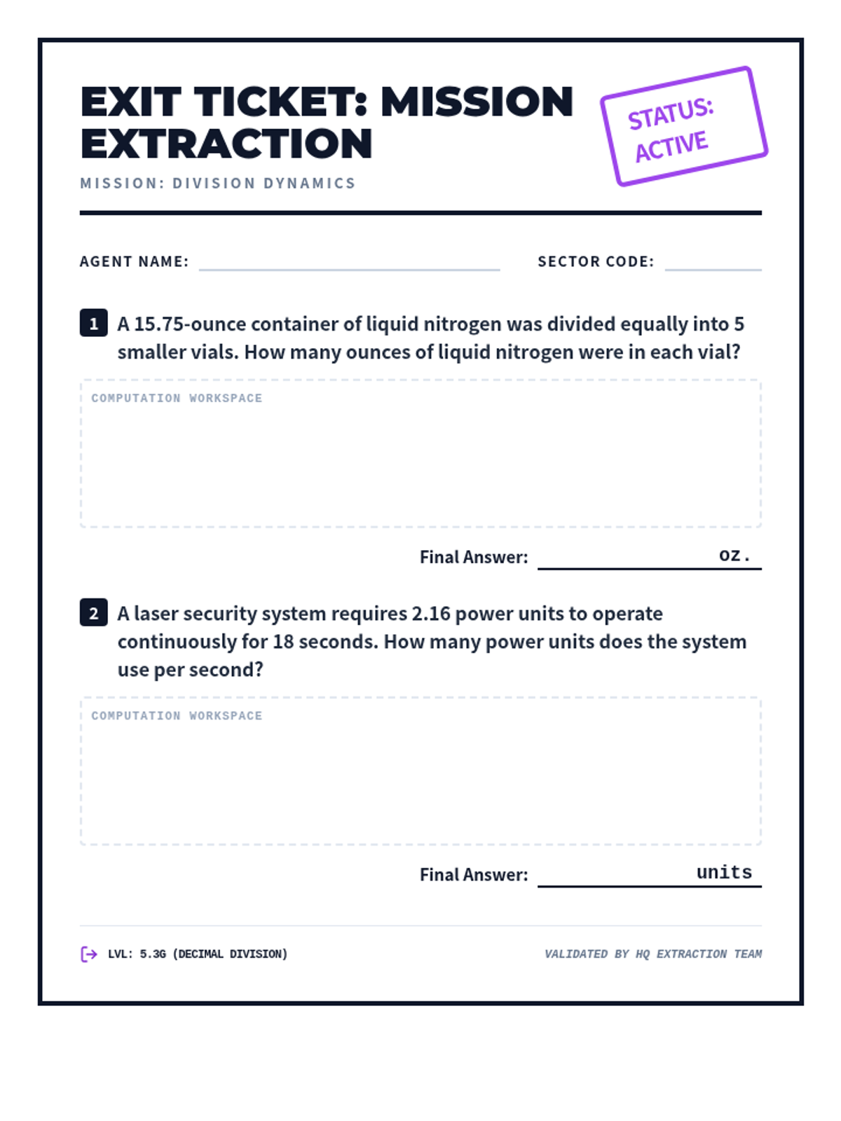 Solving for decimal quotients (5.3G) using distribution and logistics word problems.