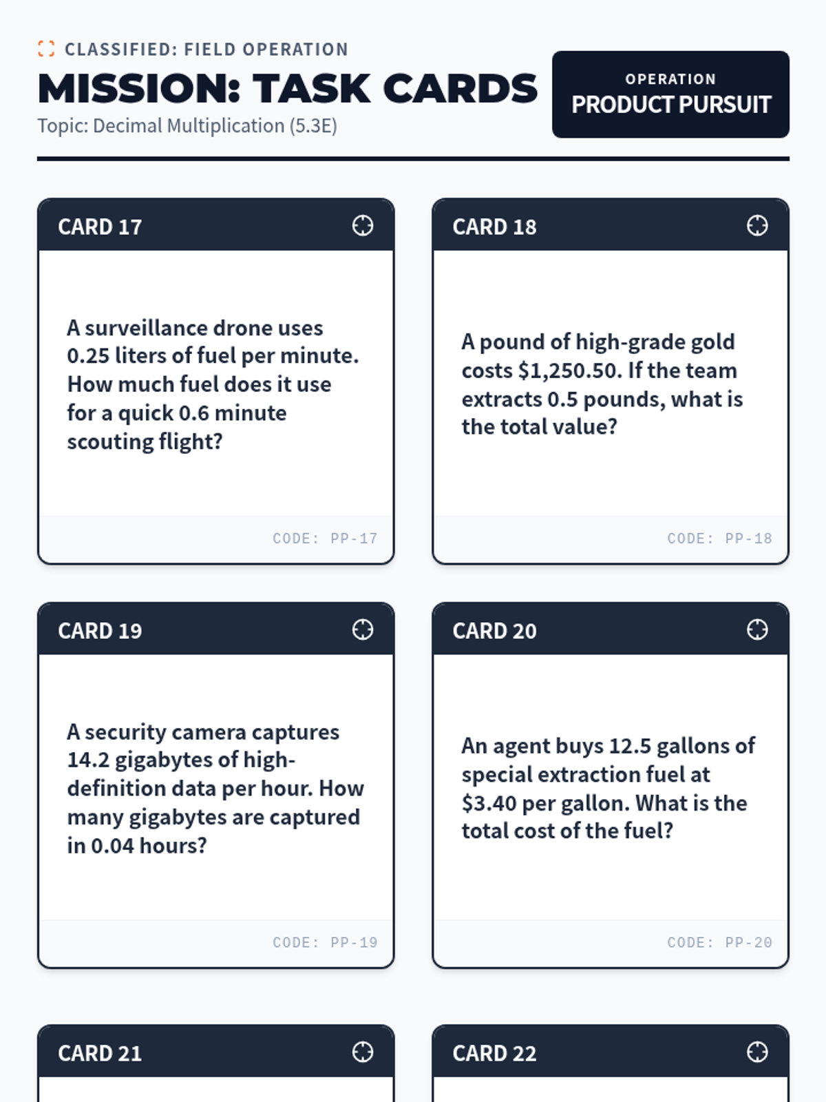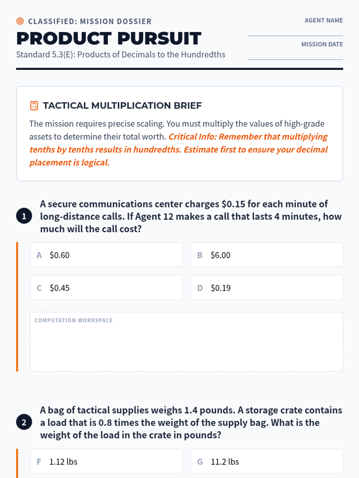 Mastering decimal multiplication using place-value strategies and models (5.3E).