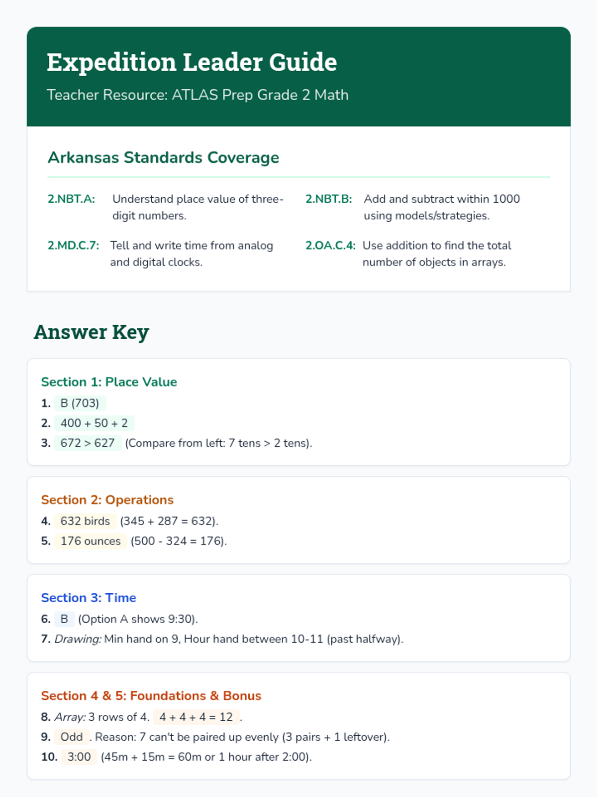 A comprehensive review lesson for Grade 2 math standards, focusing on place value, addition/subtraction within 1000, time-telling, and foundational multiplication through arrays. Includes visual models and word problems set in the Ozark mountains.