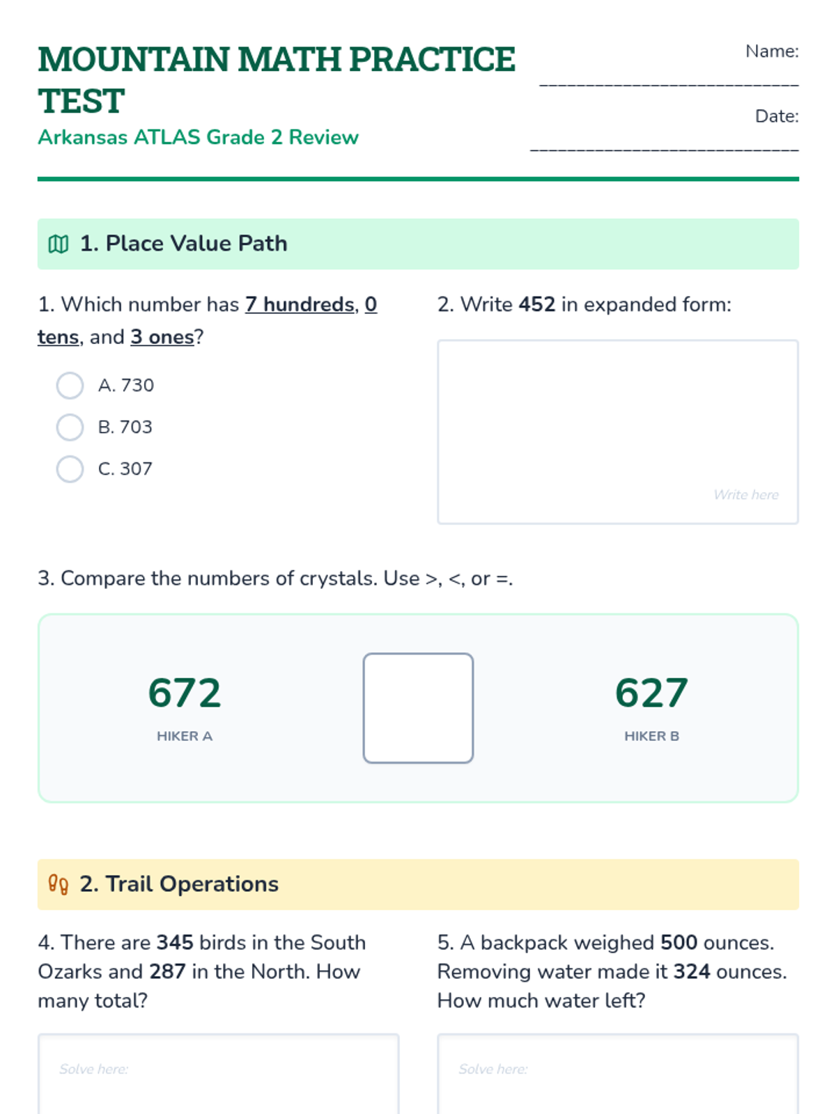 A comprehensive Kindergarten math test prep lesson aligned to Arkansas ATLAS standards, focusing on counting to 20, number sense, basic operations, and geometry through a hiking and mountain climbing theme.