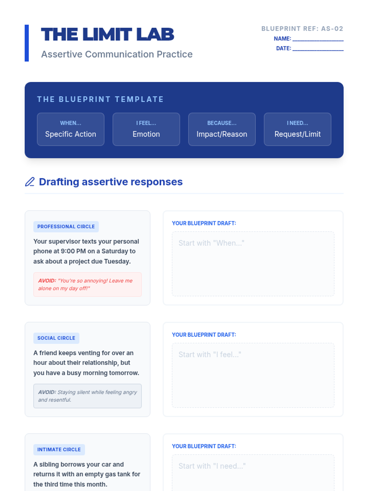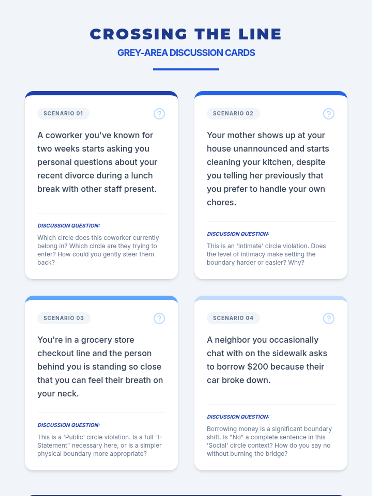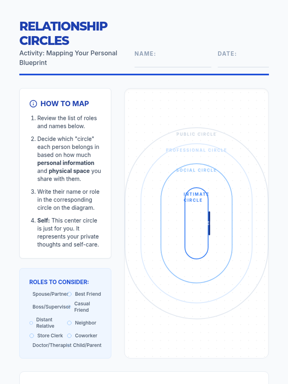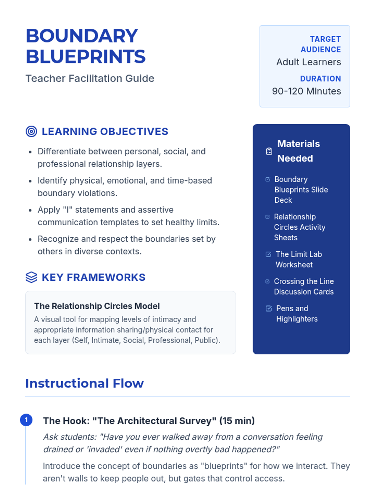 A comprehensive lesson for adult learners on navigating personal, social, and professional boundaries using visual mapping and assertive communication frameworks.