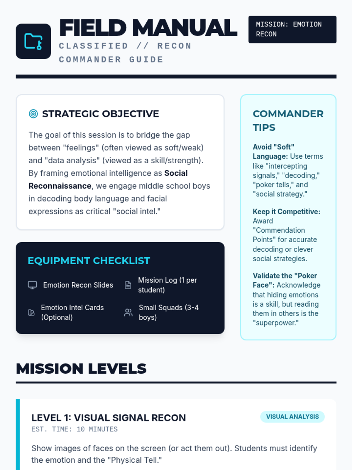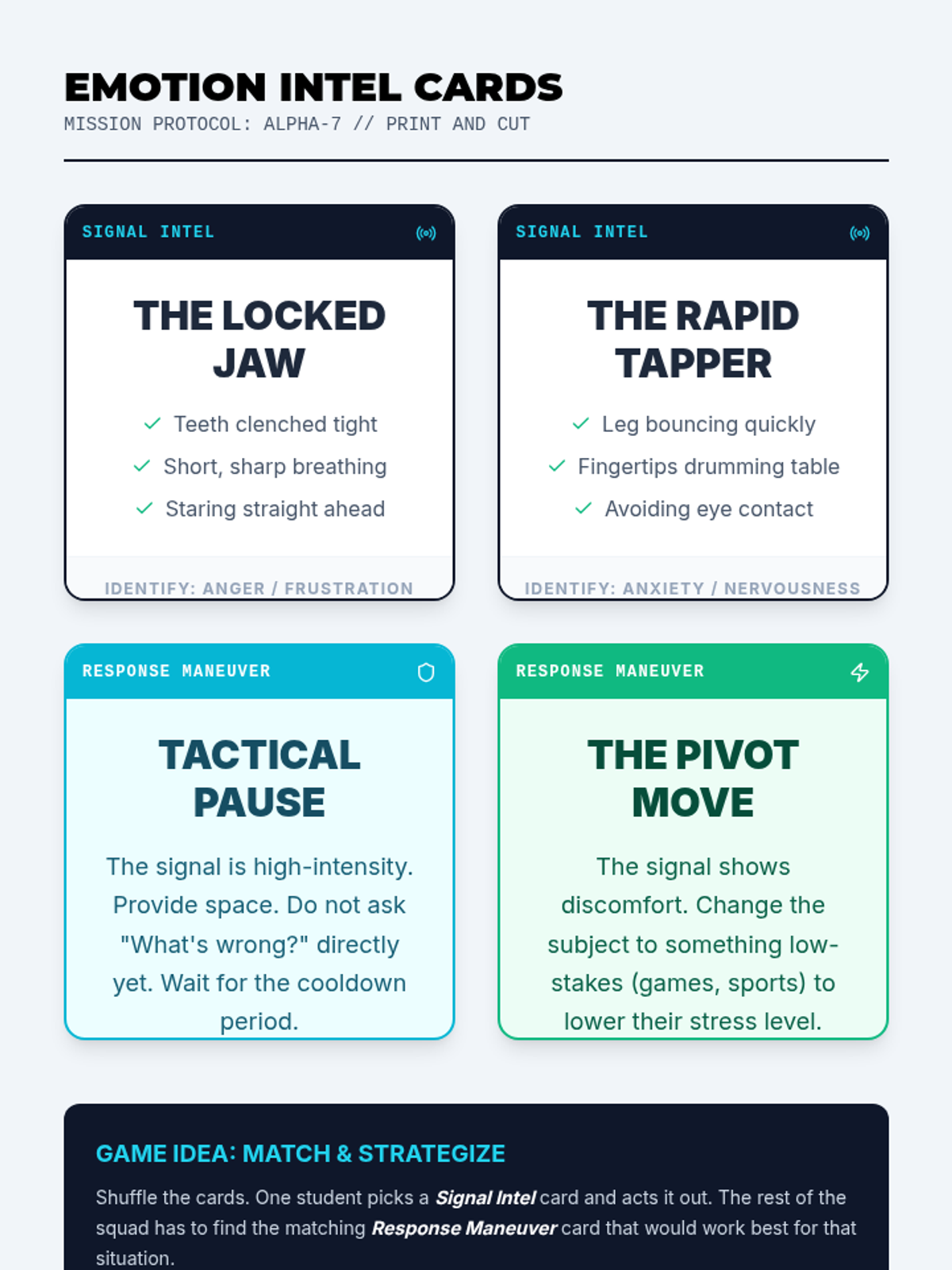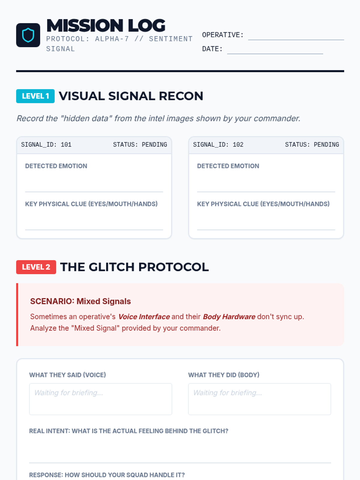 An introductory lesson where students decode emotional signals using a tactical gaming-inspired framework.