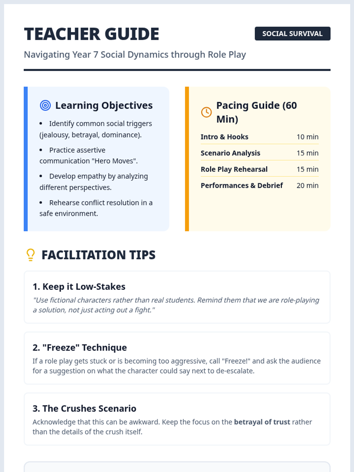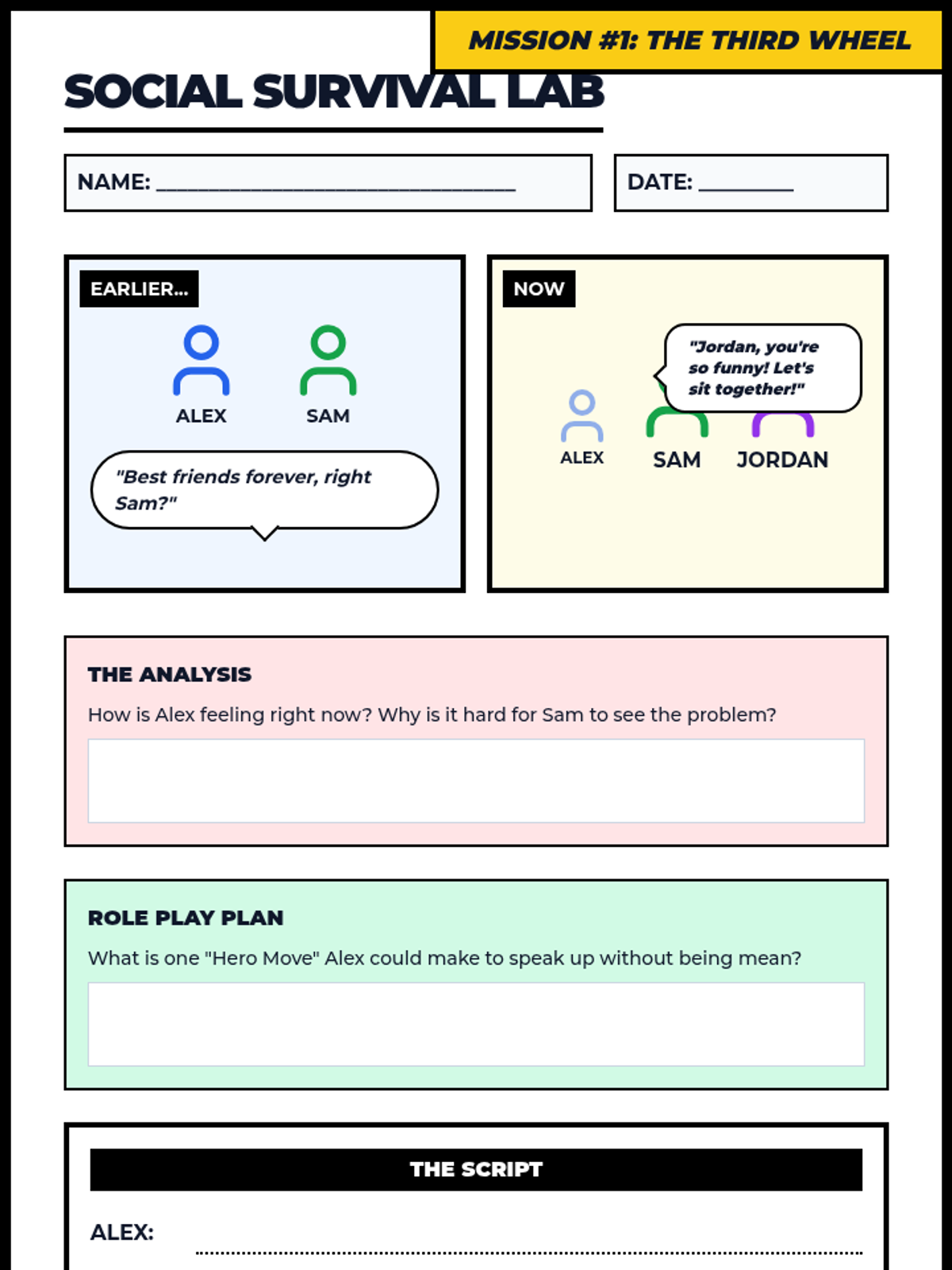 A lesson focused on navigating complex social dynamics in middle school, using role-play and comic-style scenarios to build empathy and conflict resolution skills.