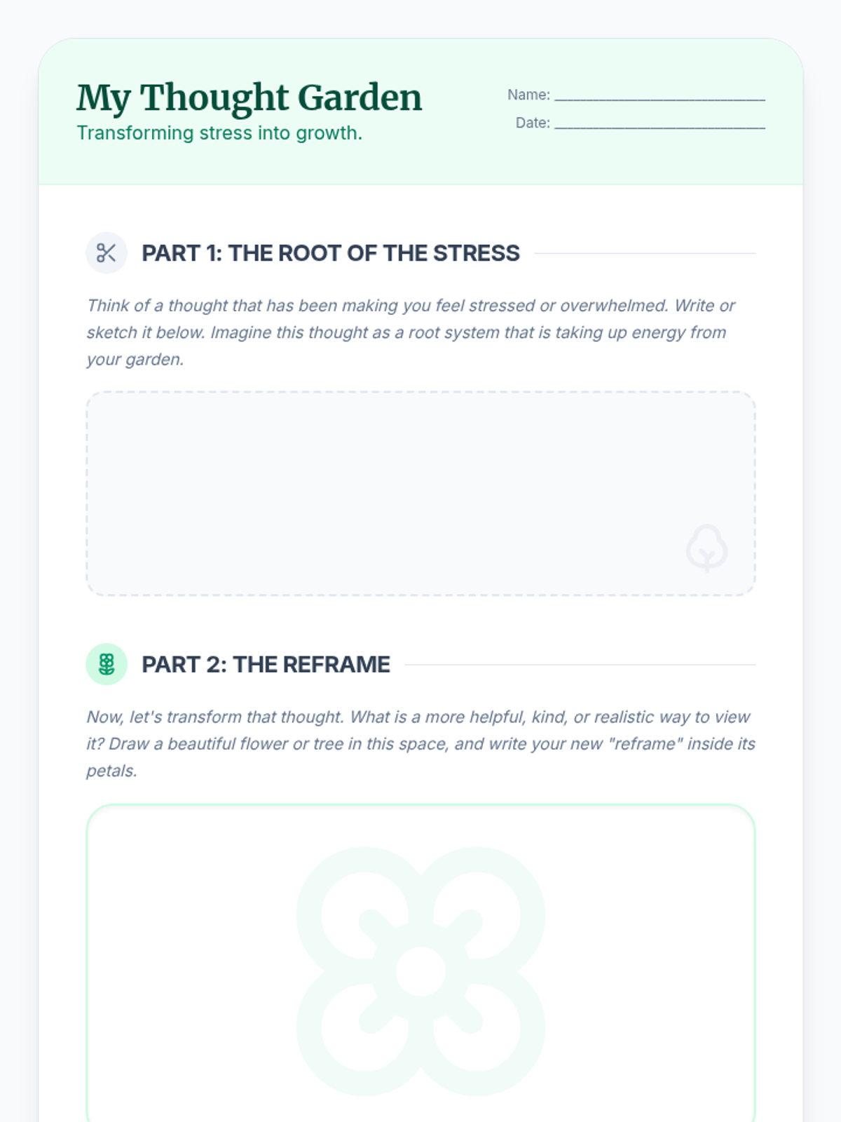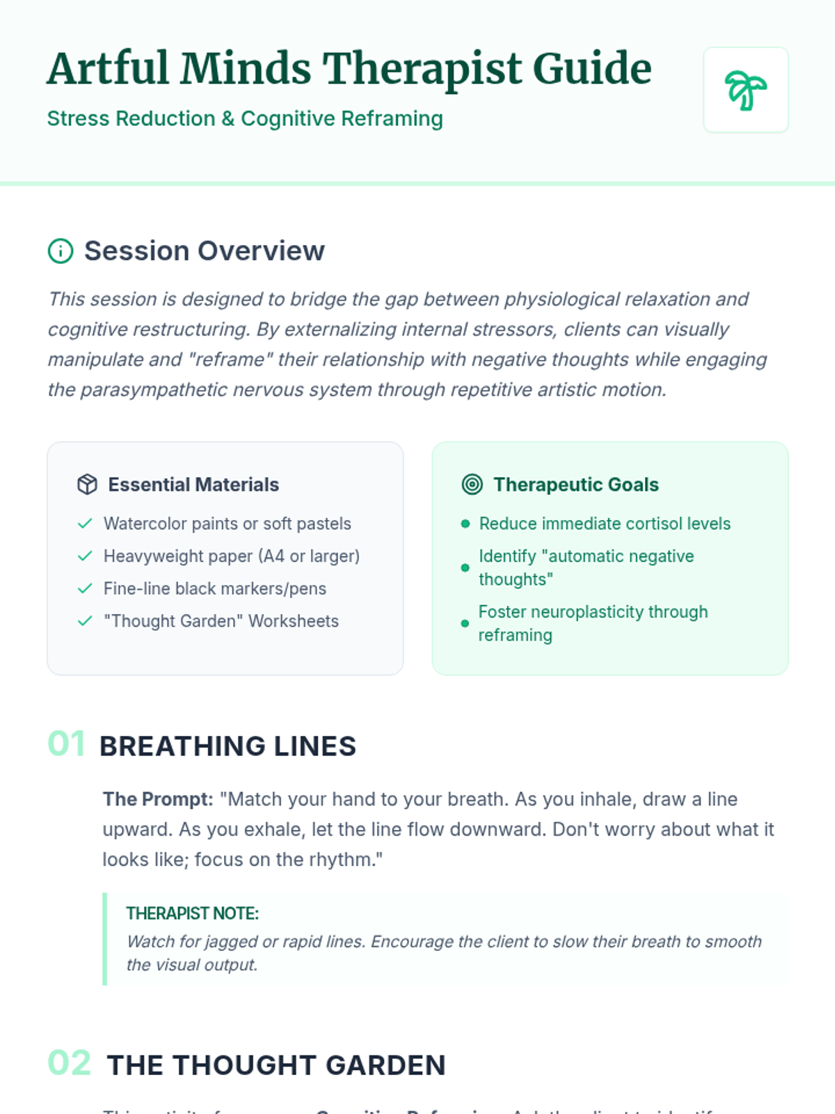 A therapeutic art session focused on reducing stress and cognitively reframing negative thought patterns through guided creative activities.