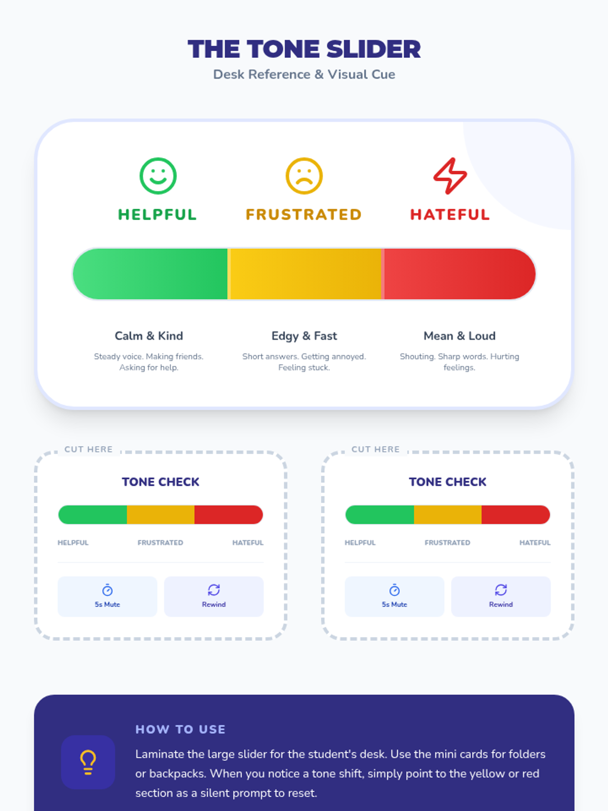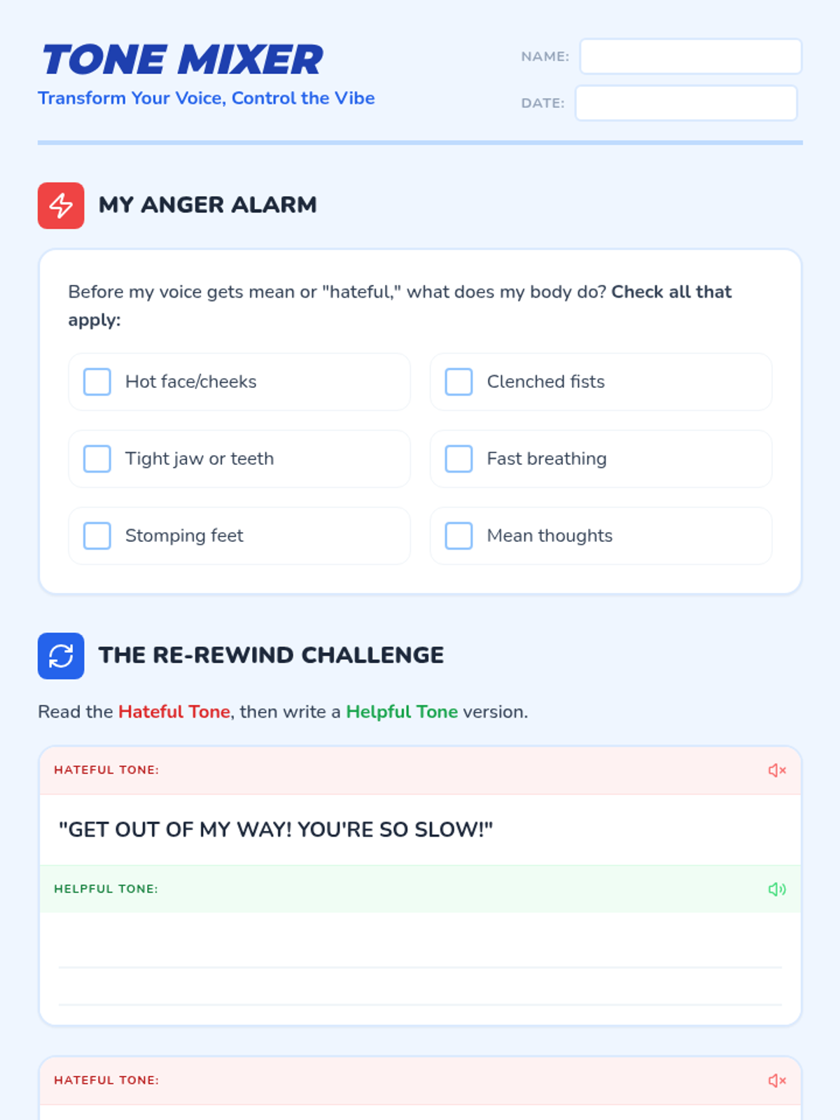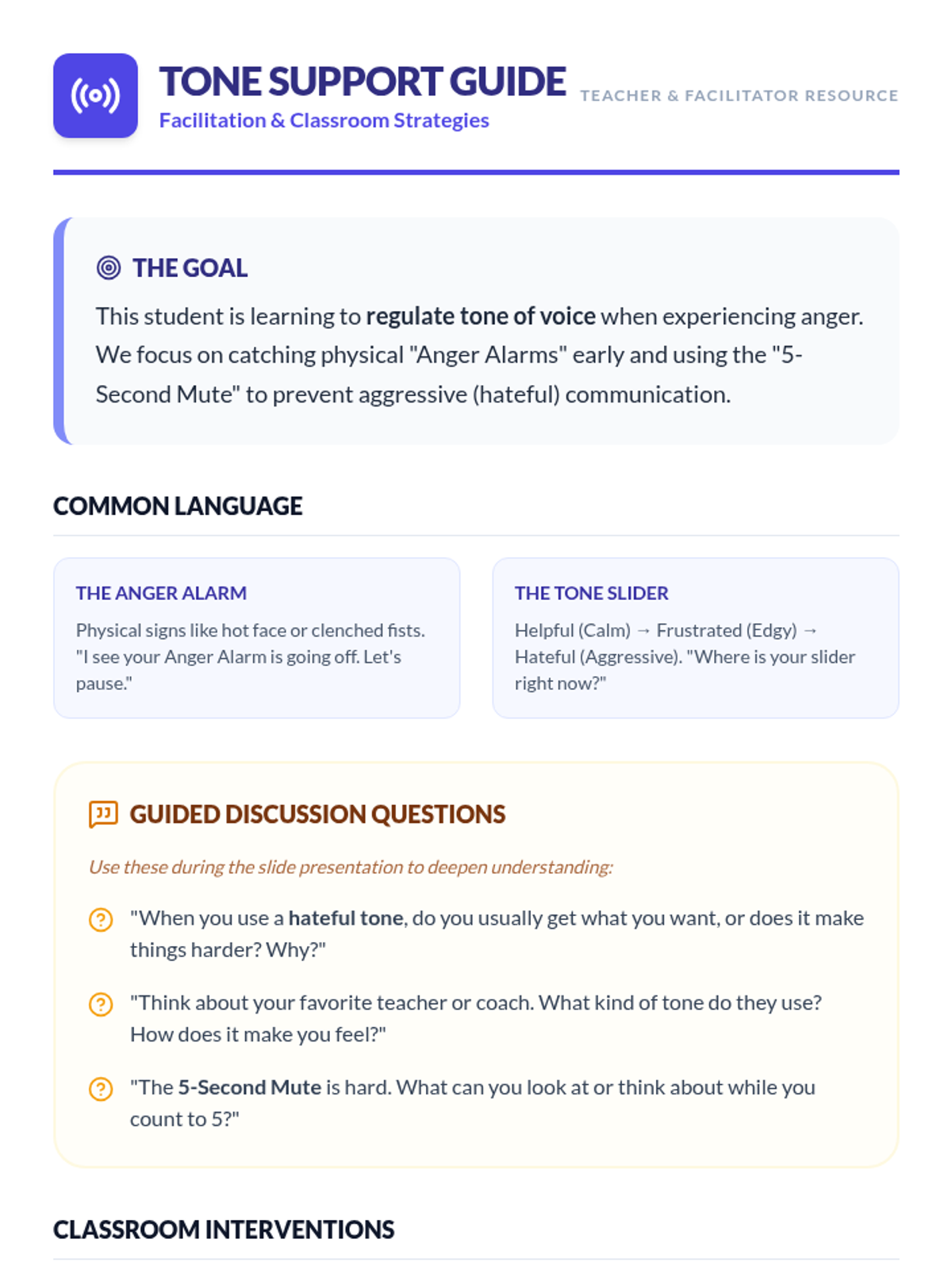 This lesson focuses on helping students identify physical triggers for anger, understand the impact of their tone of voice, and practice specific 'cool down' strategies to maintain respectful communication.