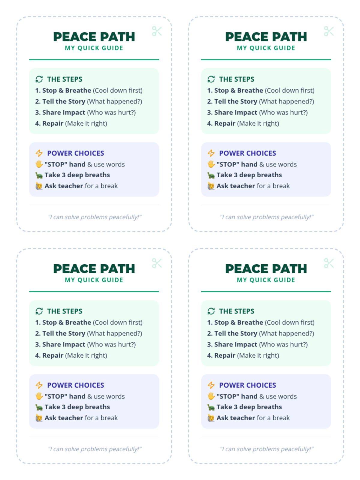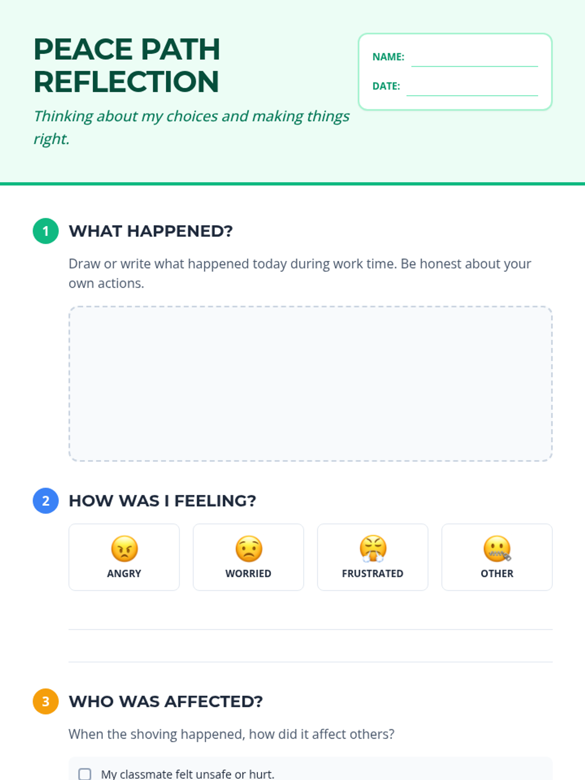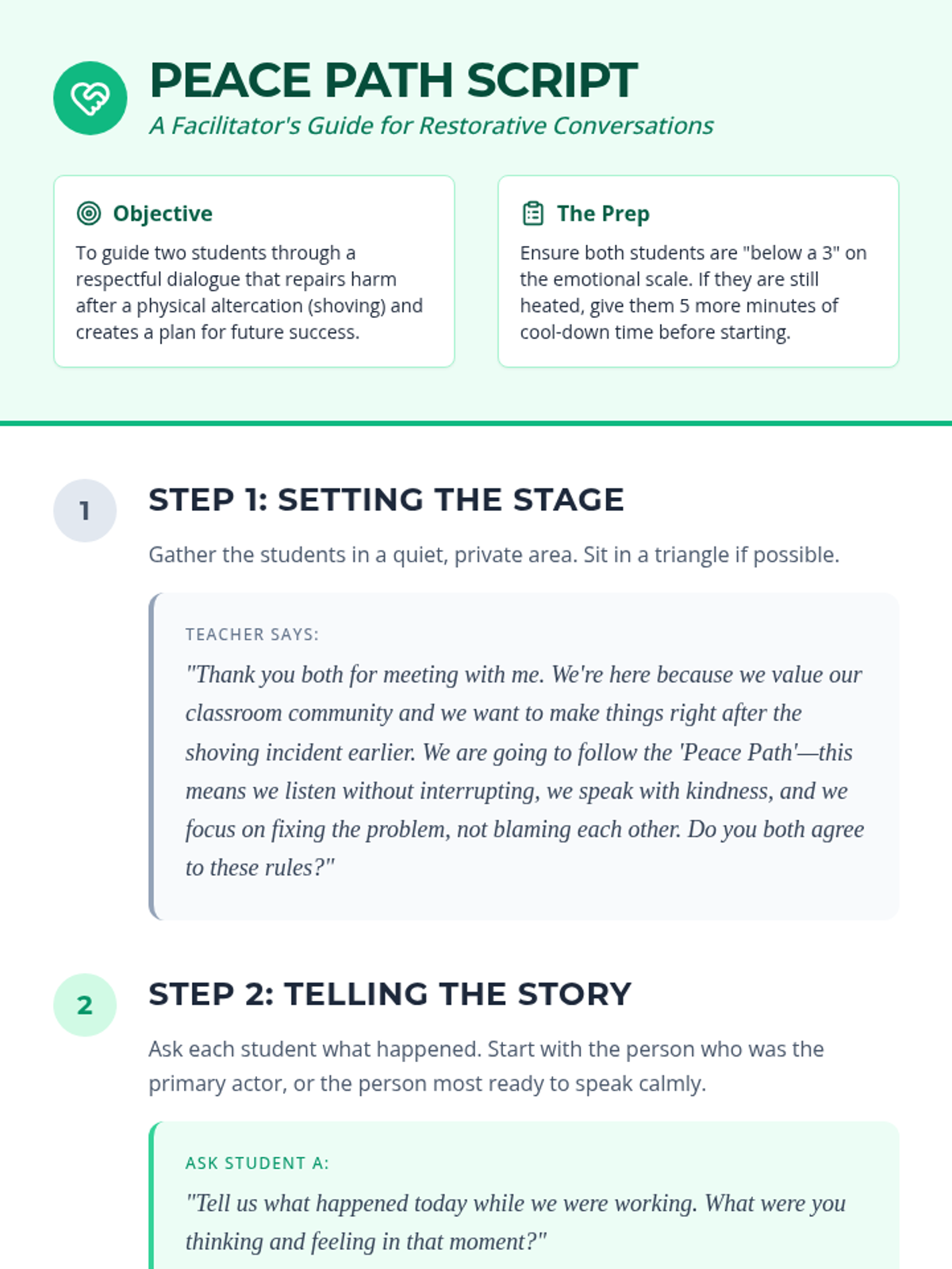 A restorative practice framework designed for 3rd-grade students to resolve conflicts, specifically focusing on physical altercations like shoving. It includes a structured facilitator script, a student reflection tool, and a desk-side conflict resolution card.