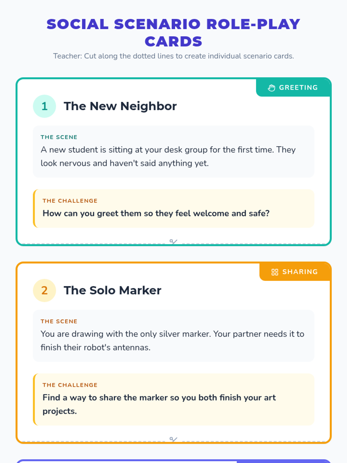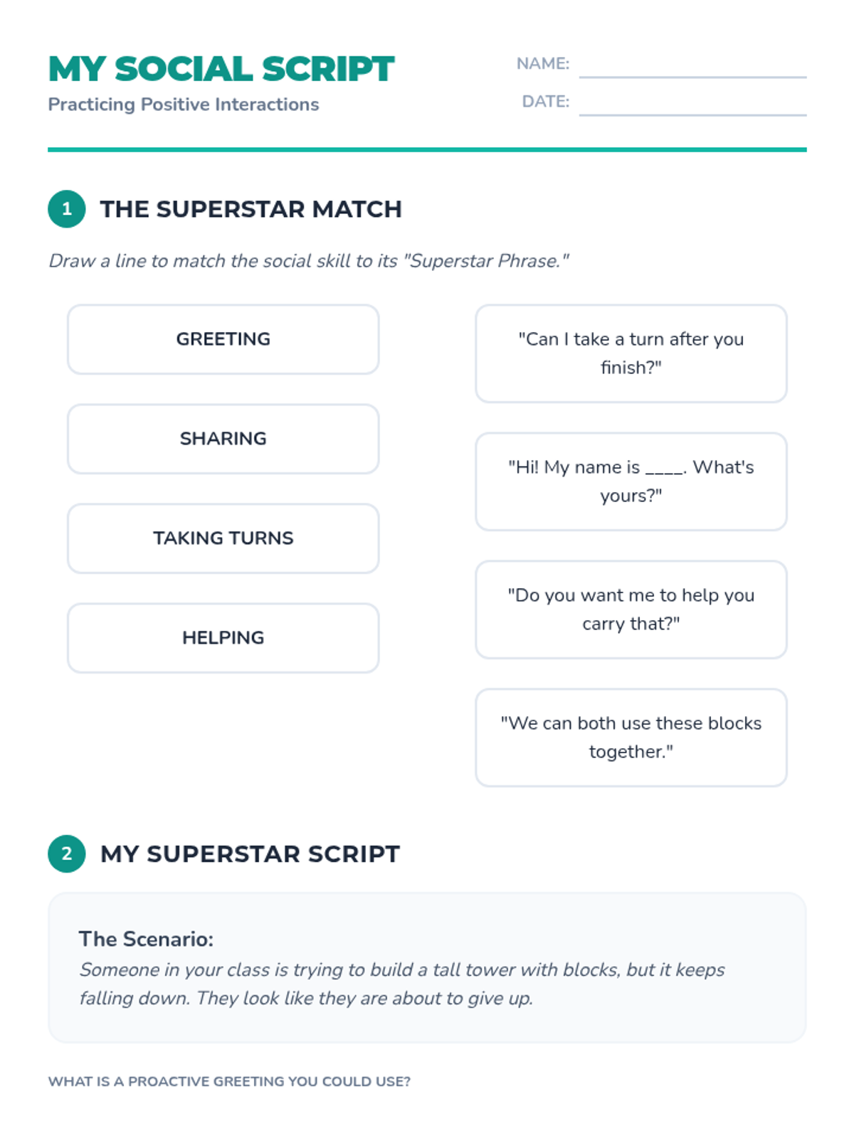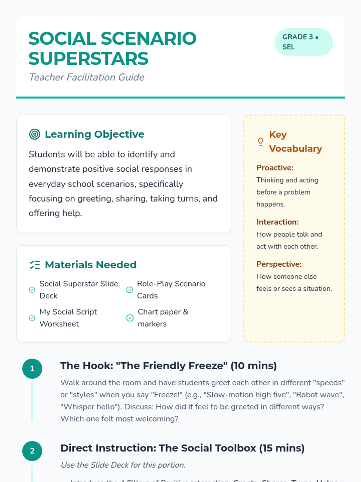 A comprehensive SEL lesson for 3rd graders focused on practicing positive social interactions through role-play and scenario analysis. Students learn specific skills for greeting, sharing, and helping others to build stronger peer relationships.