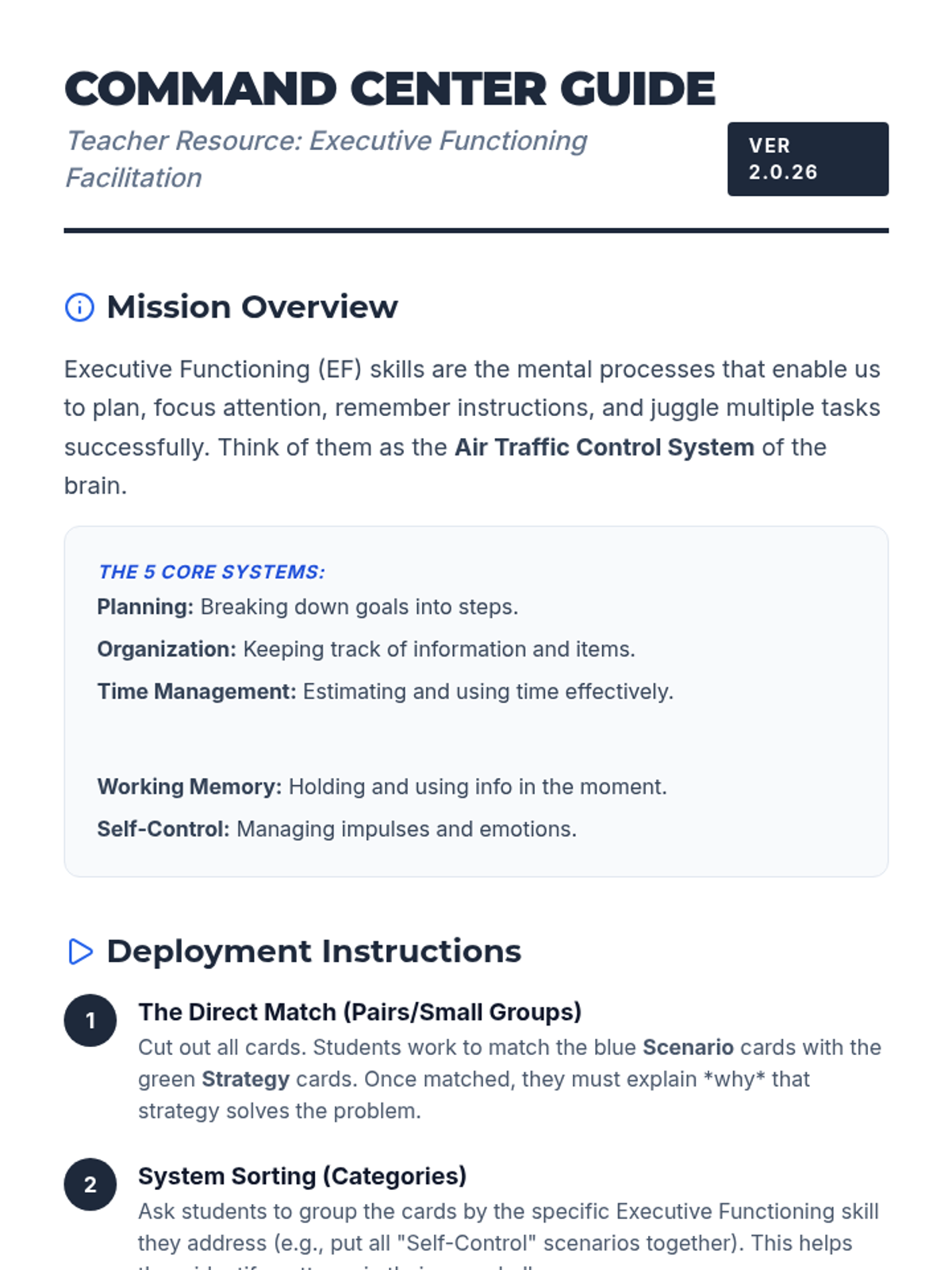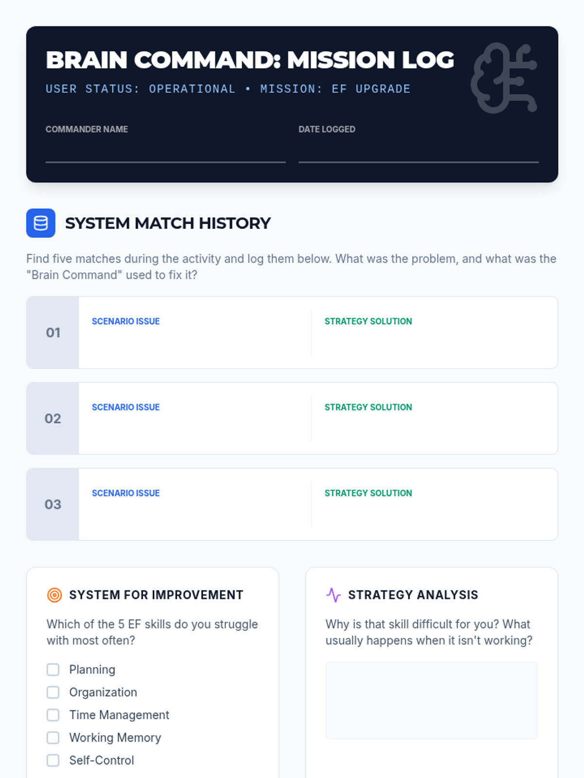 A comprehensive lesson designed to help students identify and apply executive functioning skills through real-world scenarios and interactive matching.