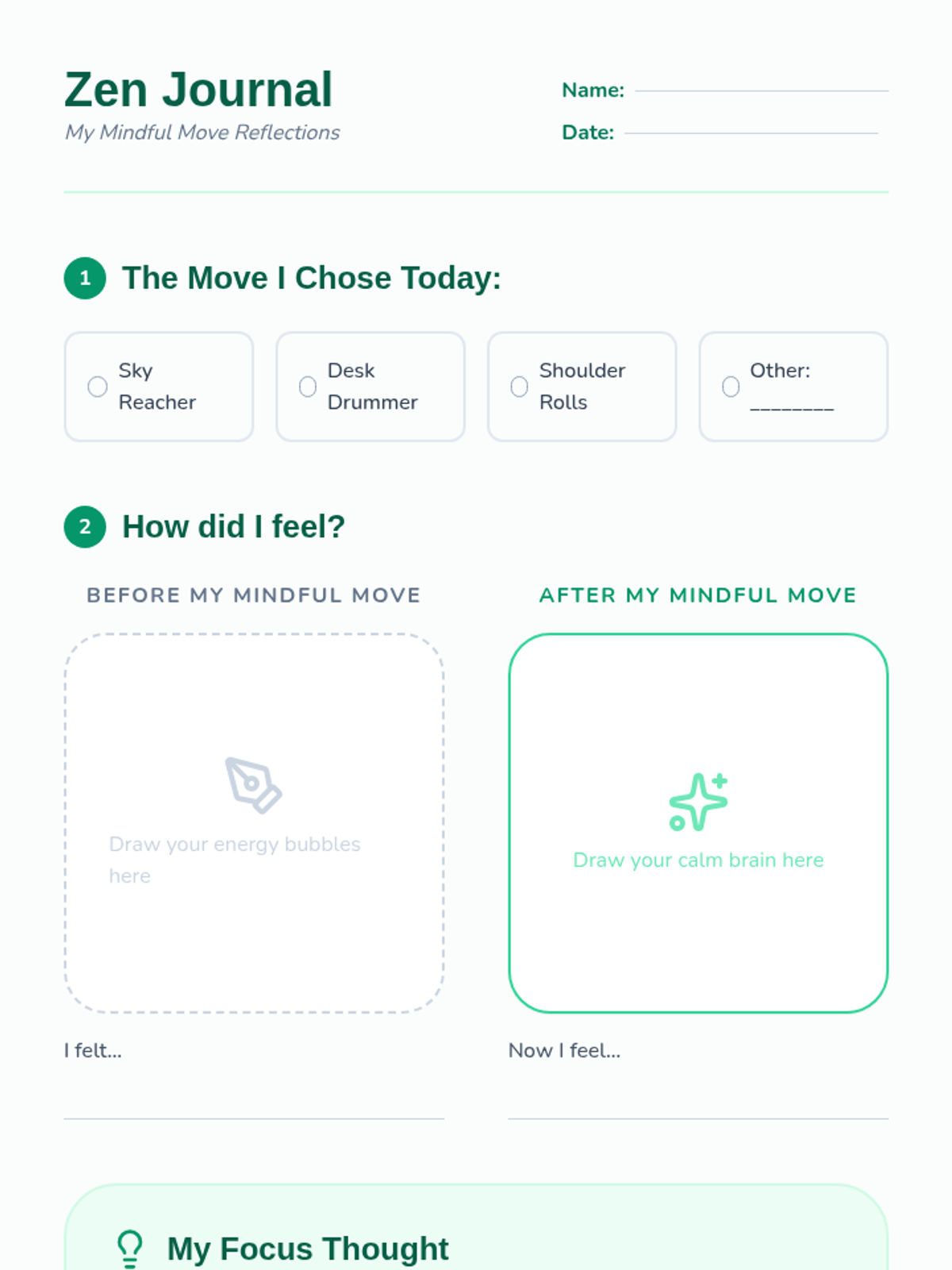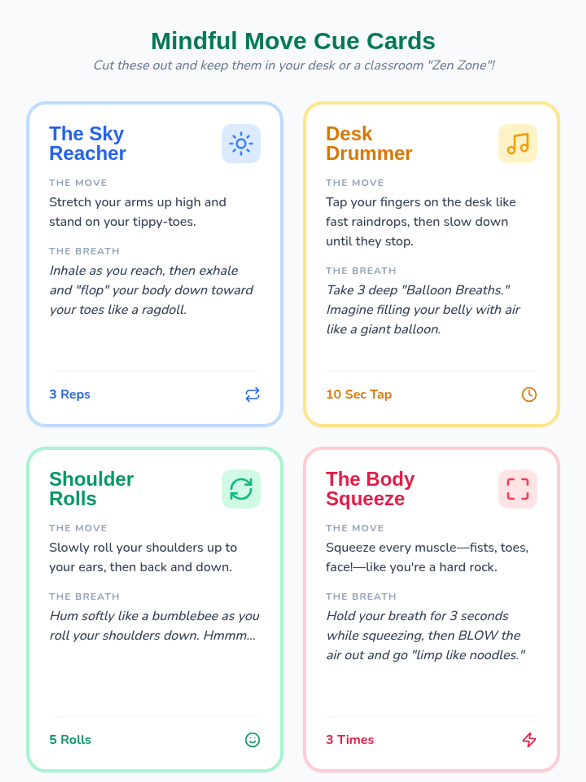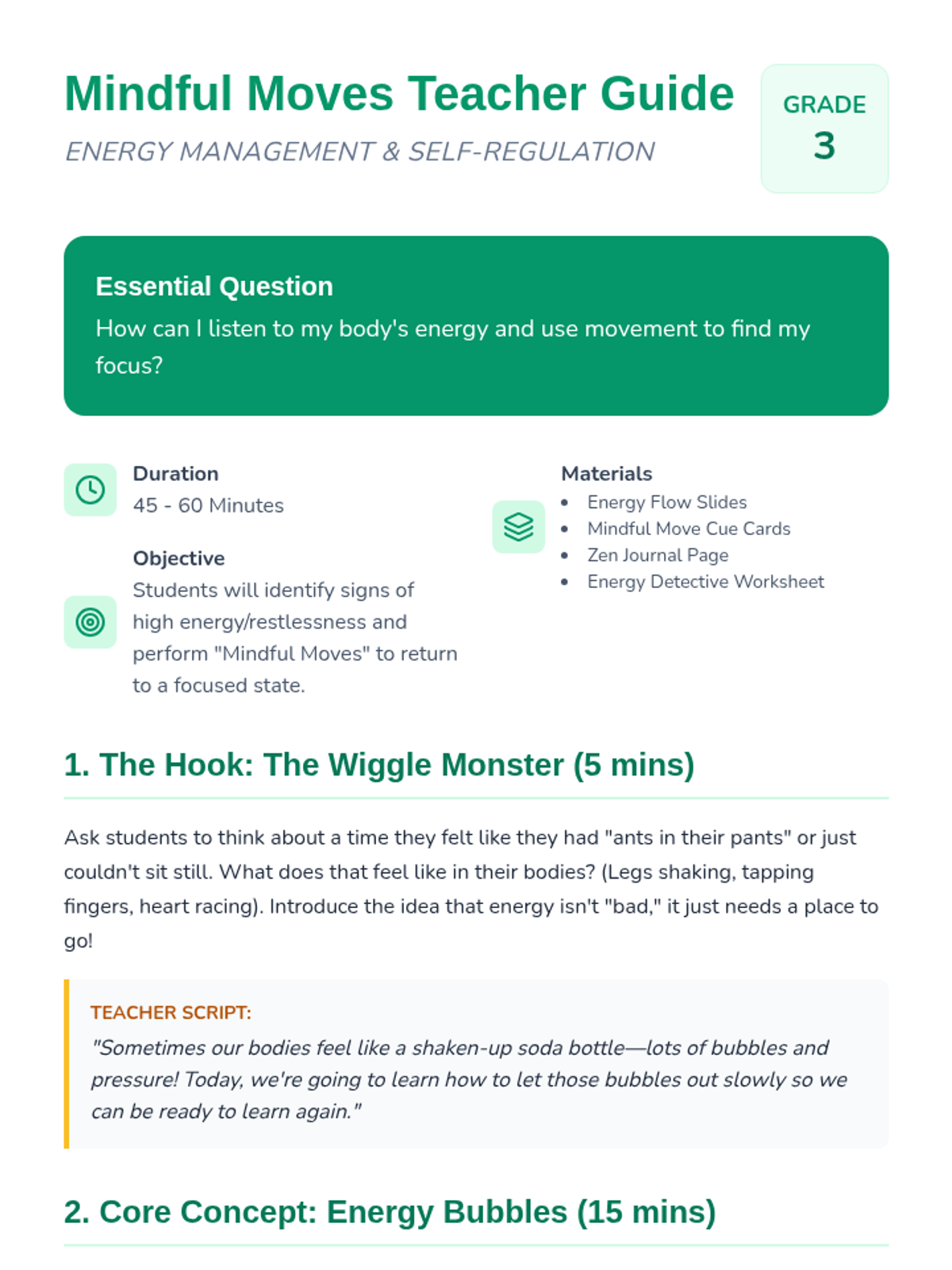 A lesson for 3rd graders on recognizing restlessness and using 'mindful moves'—combinations of physical activity and breathing—to regulate energy levels and return to a focused state.