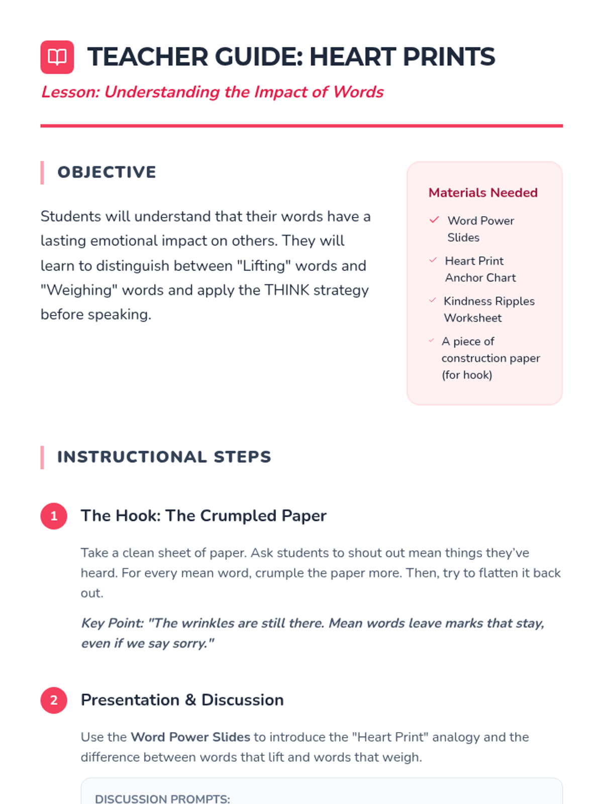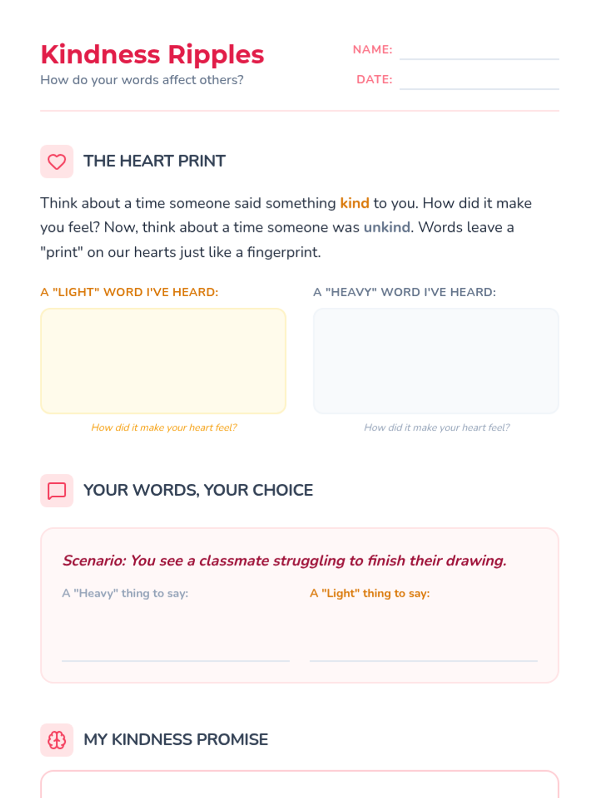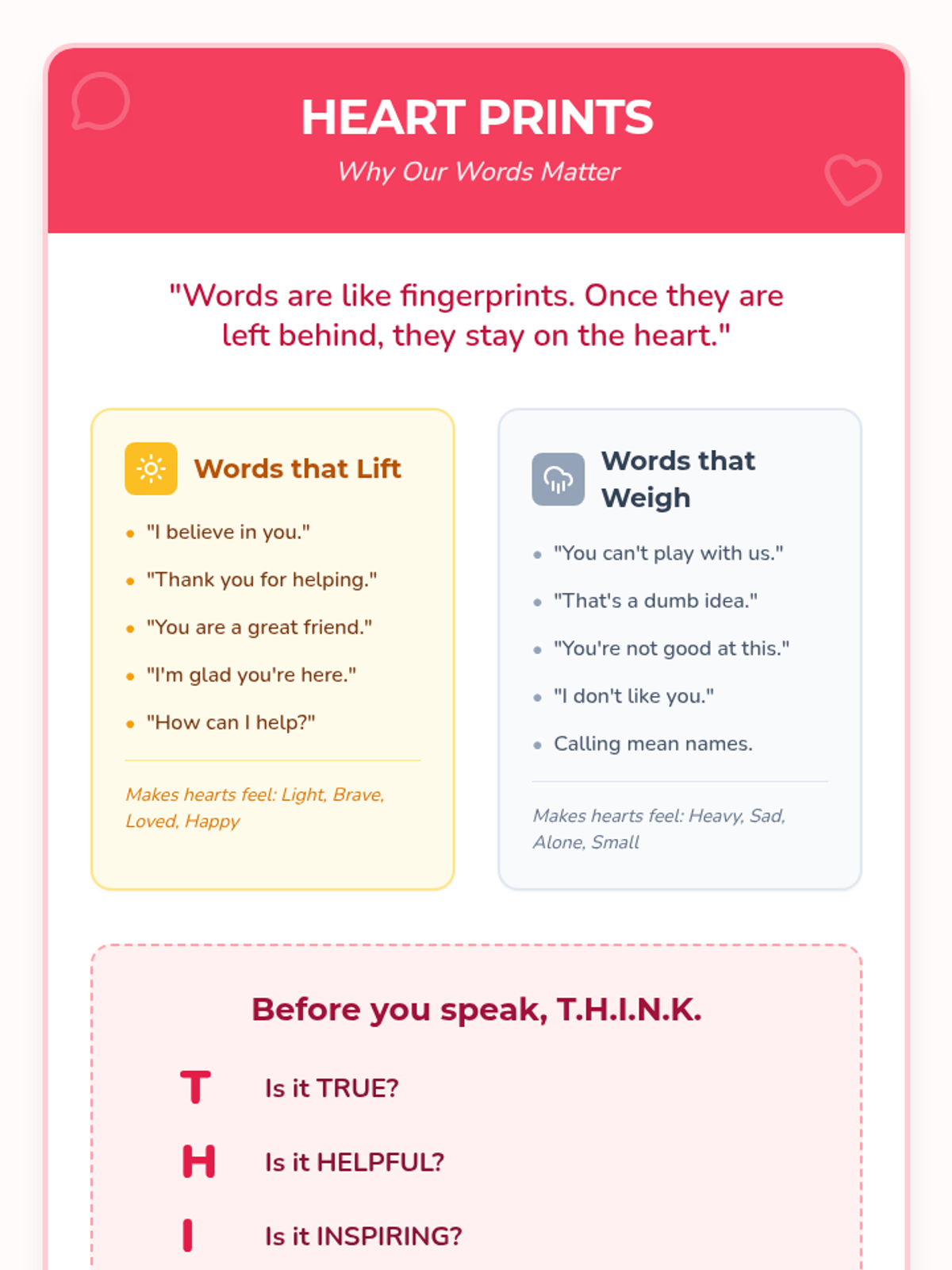 A lesson exploring how the words we choose impact the feelings of others, featuring an anchor chart for the classroom and student reflection activities.