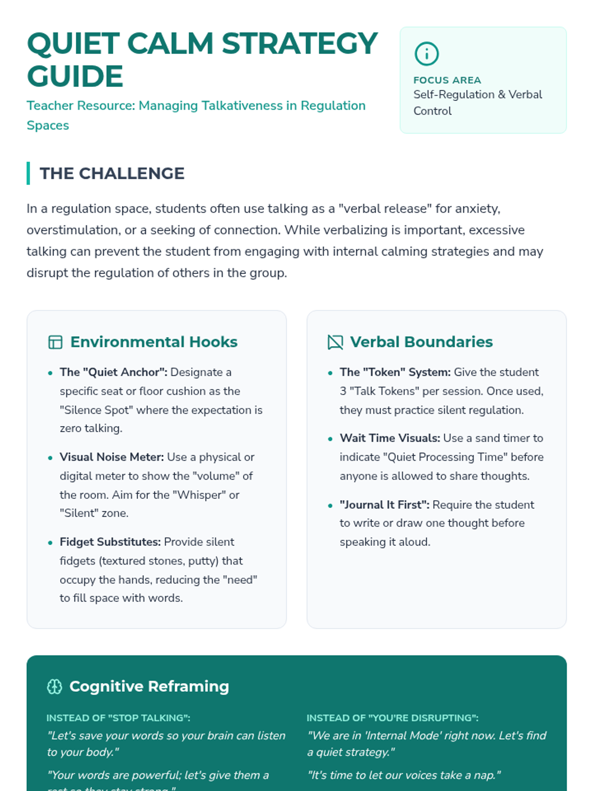 A comprehensive set of strategies and visual tools to help students manage excessive talking while practicing emotional self-regulation in a small group setting.