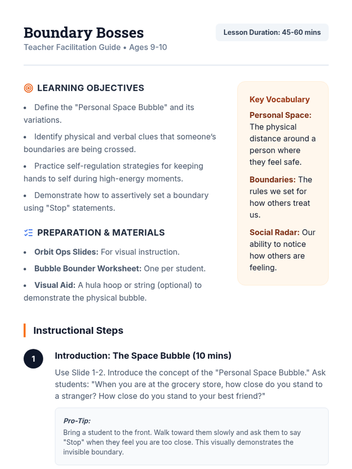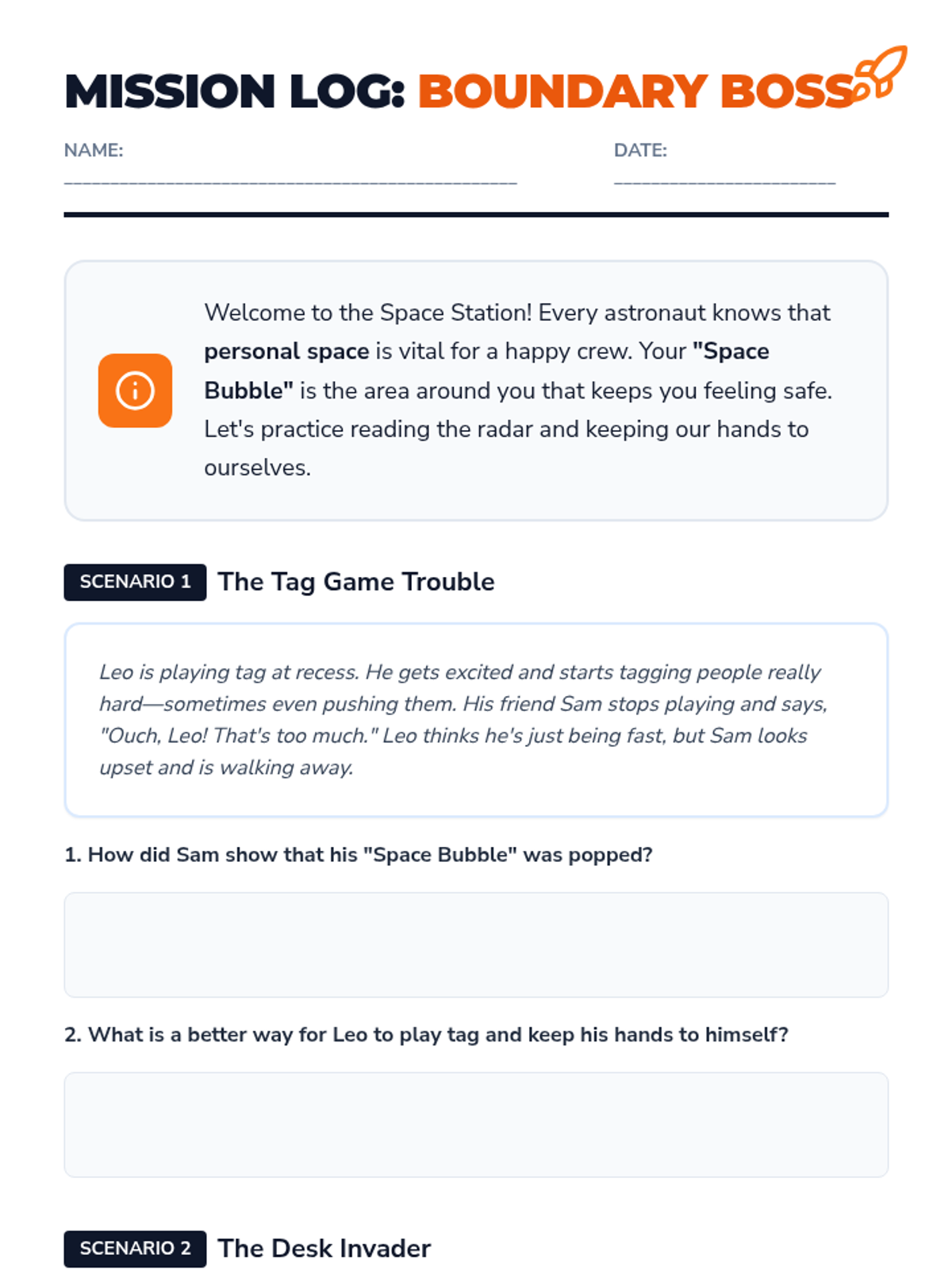 A comprehensive lesson for 9-10 year olds focused on personal boundaries, the importance of physical distance, and strategies for maintaining self-control over one's body. Students explore the 'Personal Space Bubble' through social stories and interactive scenarios.
