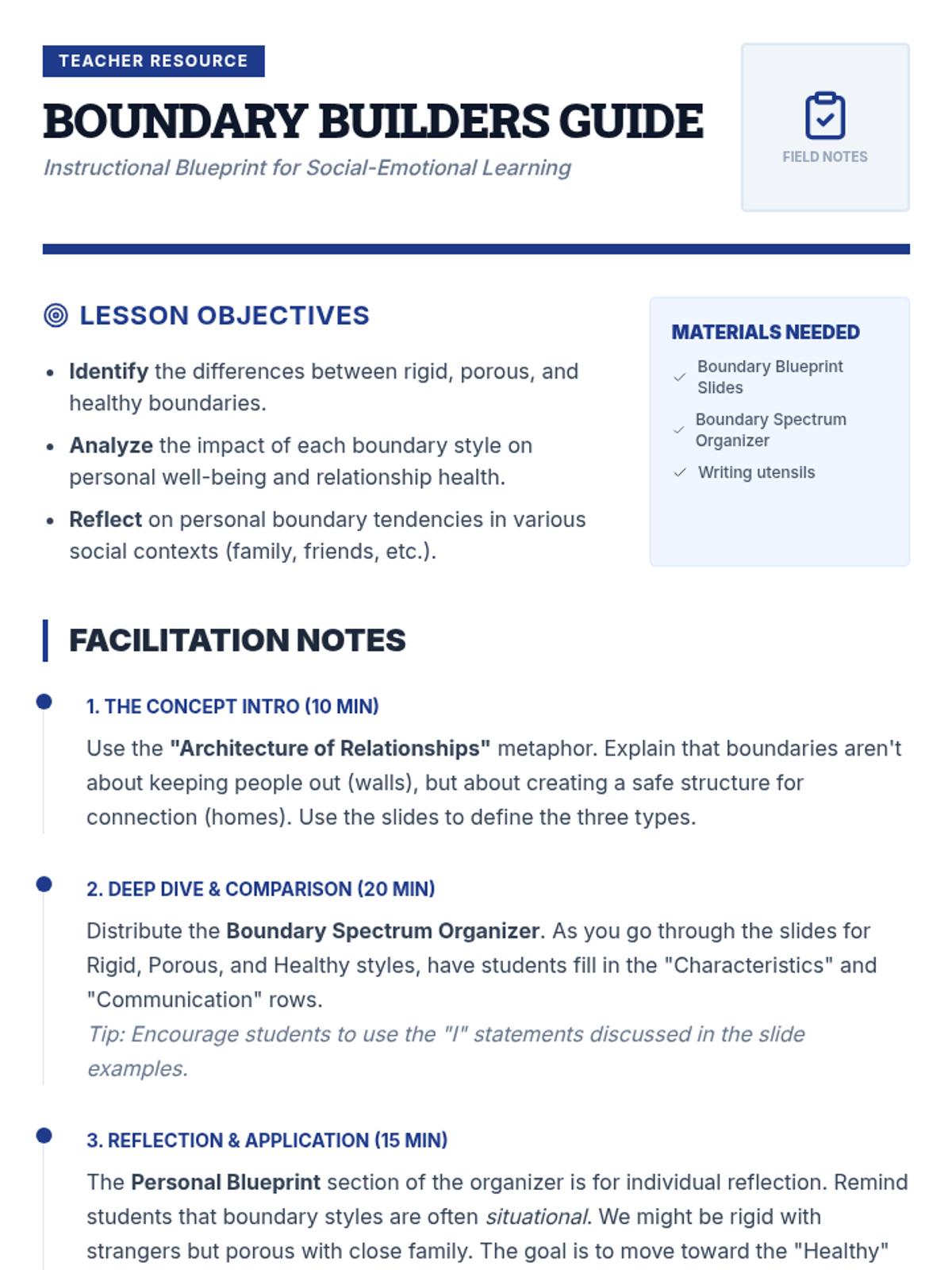 A lesson exploring the spectrum of personal boundaries, helping students identify rigid, porous, and healthy boundary styles in various life situations.